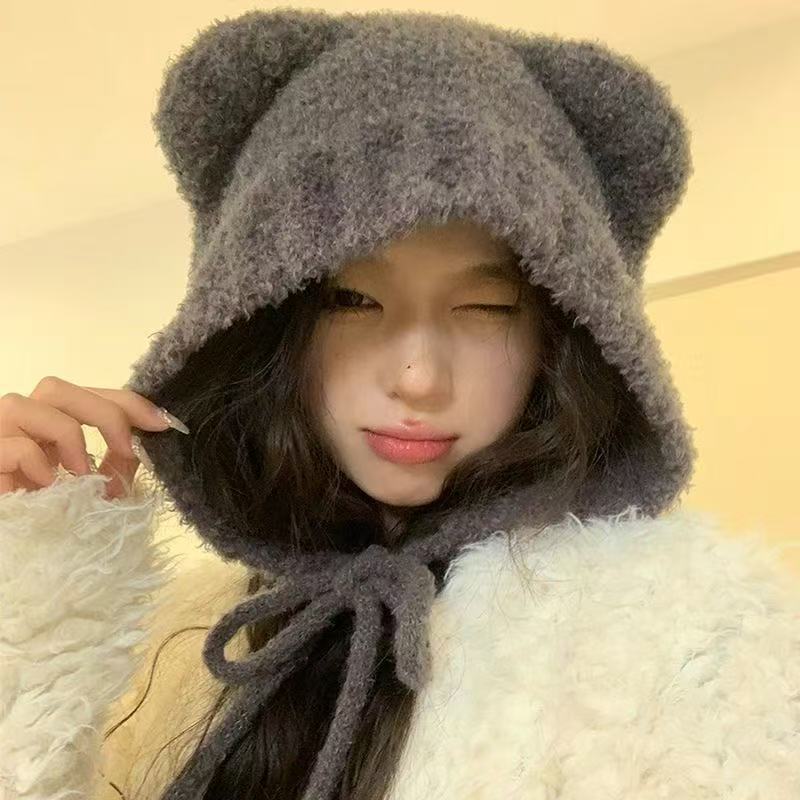 小熊针织帽子可爱毛线毛绒女秋冬季百搭韩版保暖毛绒大头围显脸小