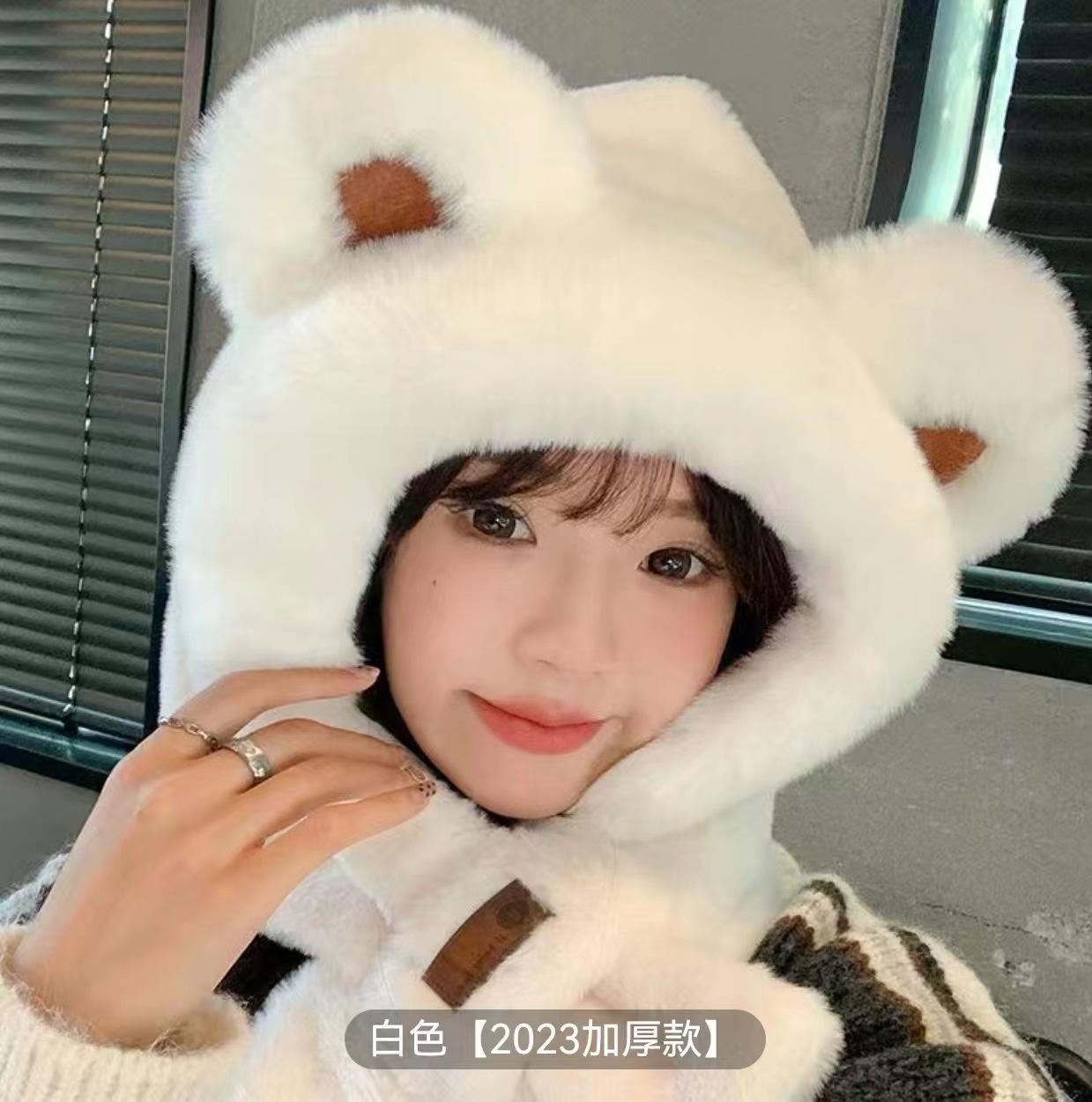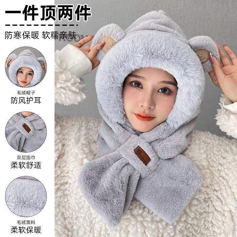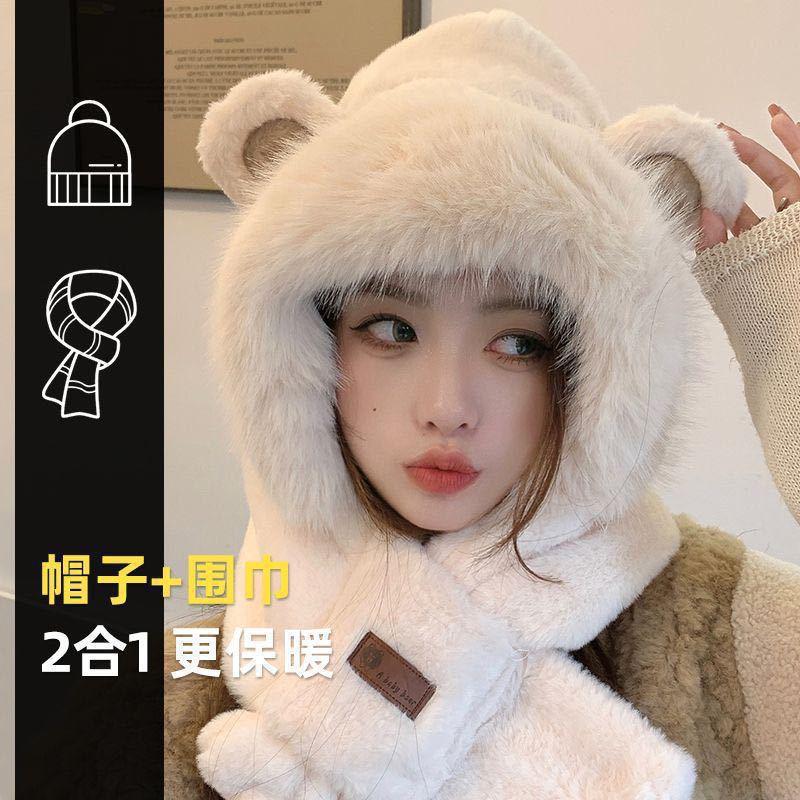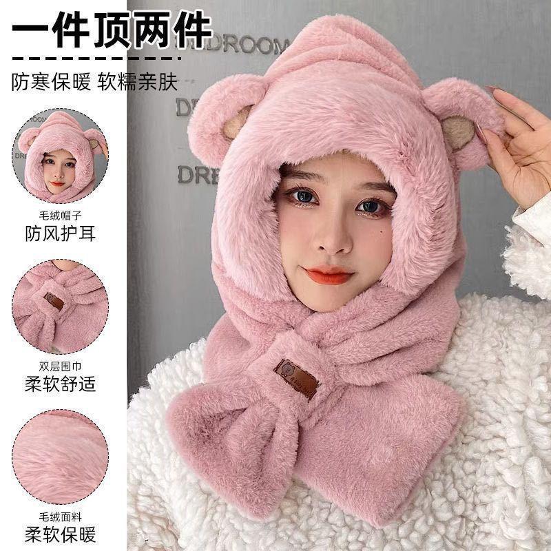 加厚毛绒小熊帽子围巾一体可爱冬季百搭骑车保暖加绒护耳两件套帽