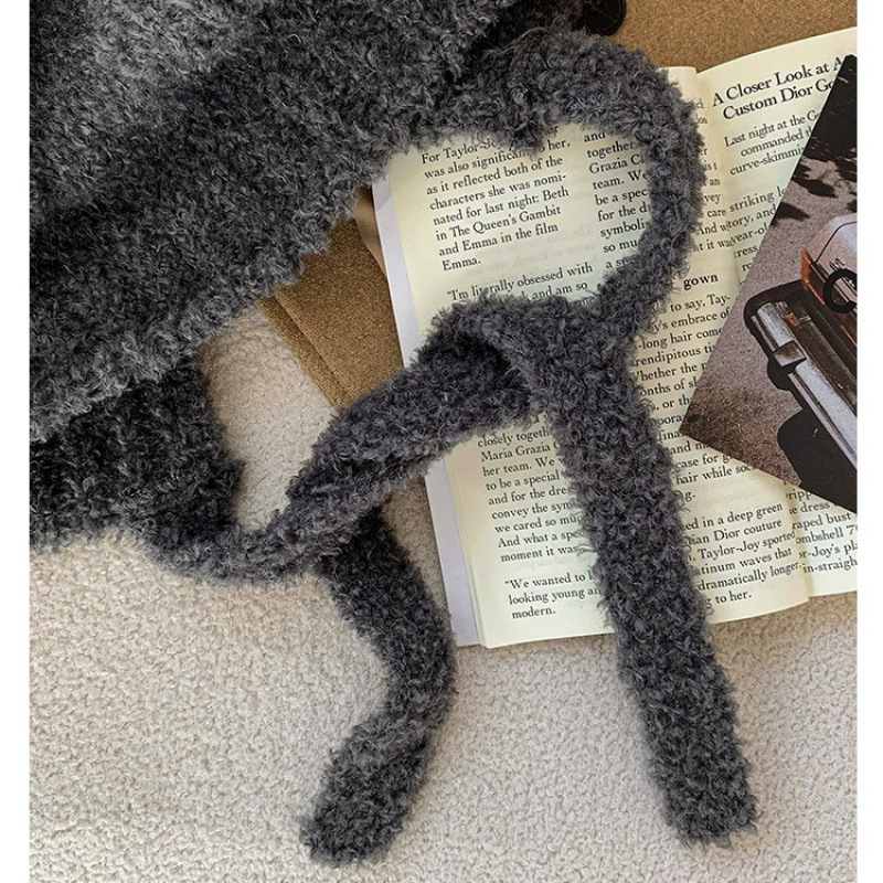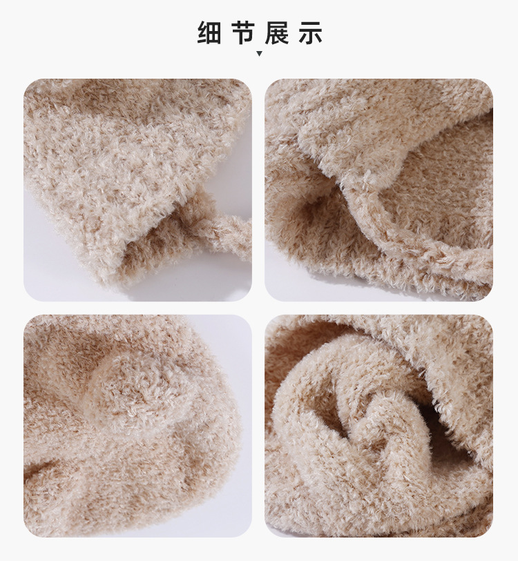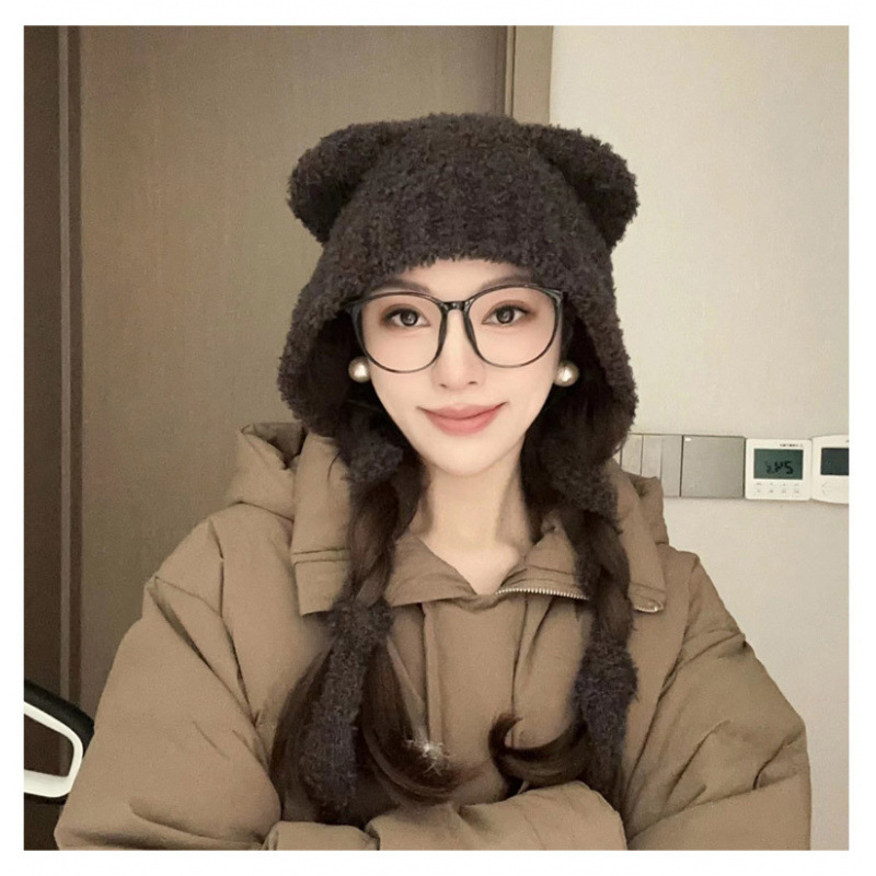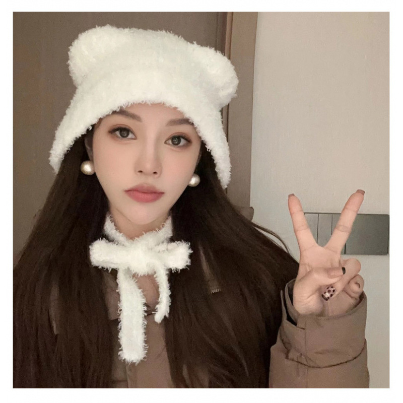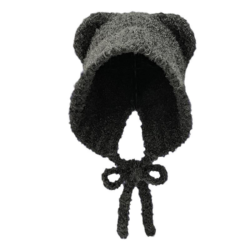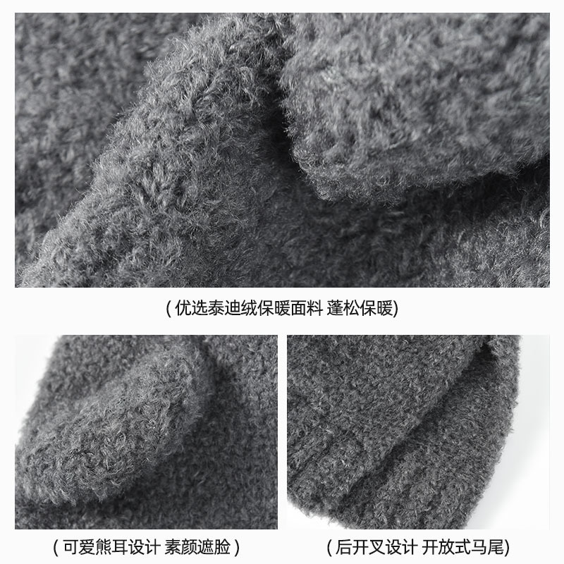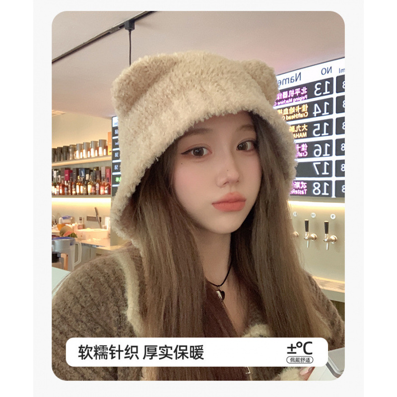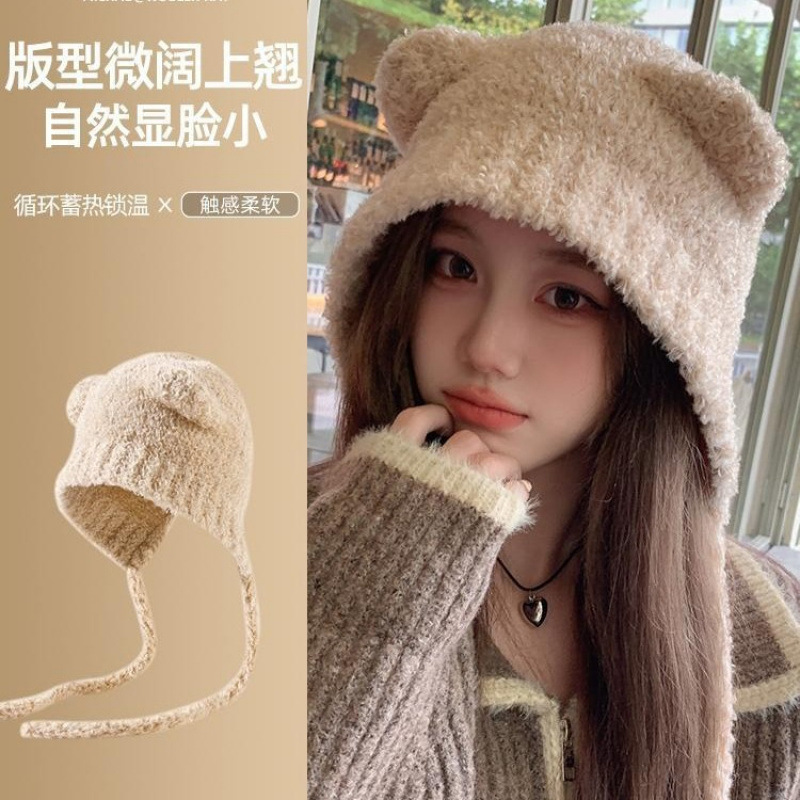 小熊耳朵毛线针织帽子冬季显脸小毛绒可爱护耳保暖绑带套头冷帽女