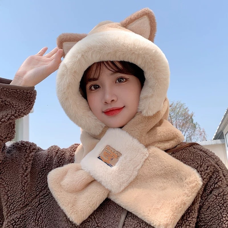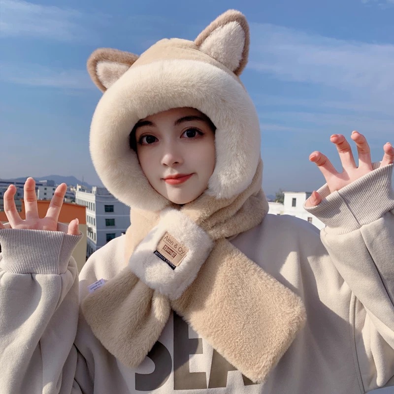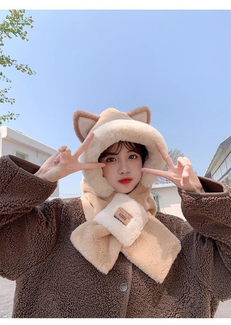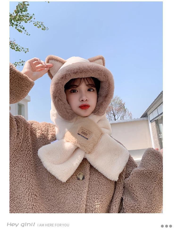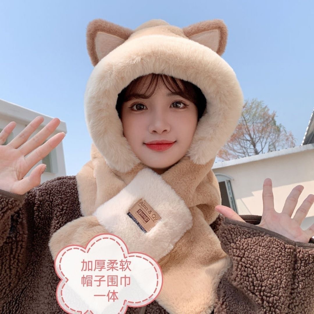 帽子围巾一体女冬季2024新款兔毛绒可爱小熊围脖骑车保暖套头帽子