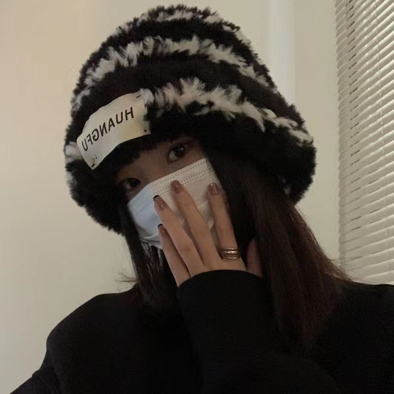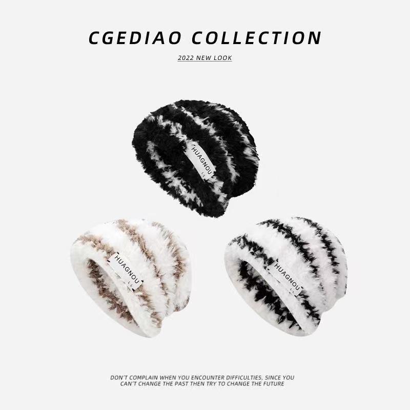 毛线帽子条纹新款女冬季针织显脸小毛绒保暖加厚大头围护耳堆堆帽