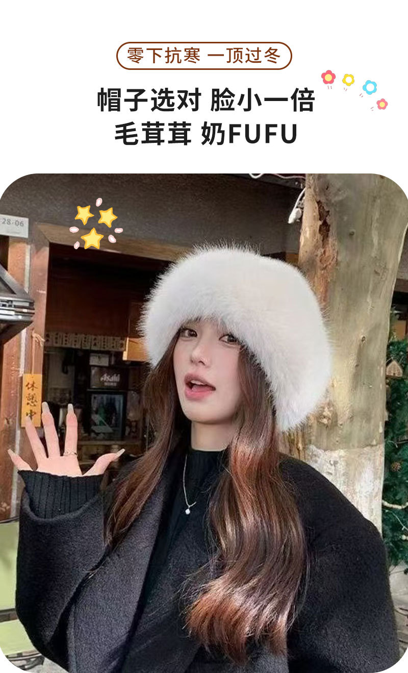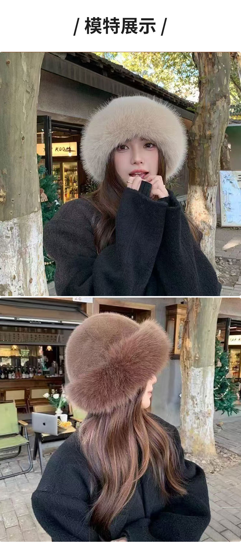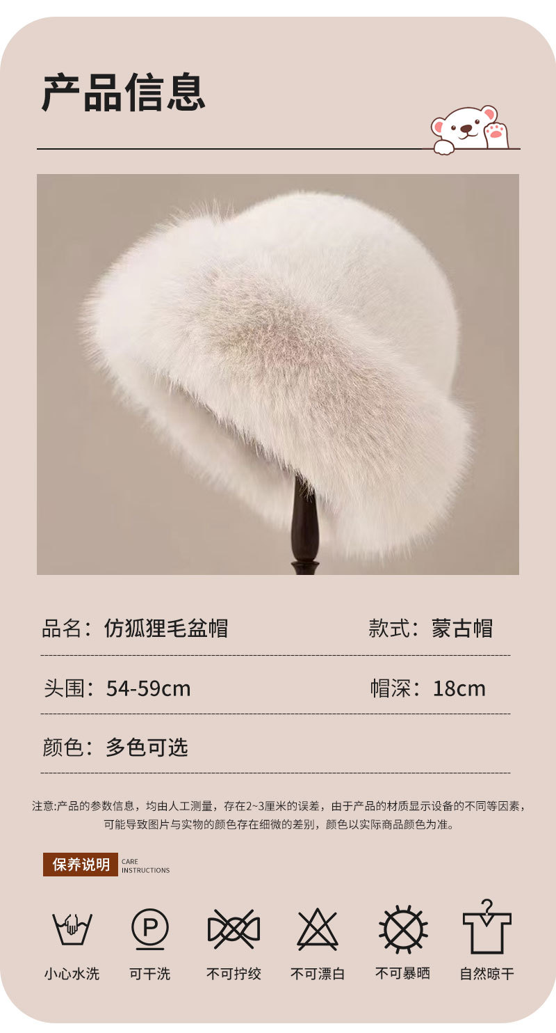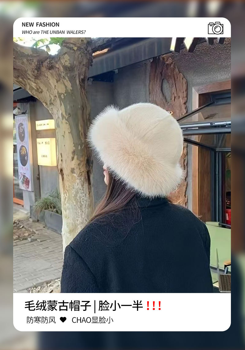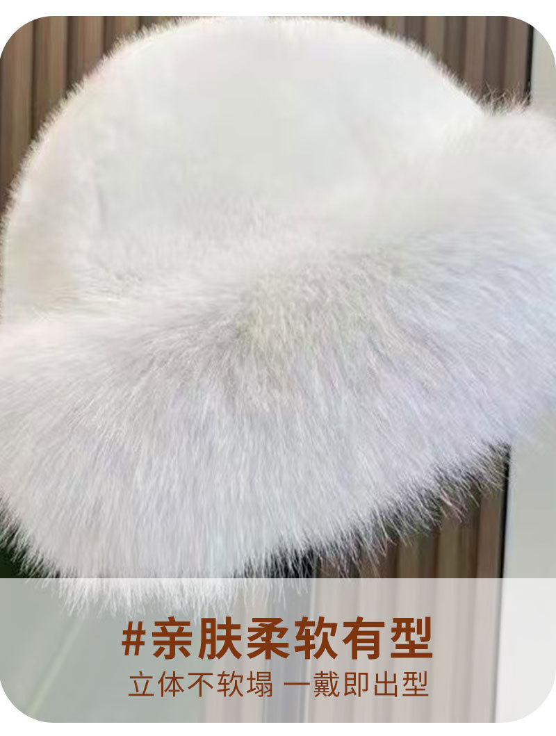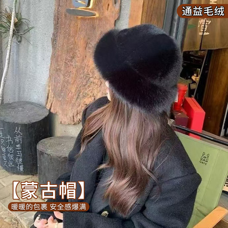 毛绒大帽檐蒙古帽子女士秋冬防寒白色保暖东北盆帽狐狸毛渔夫帽