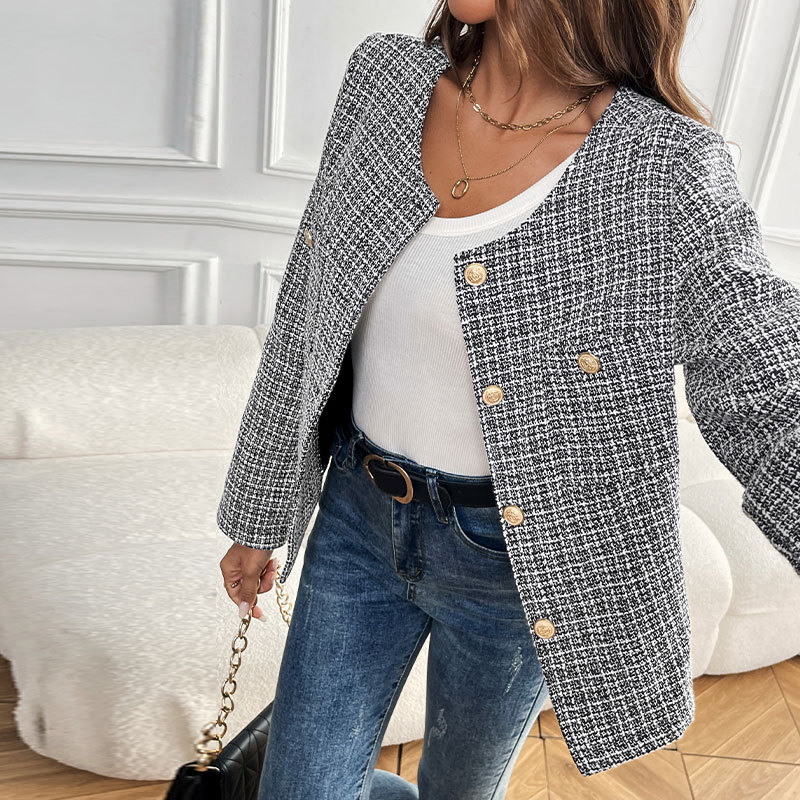 亚马逊2025新款秋冬跨境优雅小香风宽松金属纽扣单排扣格纹外套女