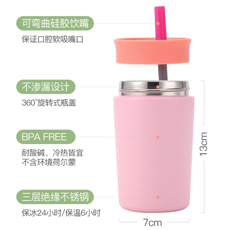 跨境新款儿童硅胶吸管杯欧瓦拉同款咖啡杯小容量12oz不锈钢保温杯