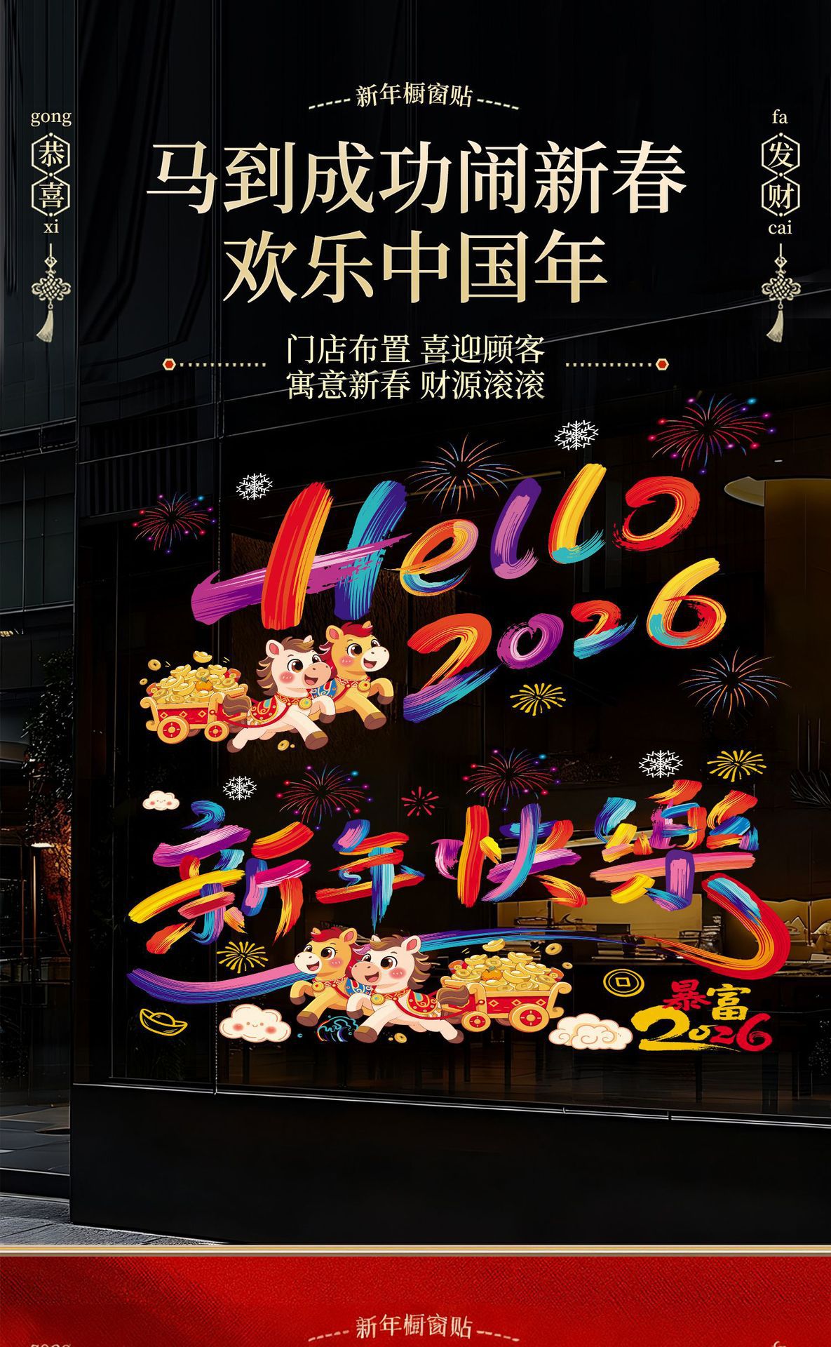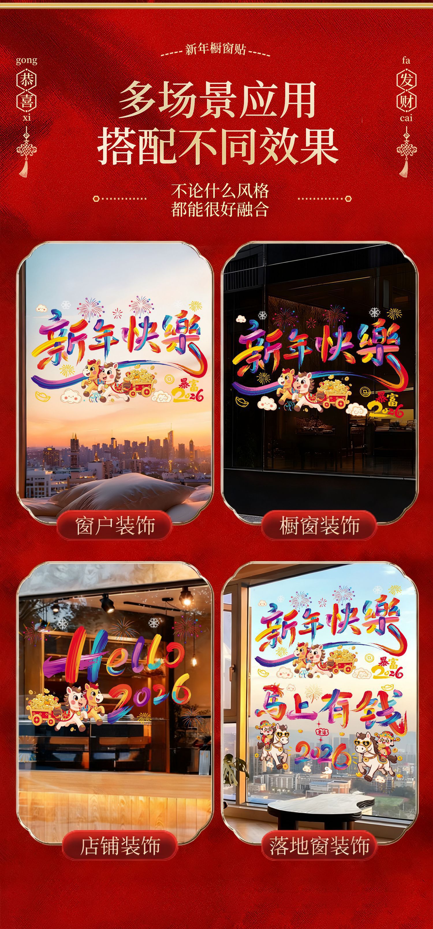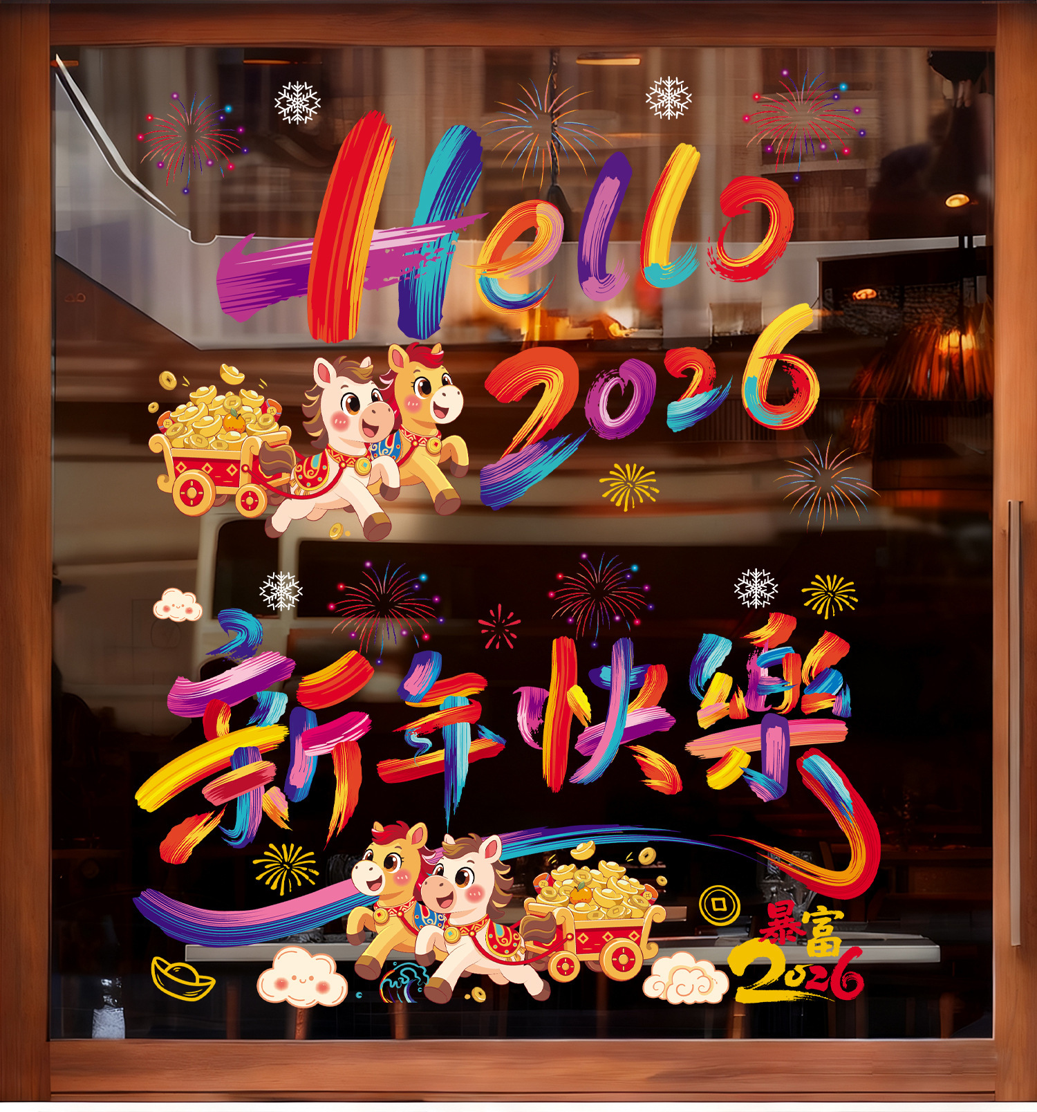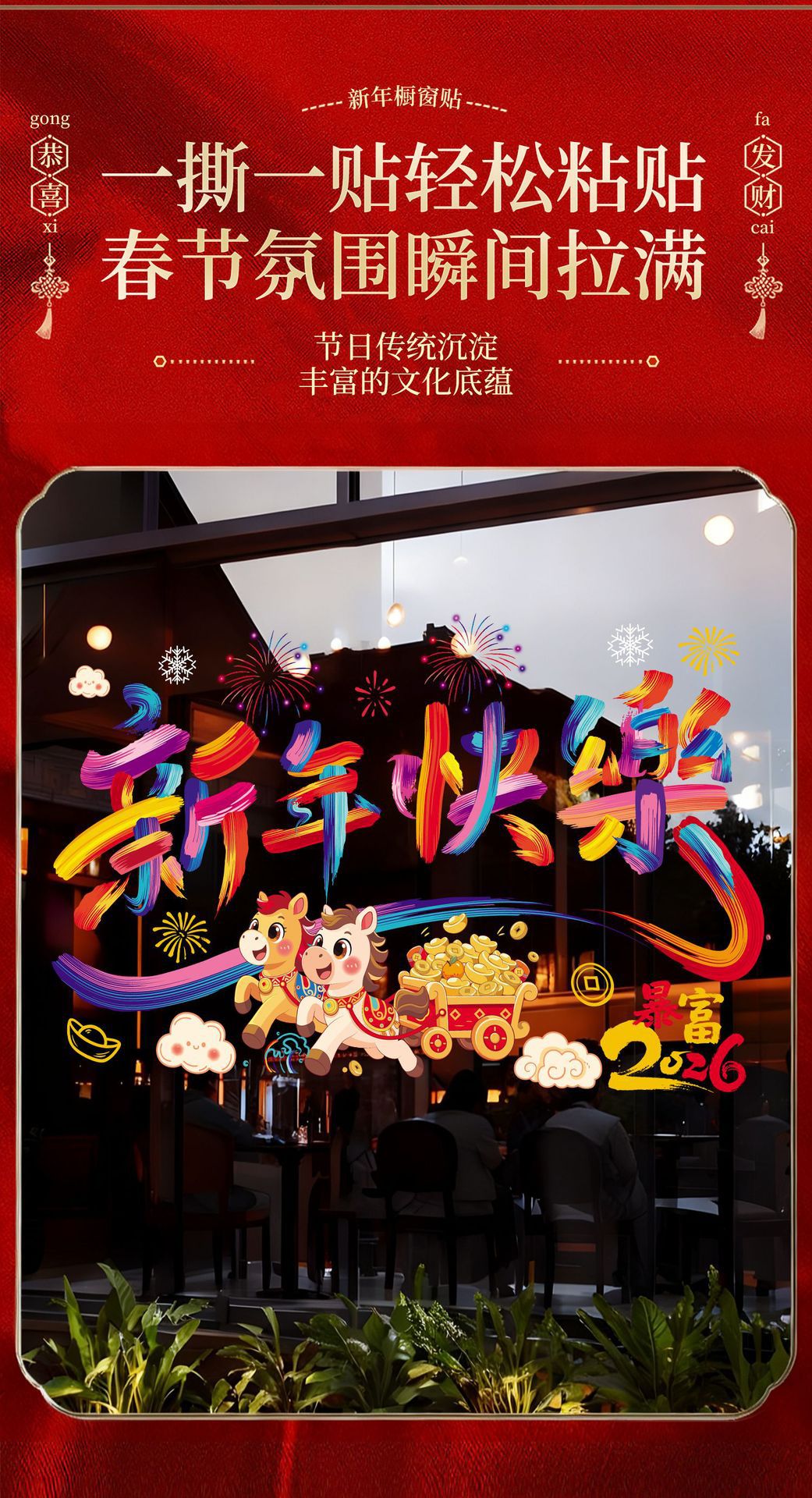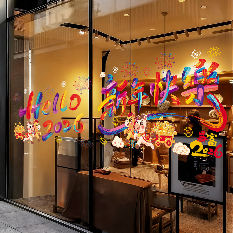 新款2026新年快乐玻璃静电贴马年教室商场布置窗户门元旦装饰贴画