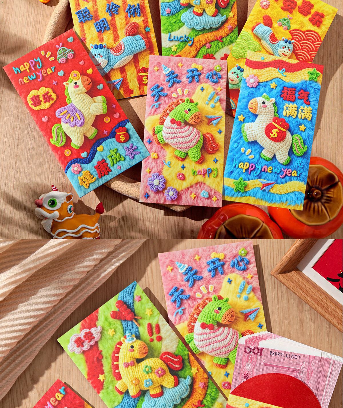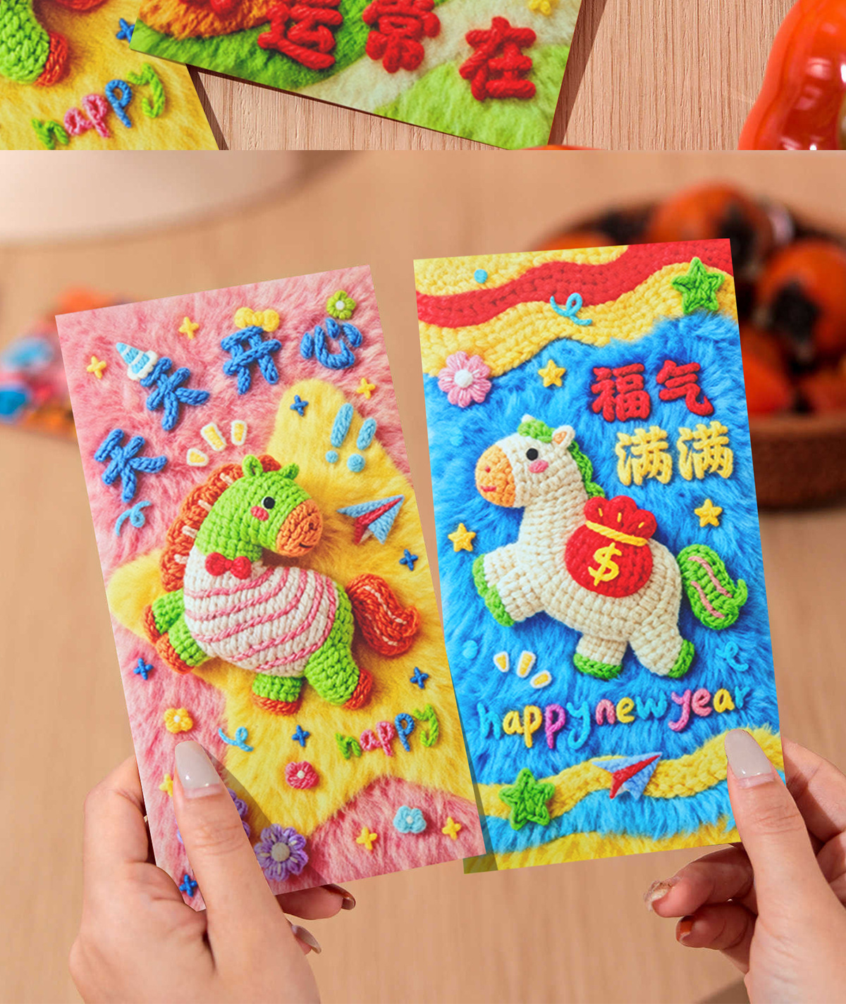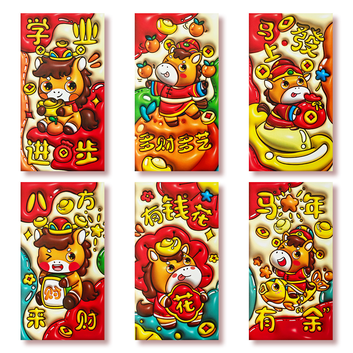 抖音爆款2026马年5D平面毛绒刺绣风格可爱卡通Q版春节利是封红包