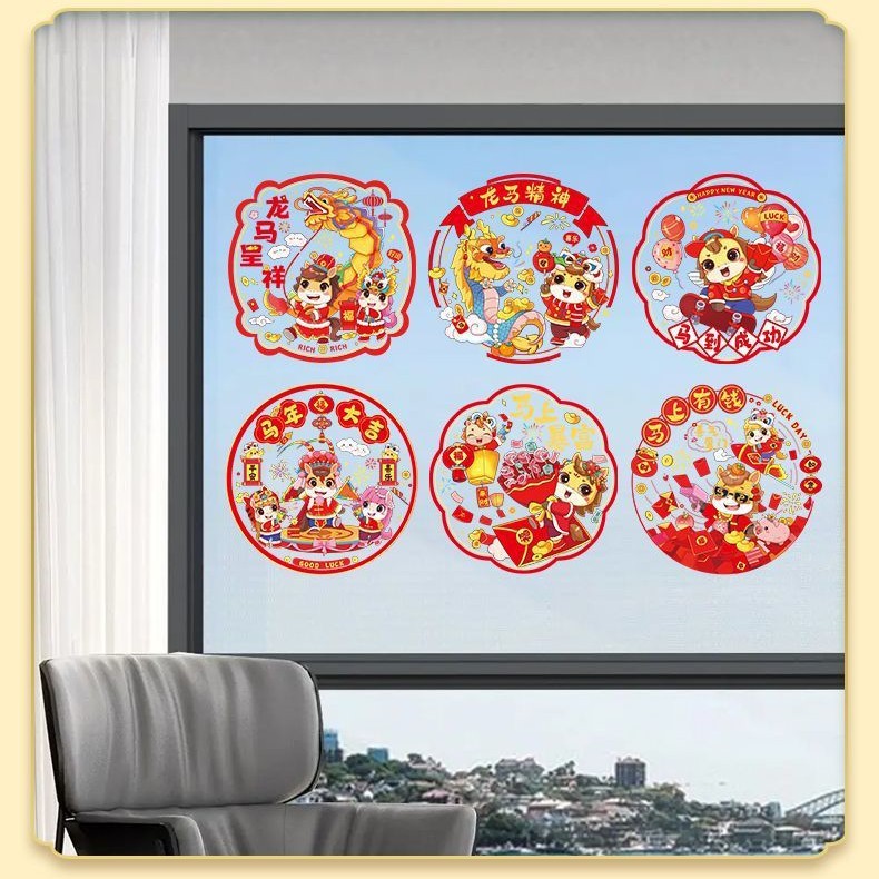 2026马年新年快乐玻璃装饰贴纸春节元旦商铺橱窗毛绒窗花静电贴