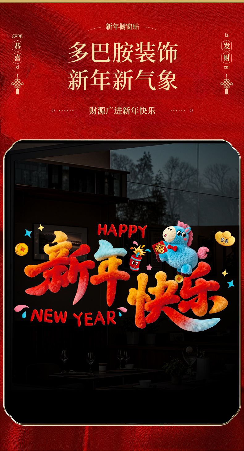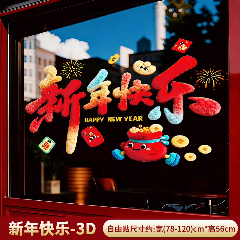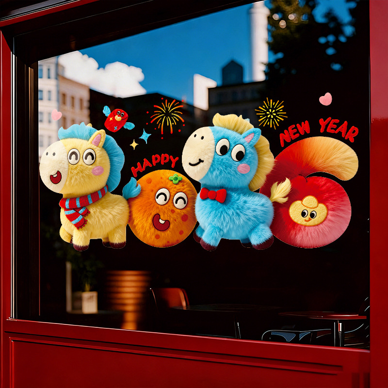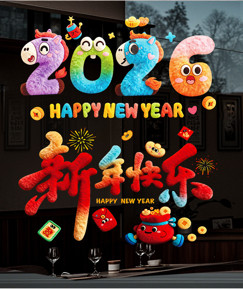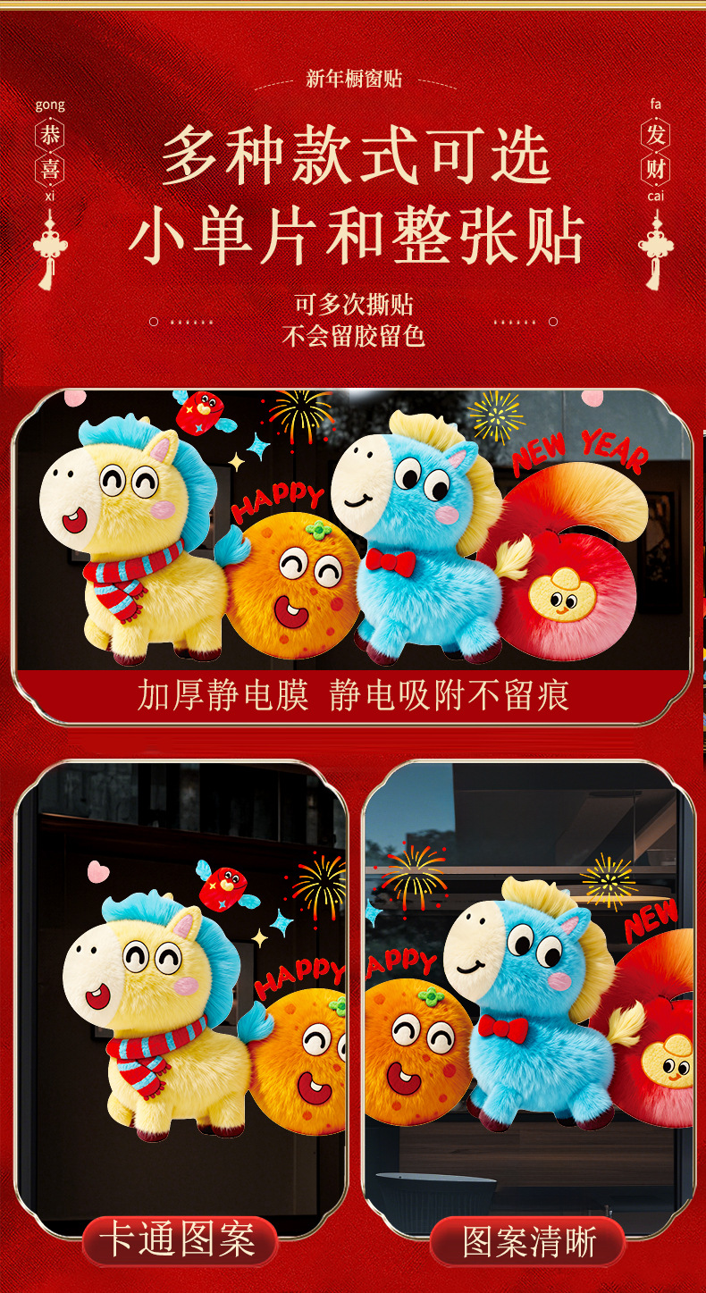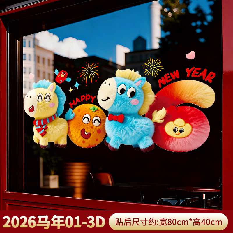 2026马年新年装饰品过年贴纸窗花5D毛绒玻璃贴静电贴橱窗元旦布置