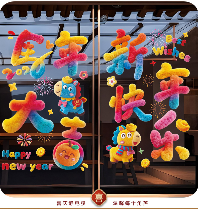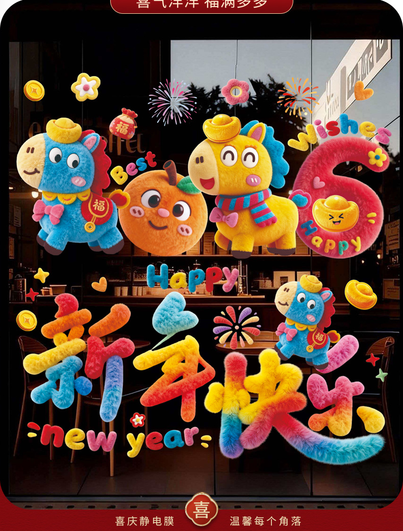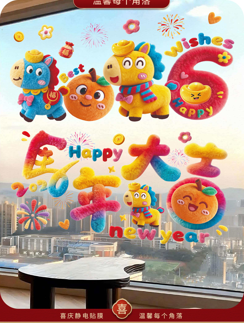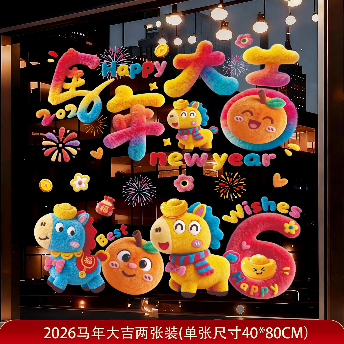 5D新年窗贴玻璃贴纸马年快乐2026年元旦门贴静电贴橱窗氛围贴画