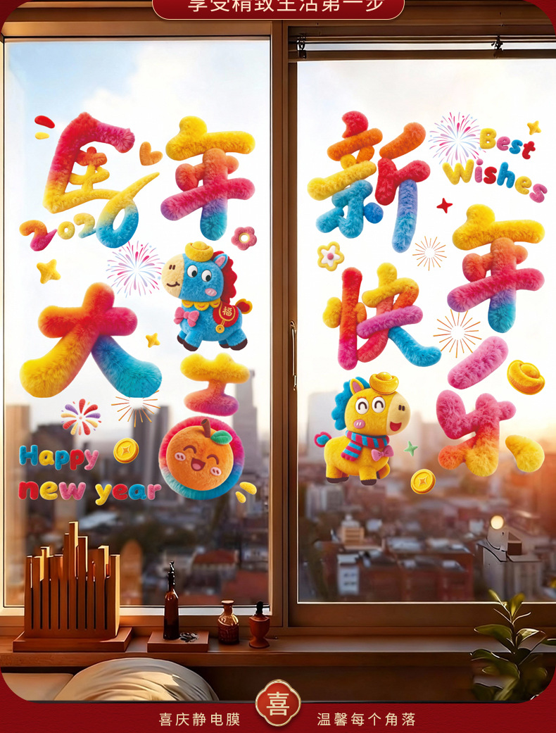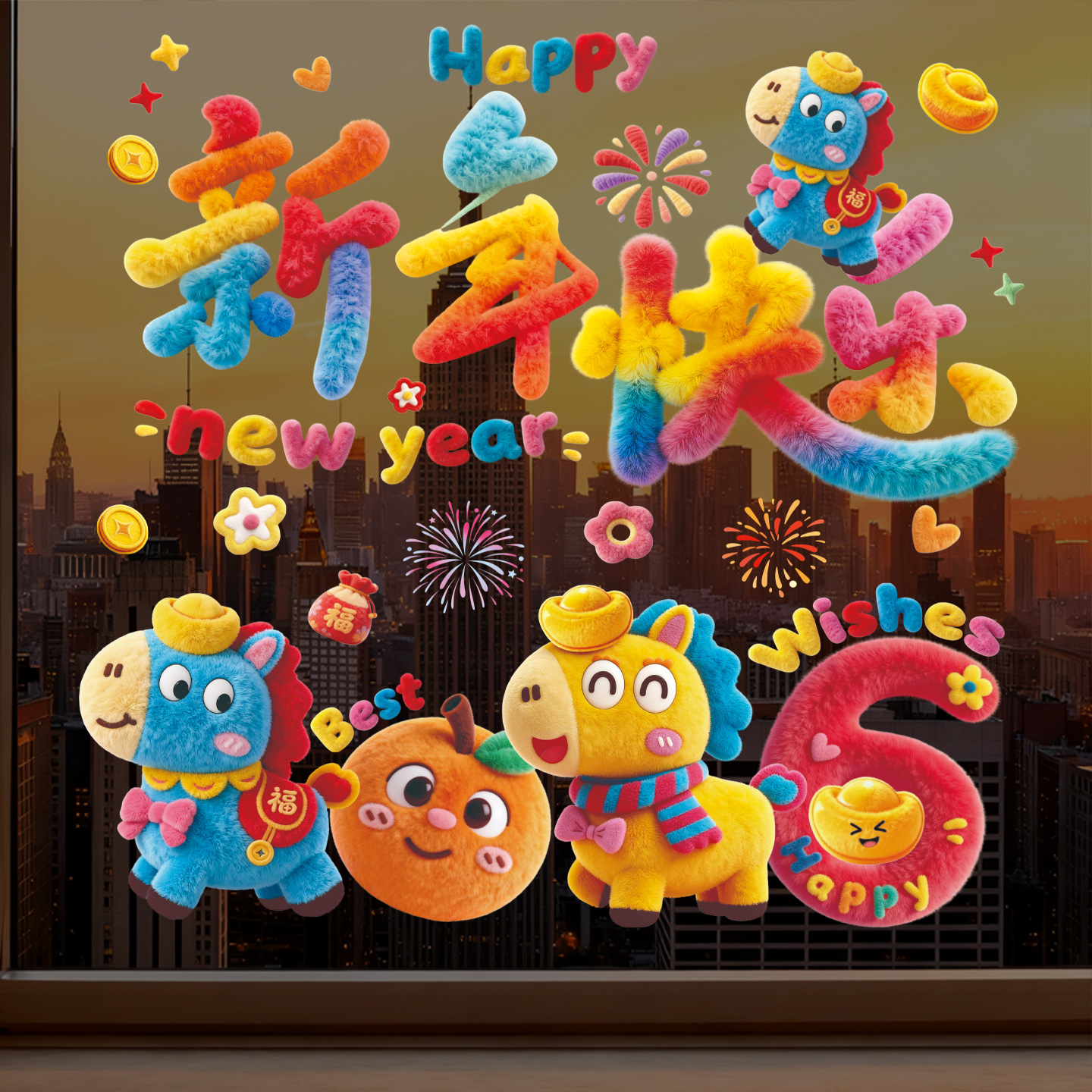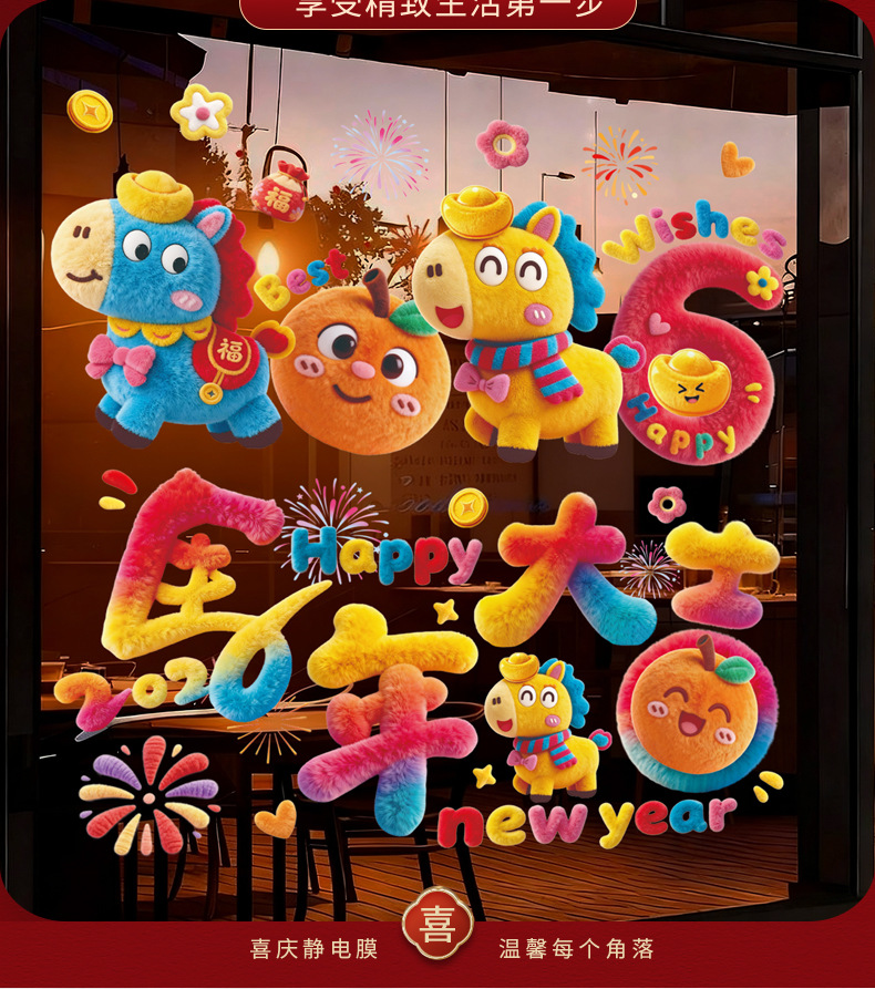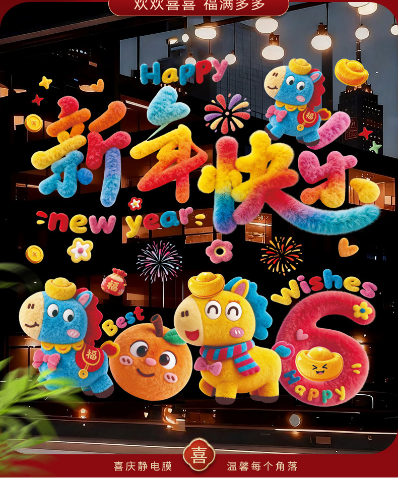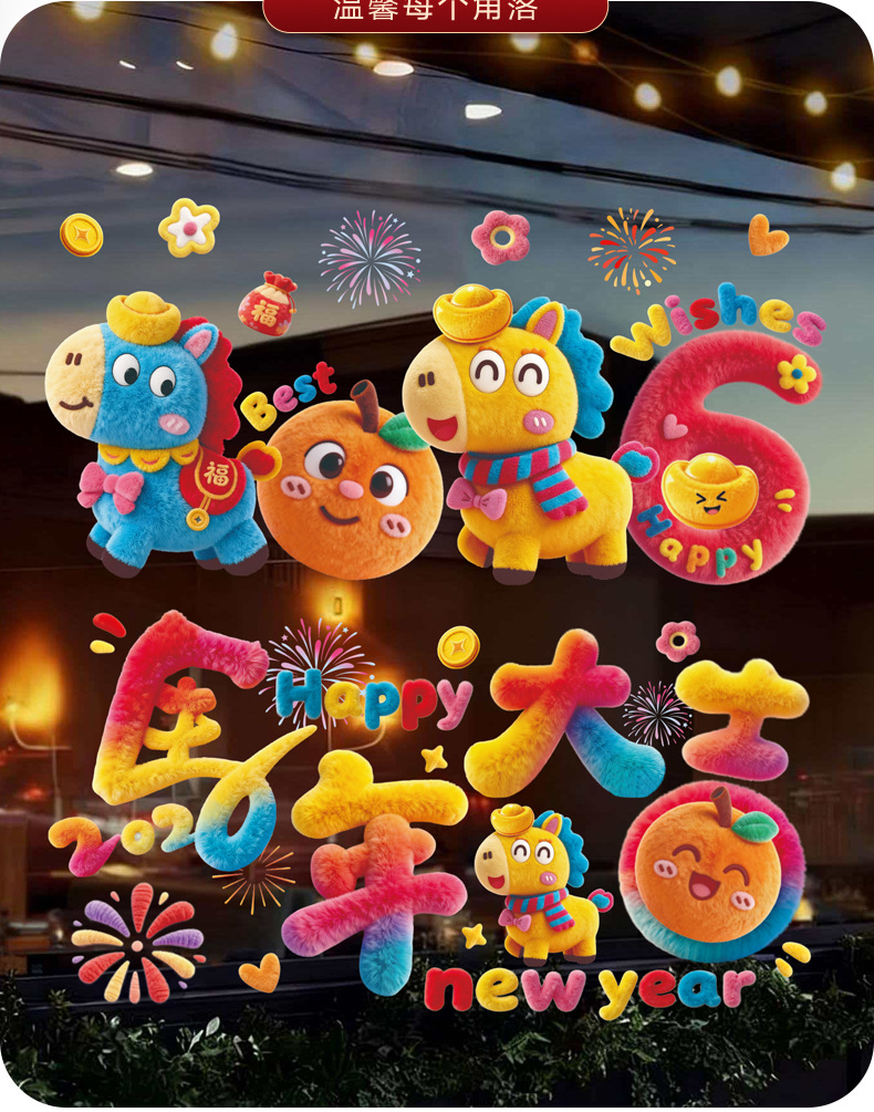 5D新年窗贴玻璃贴纸马年快乐2026年元旦门贴静电贴橱窗氛围贴画