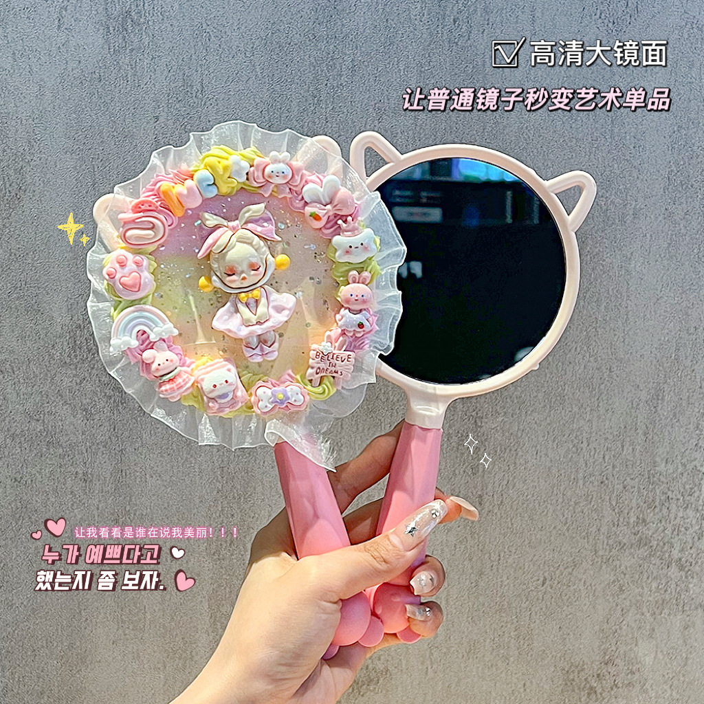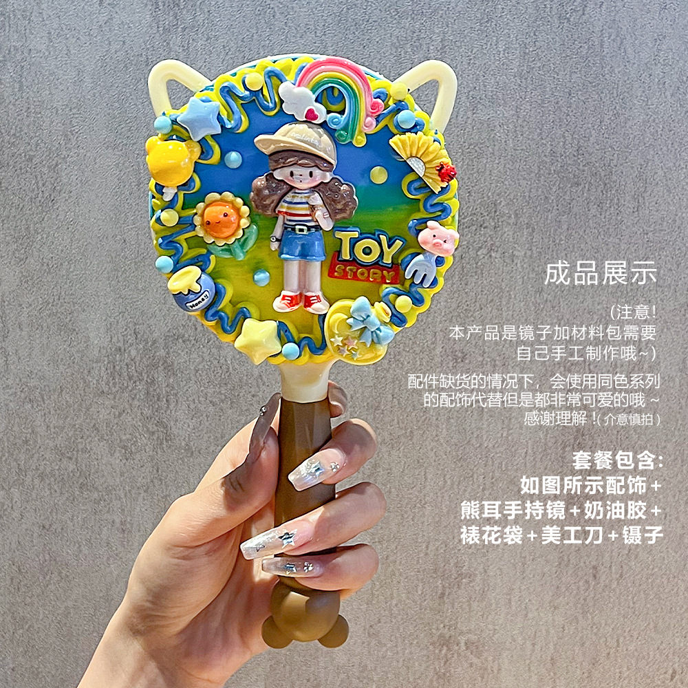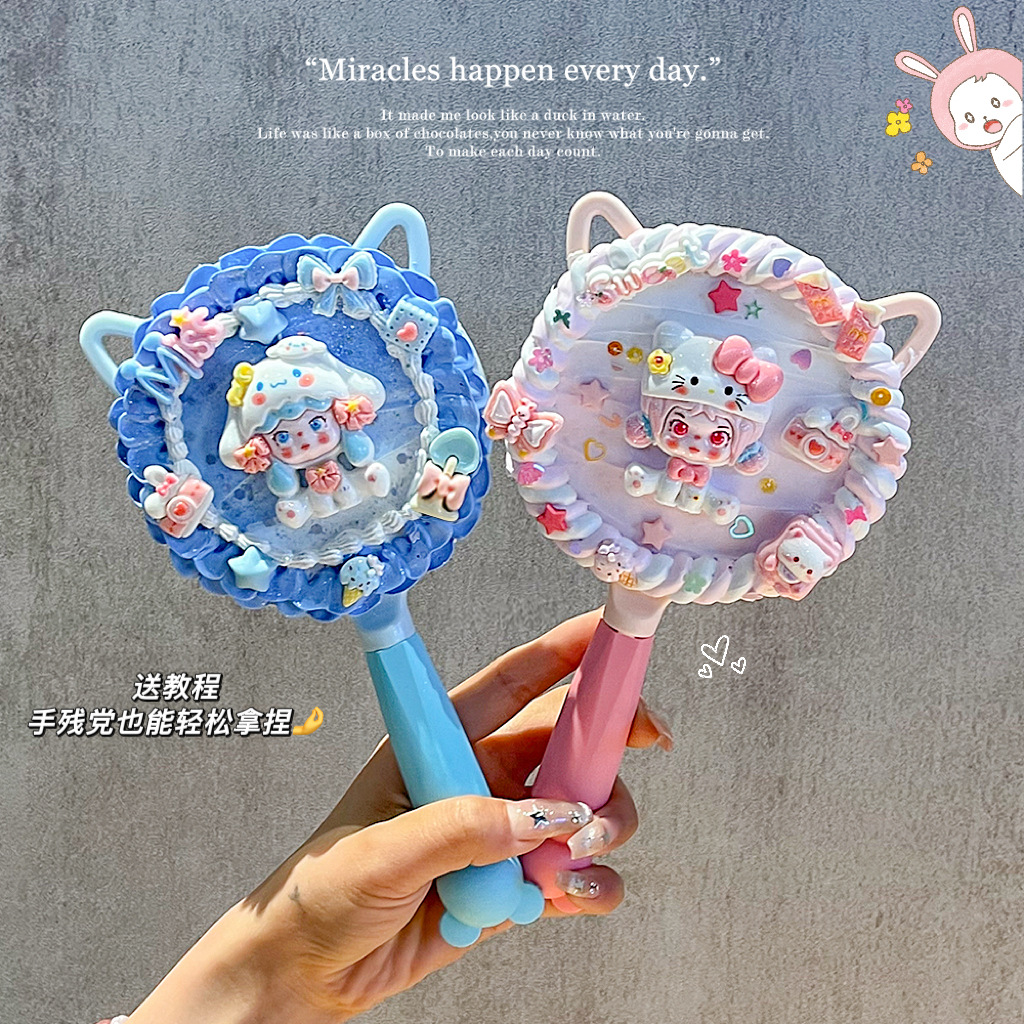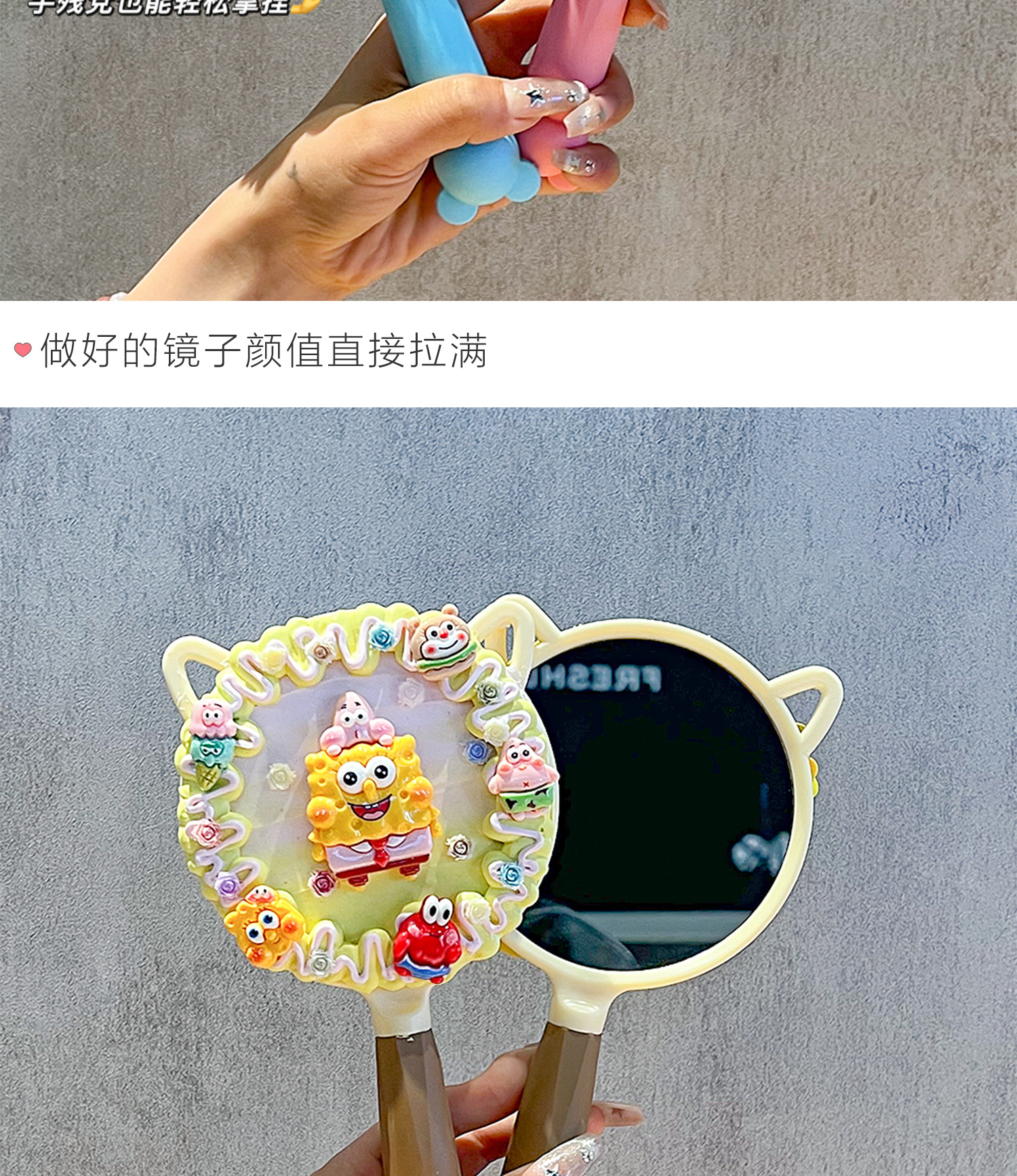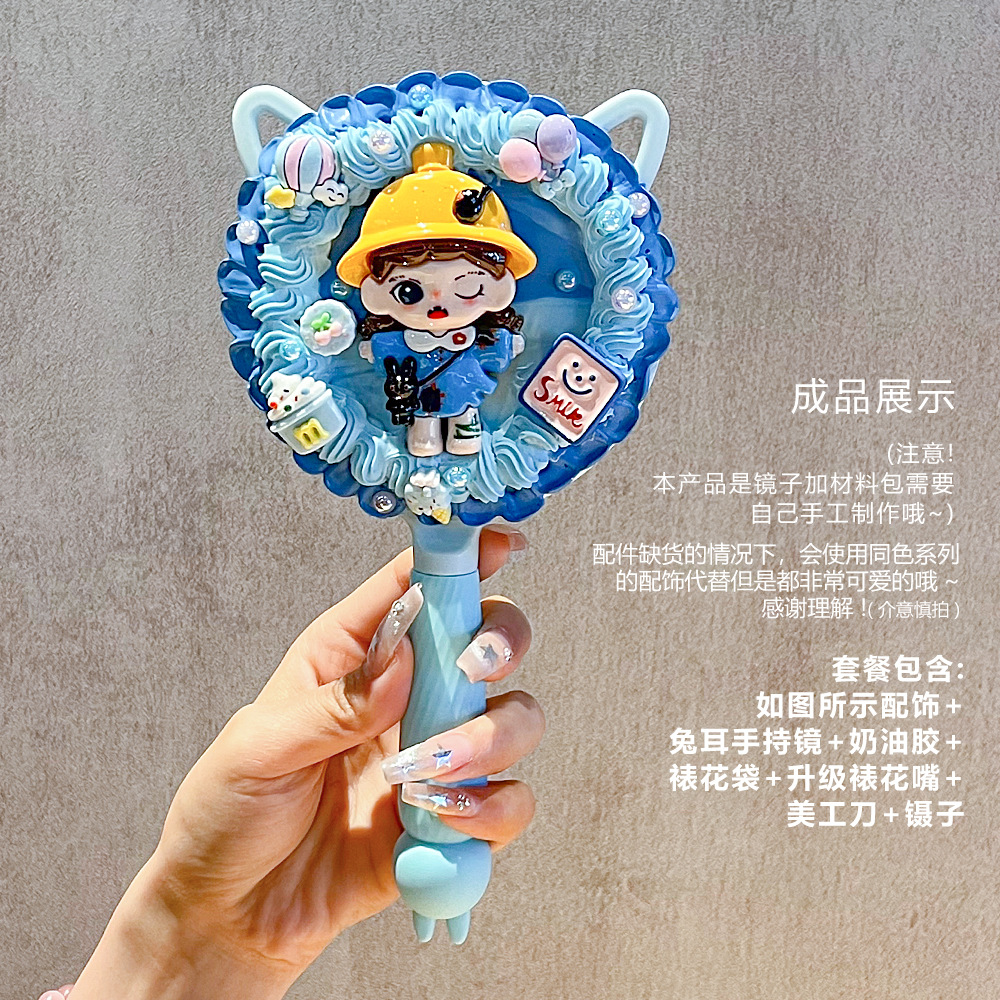 小女生奶油胶手工diy猫耳长柄手持化妆镜子海绵宝宝派大星材料包