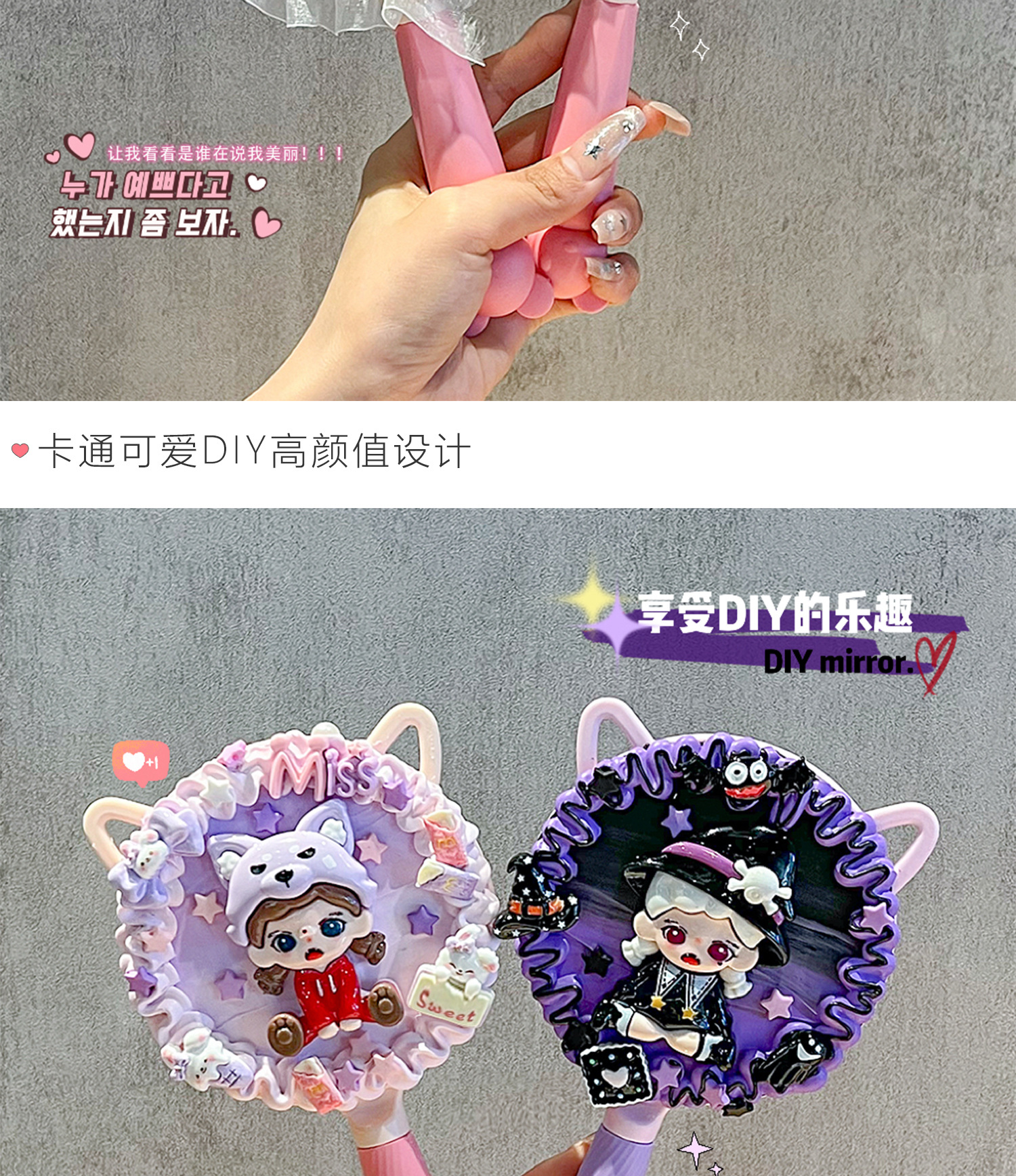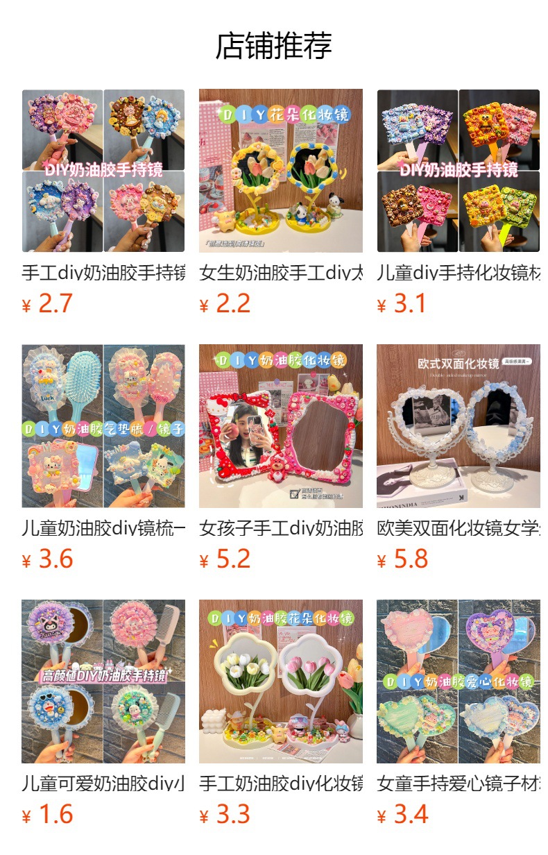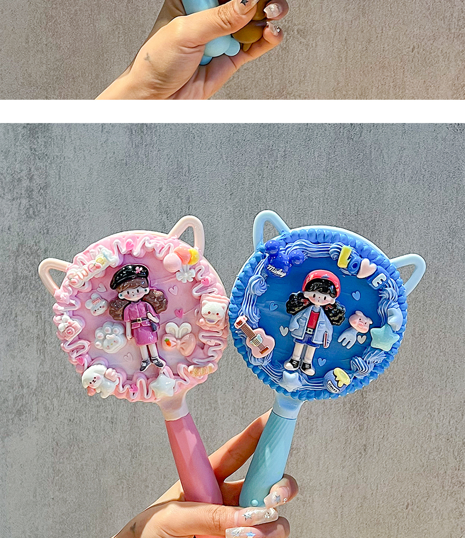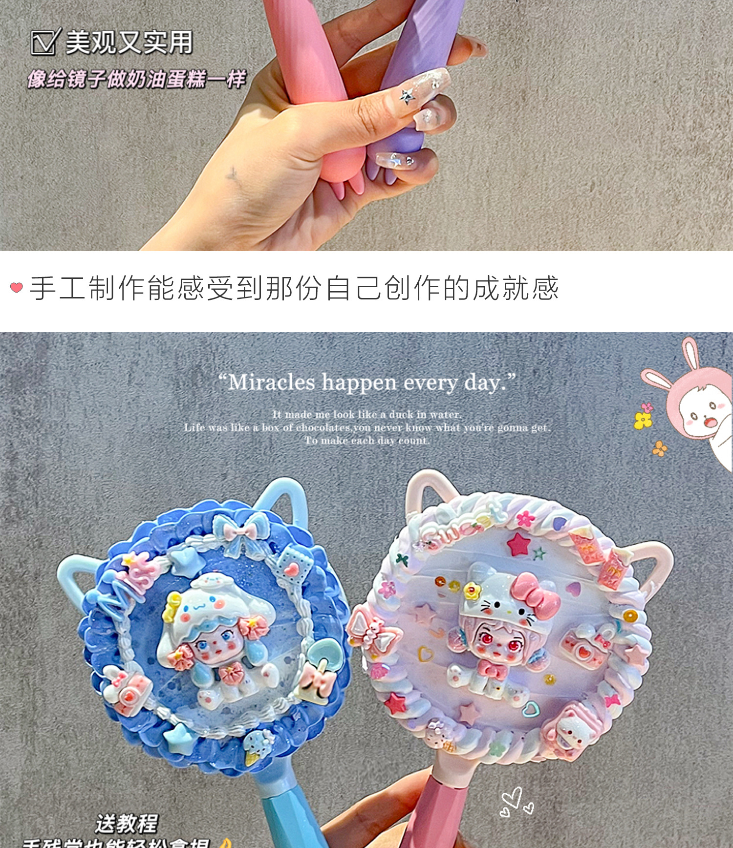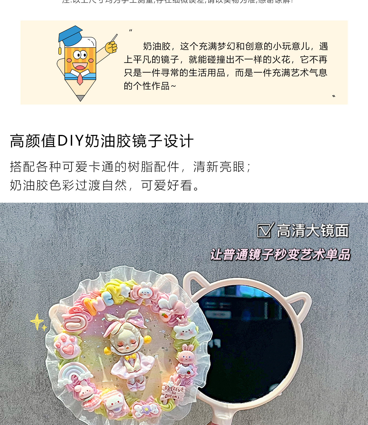 小女生奶油胶手工diy猫耳长柄手持化妆镜子海绵宝宝派大星材料包