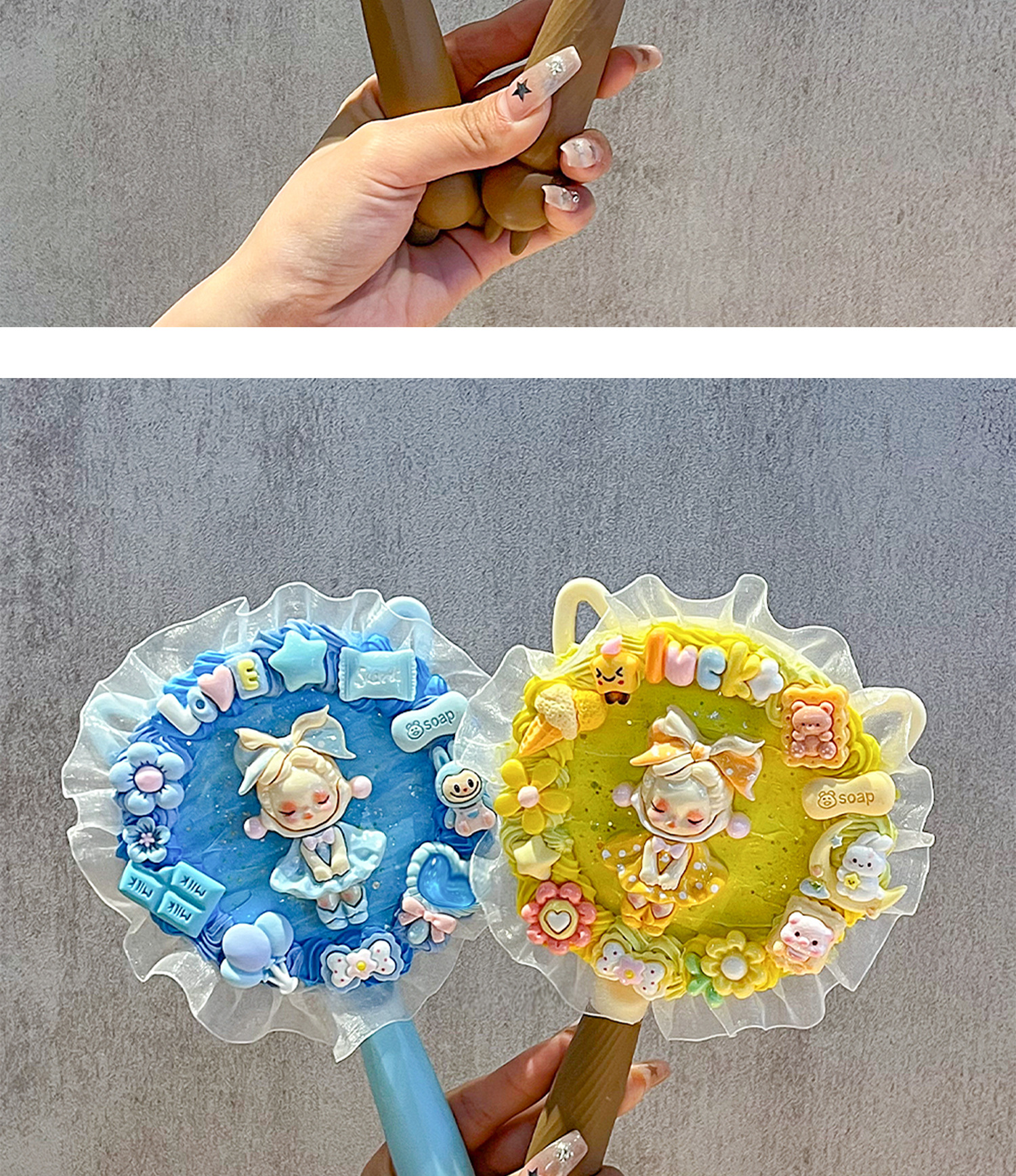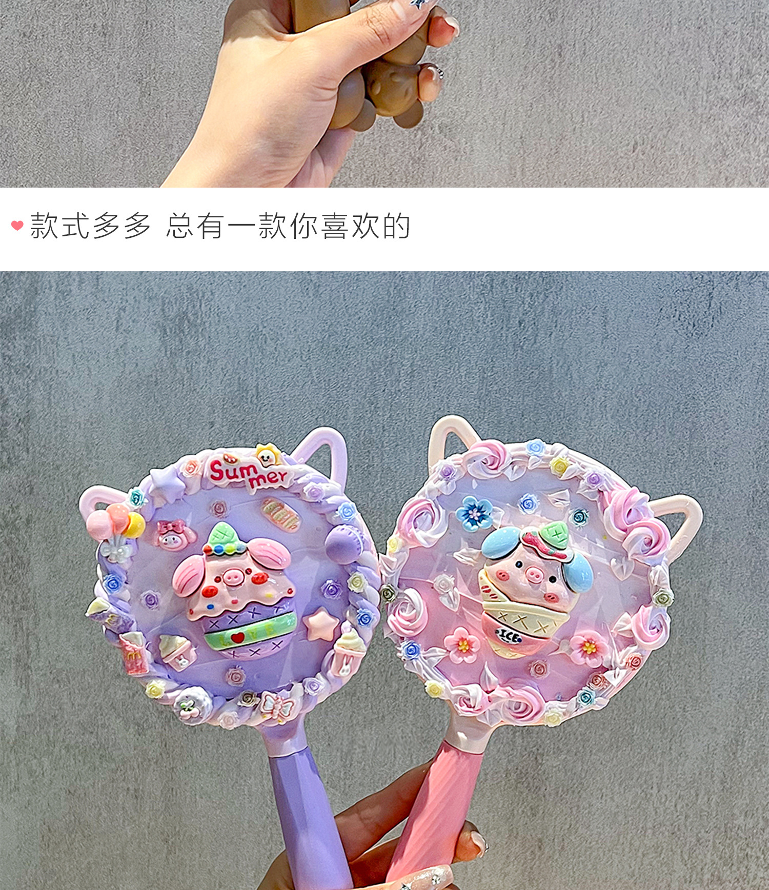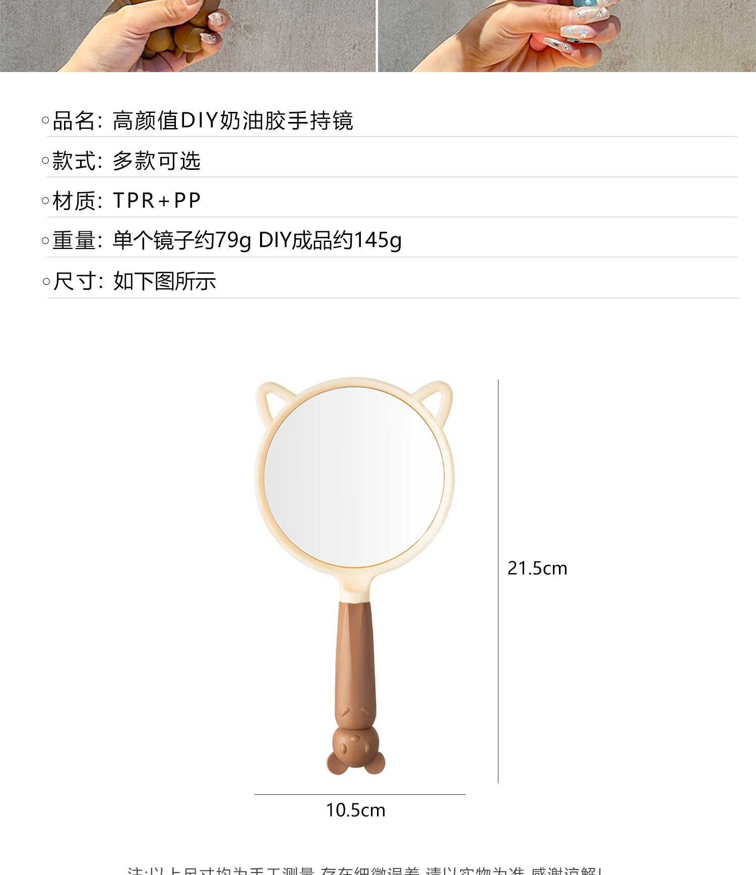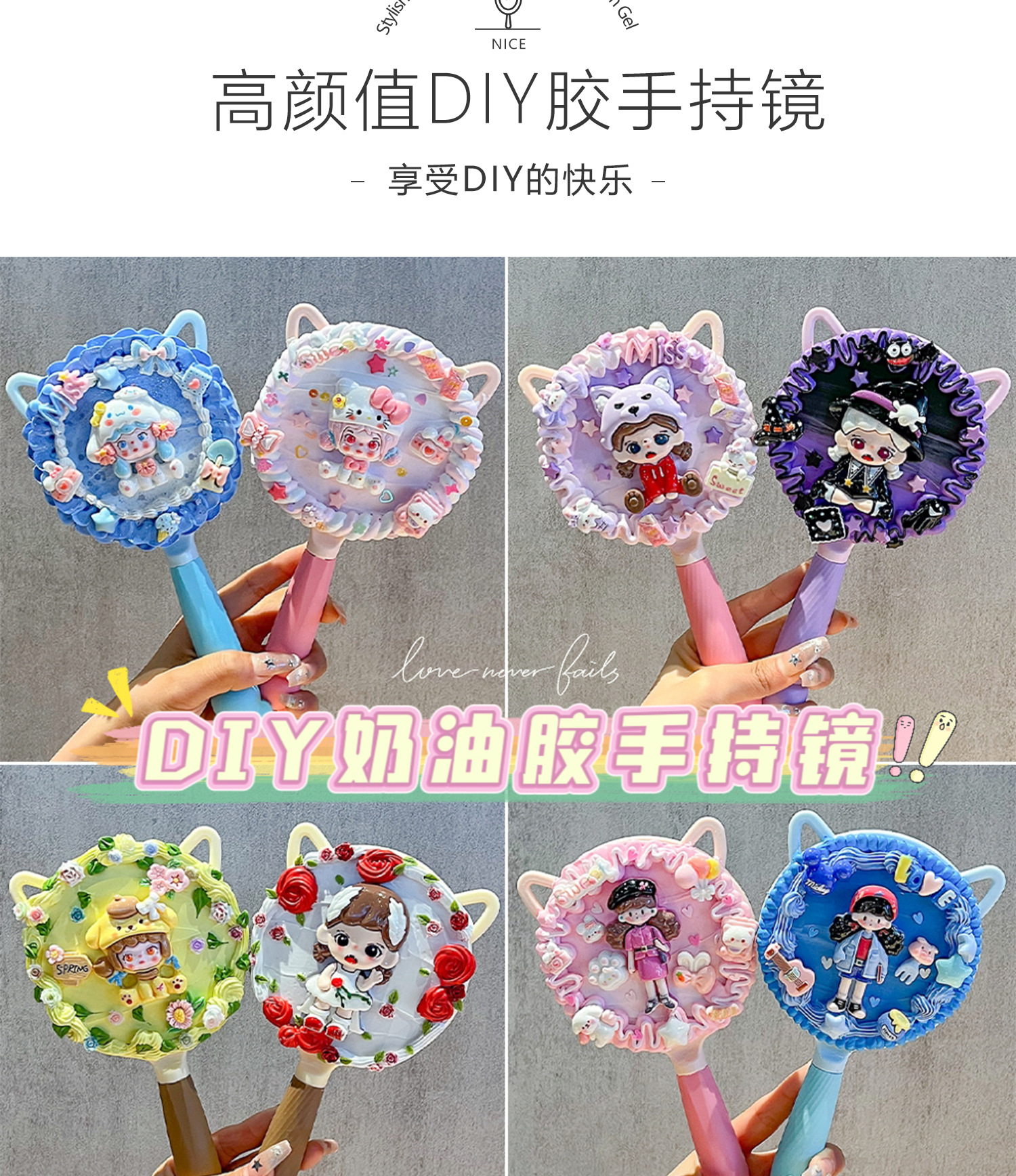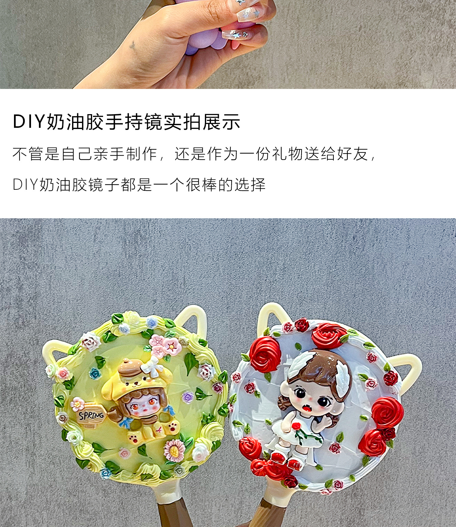 小女生奶油胶手工diy猫耳长柄手持化妆镜子海绵宝宝派大星材料包