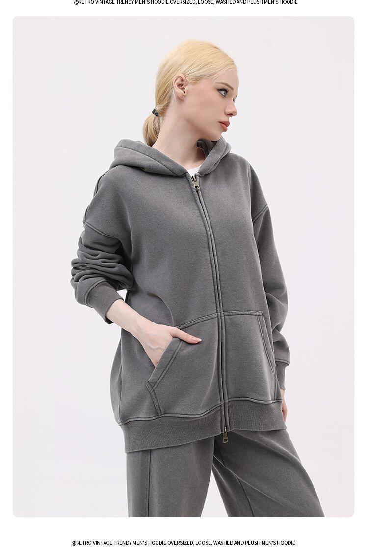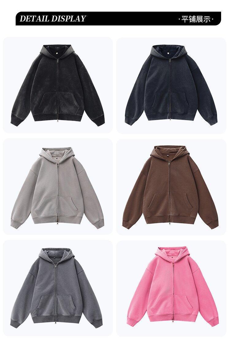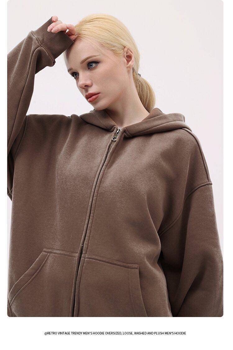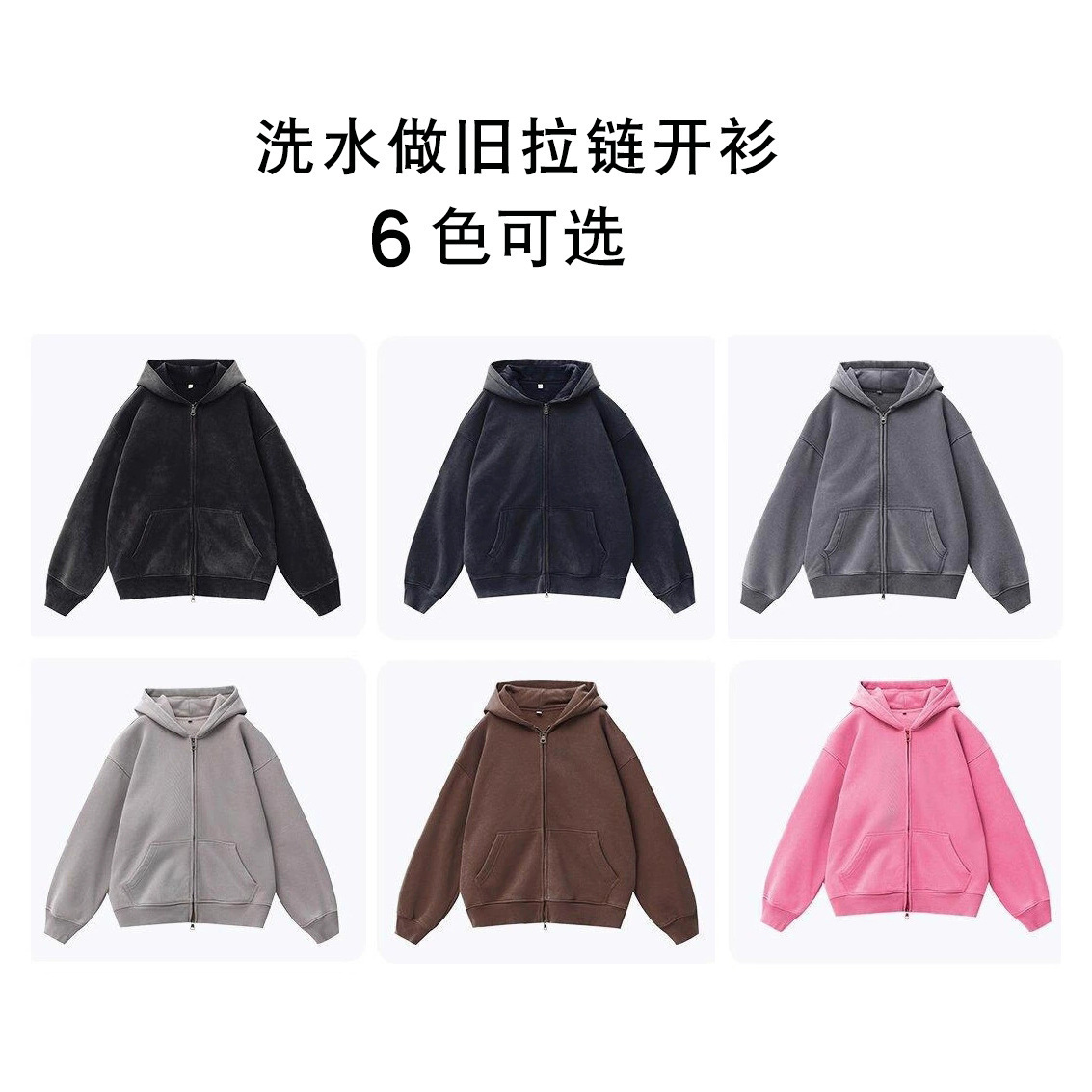 跨境欧码做旧加绒水洗拉链开衫连帽卫衣落肩复古加绒外套oversize