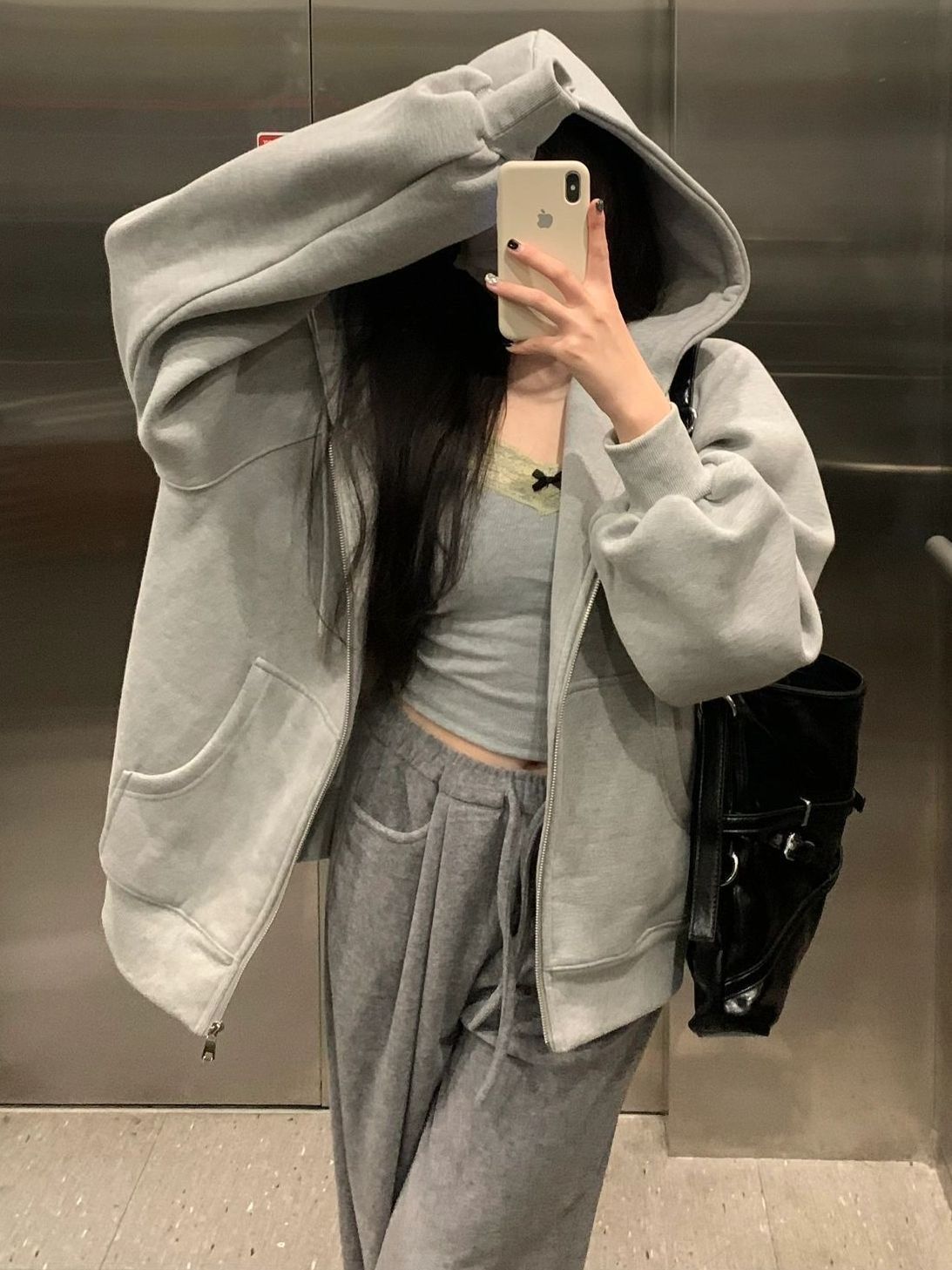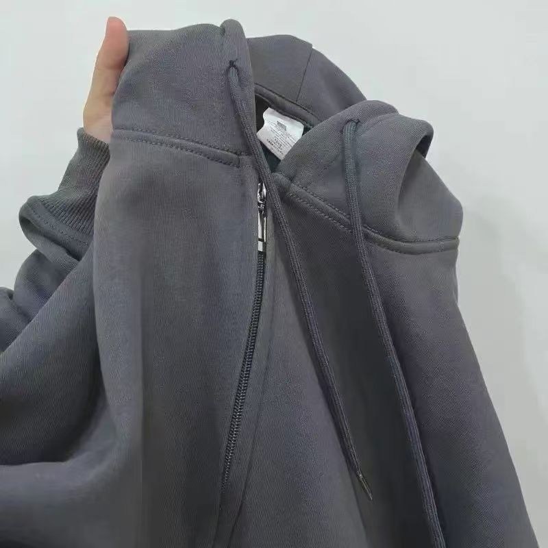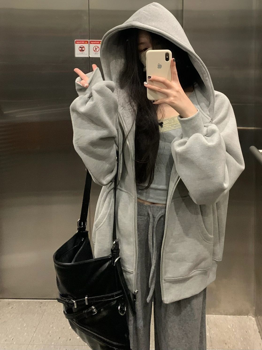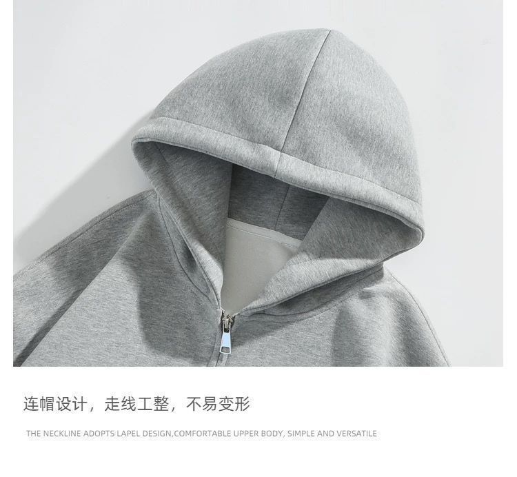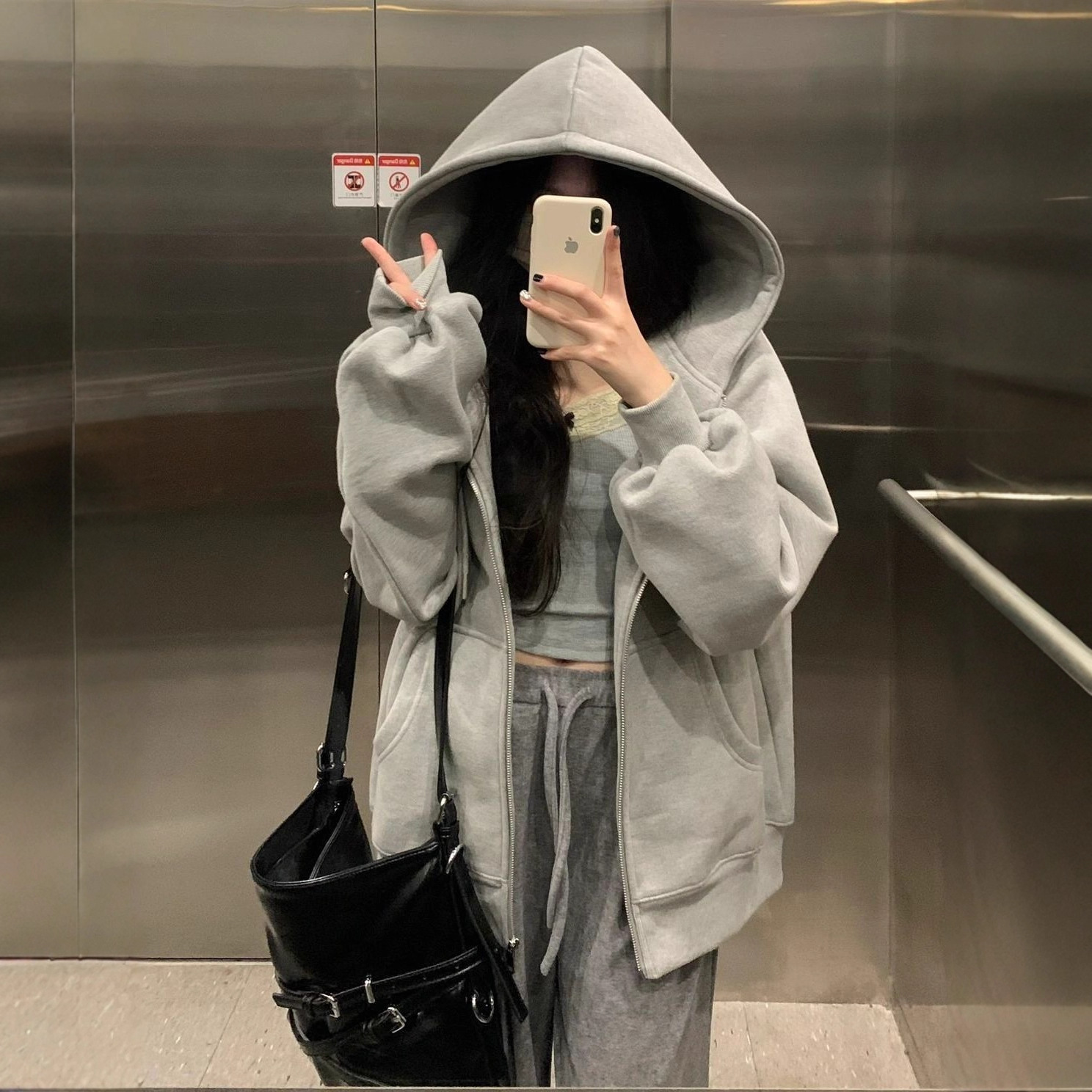 慵懒风卫衣女开衫拉链加绒加厚春秋冬季重磅潮牌纯色连帽外套上衣
