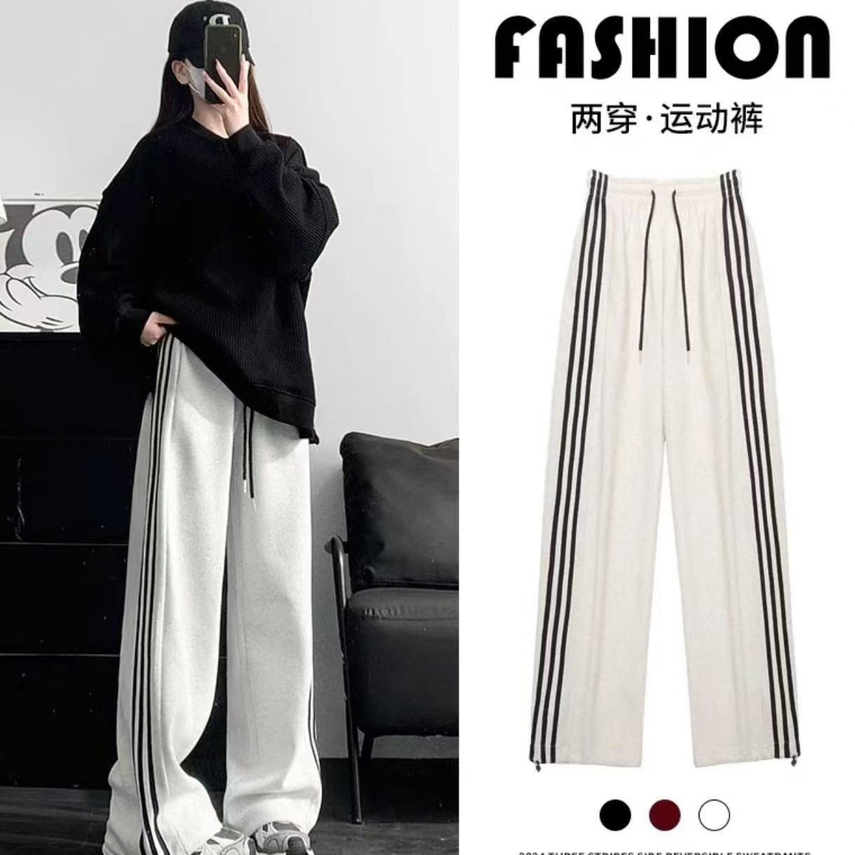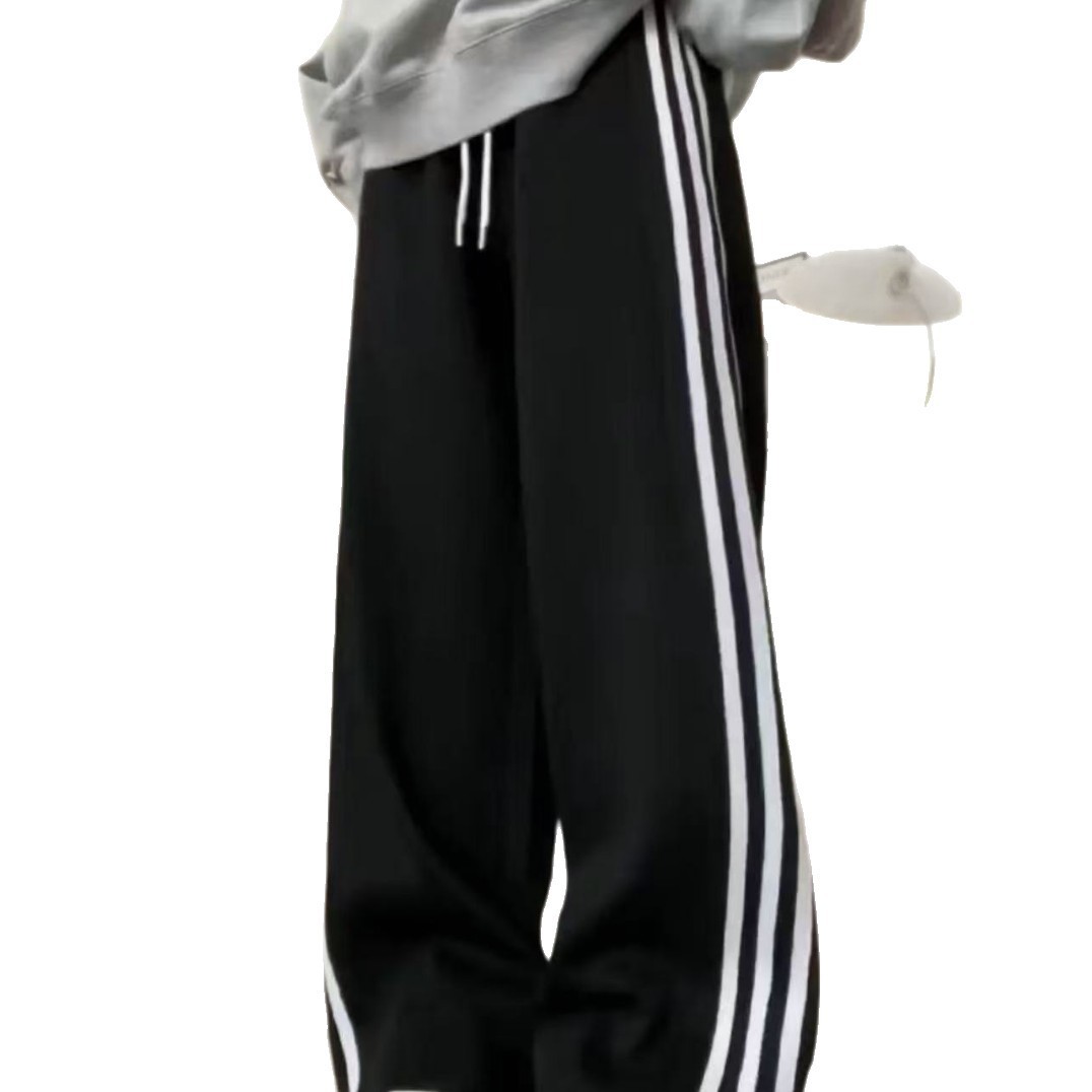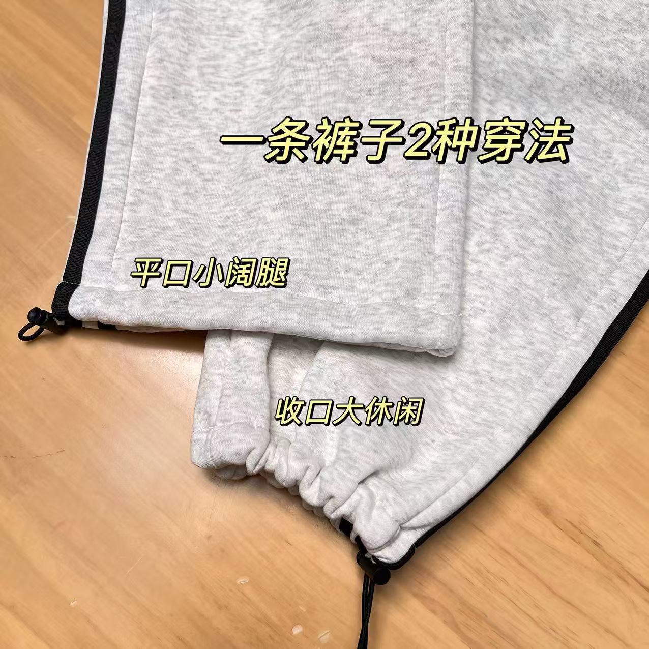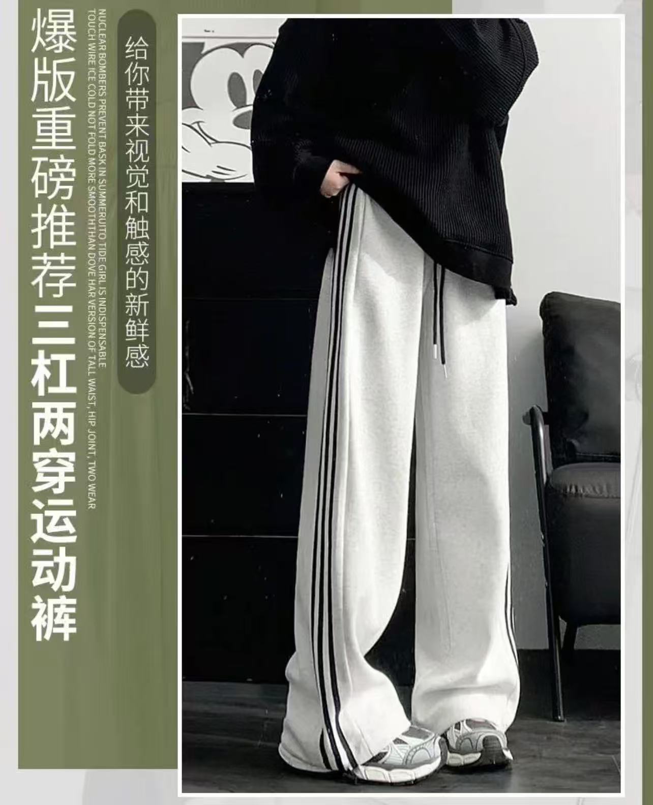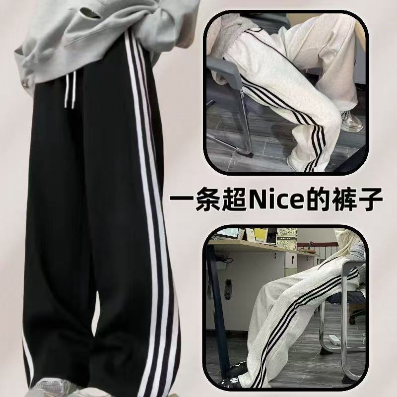 新款三条杠运动加绒卫裤潮牌宽松休闲直筒长裤秋冬男女松紧抽绳