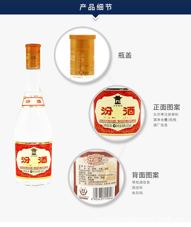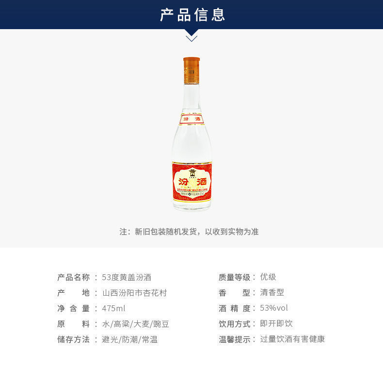 山西杏花村53度黄盖汾475ml*6清香型玻璃瓶白酒