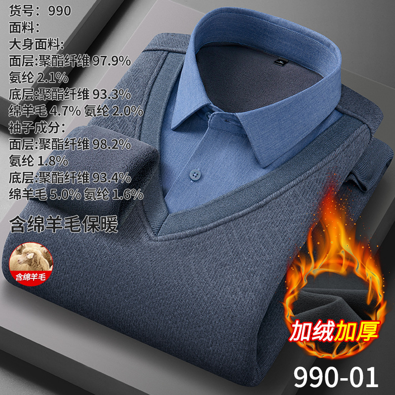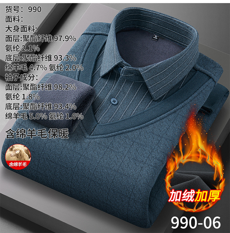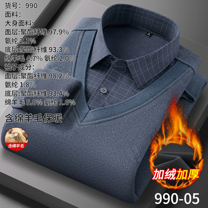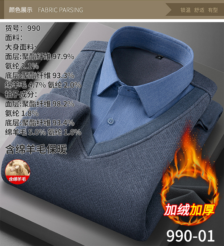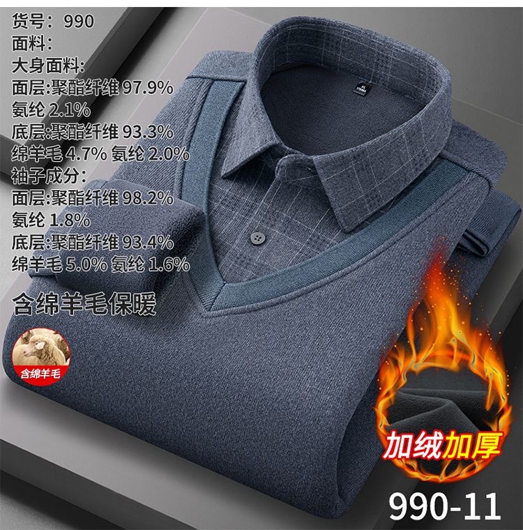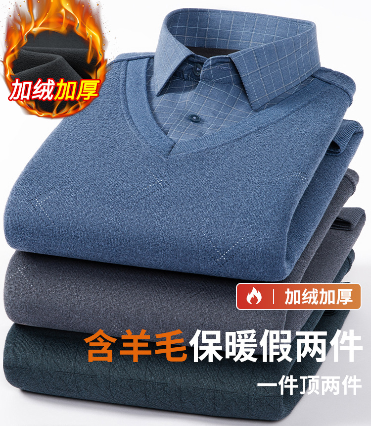 羊毛假两件加绒衬衫男士秋冬商务休闲加厚长袖衬衣内搭中年爸爸装