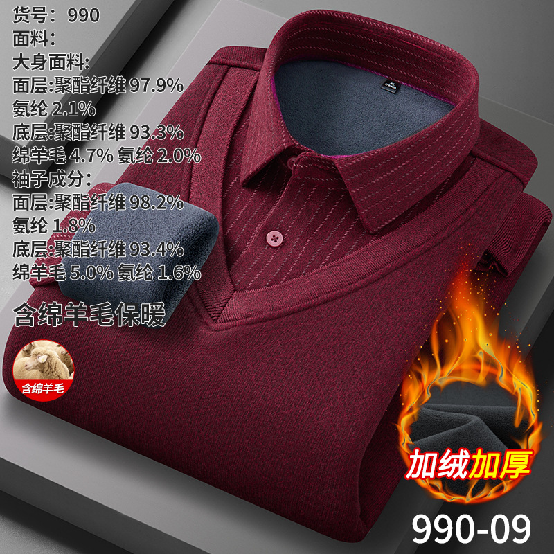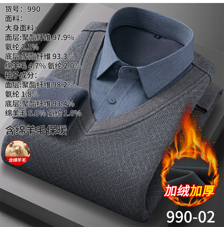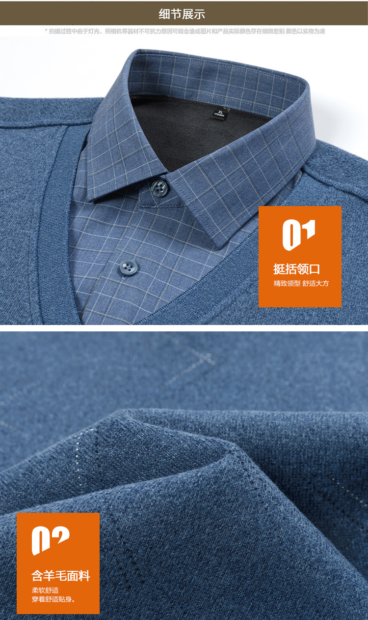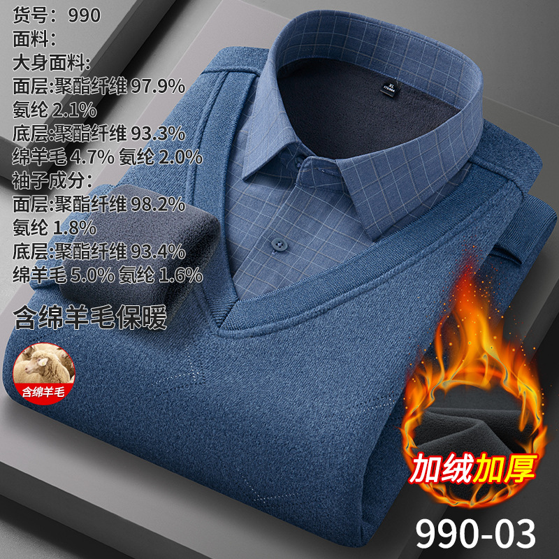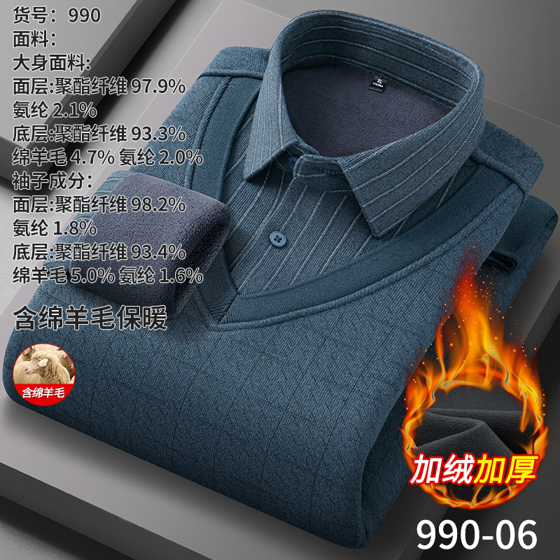 羊毛假两件加绒衬衫男士秋冬商务休闲加厚长袖衬衣内搭中年爸爸装