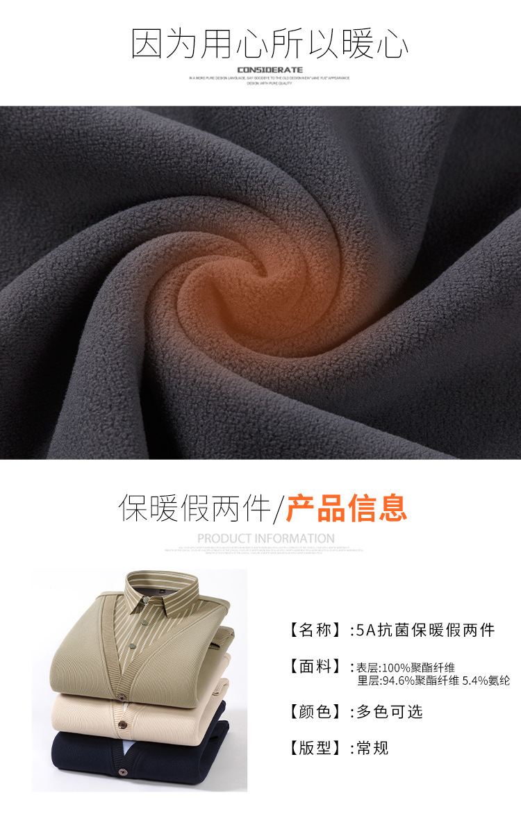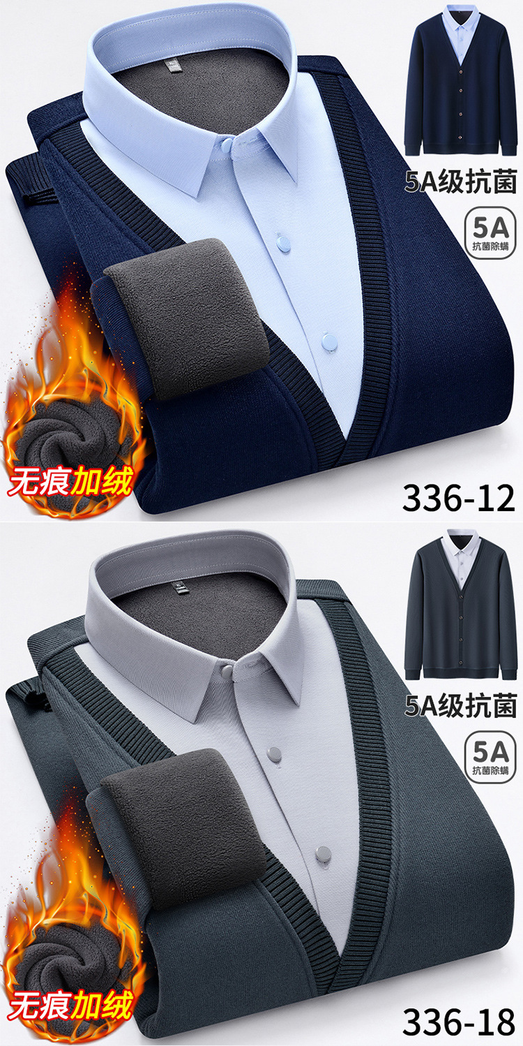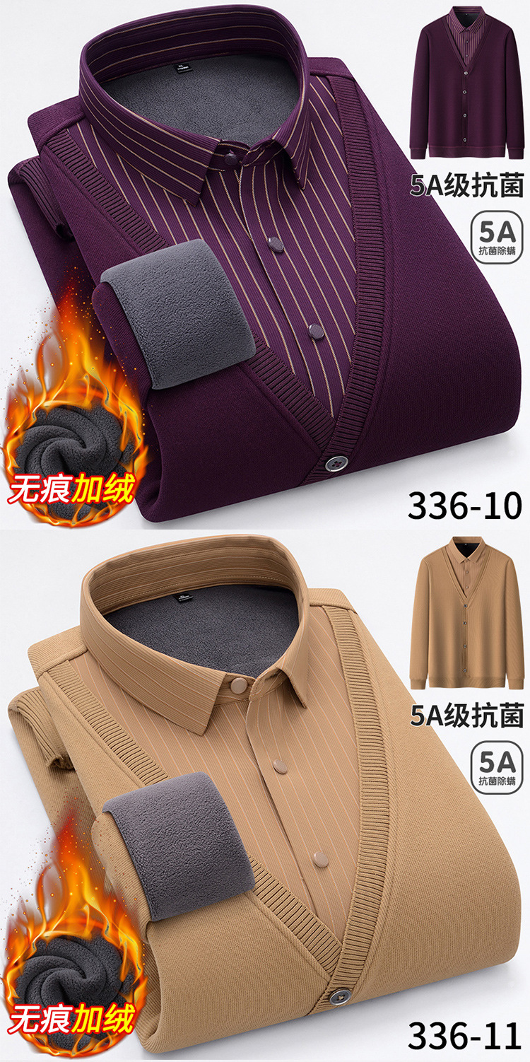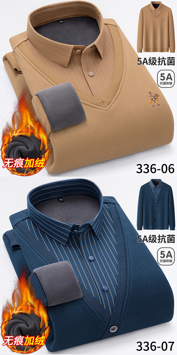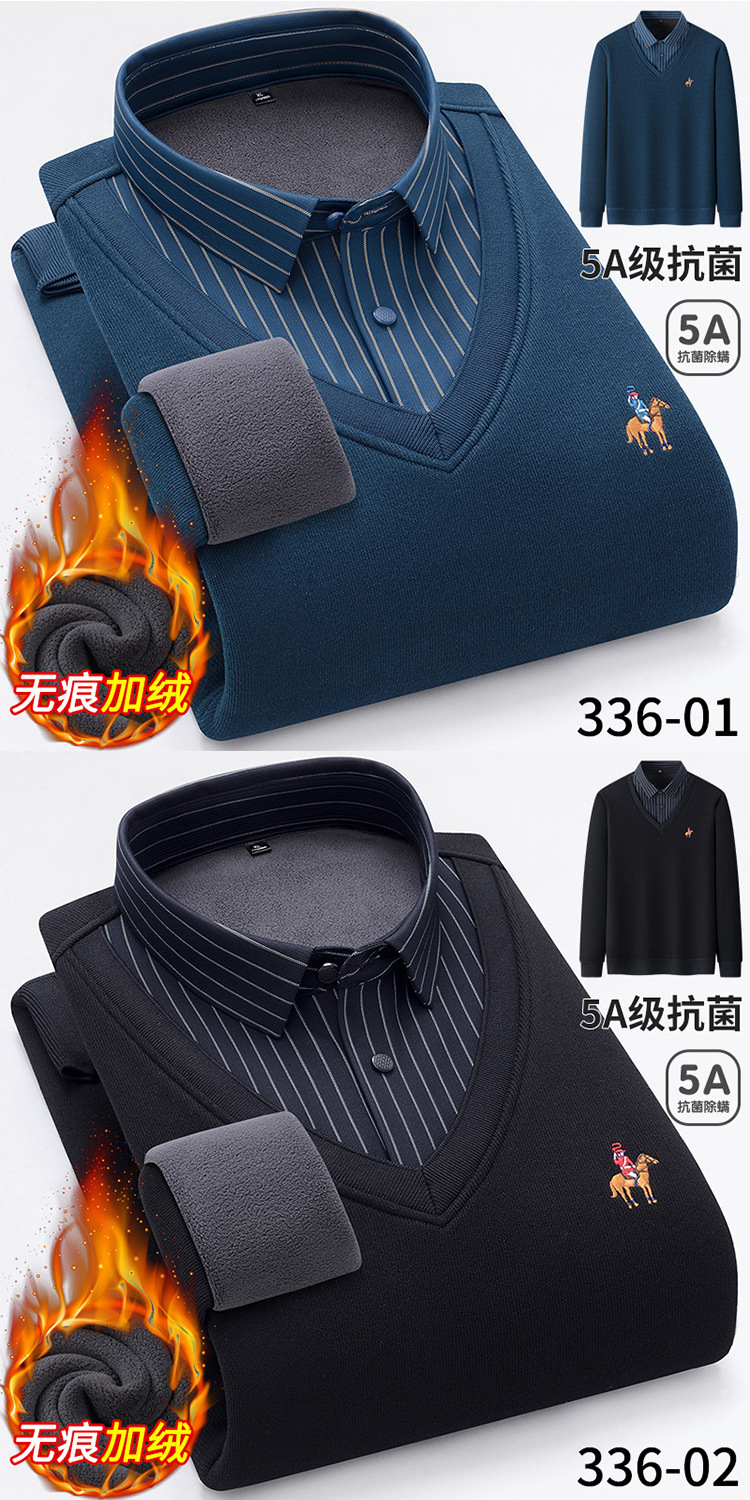 秋冬新款男士假两件衬衫加绒加厚轻奢级商务休闲免烫针织衫上衣男
