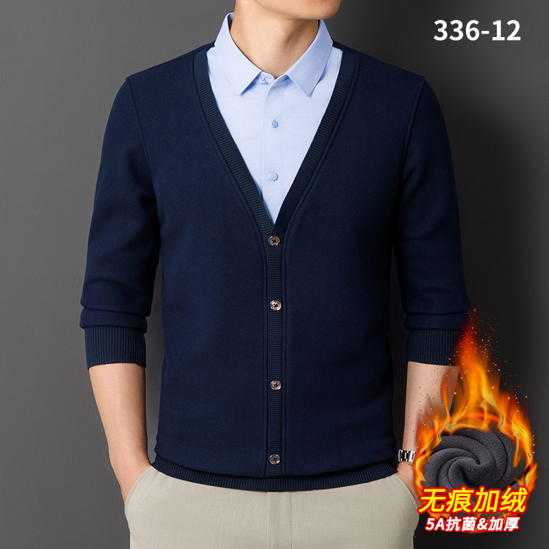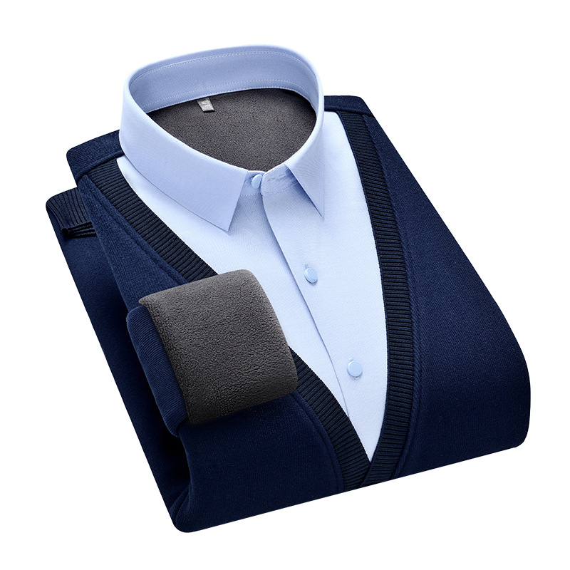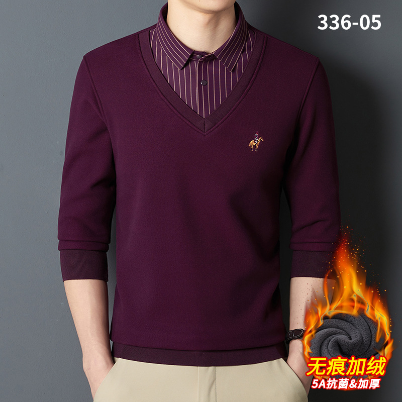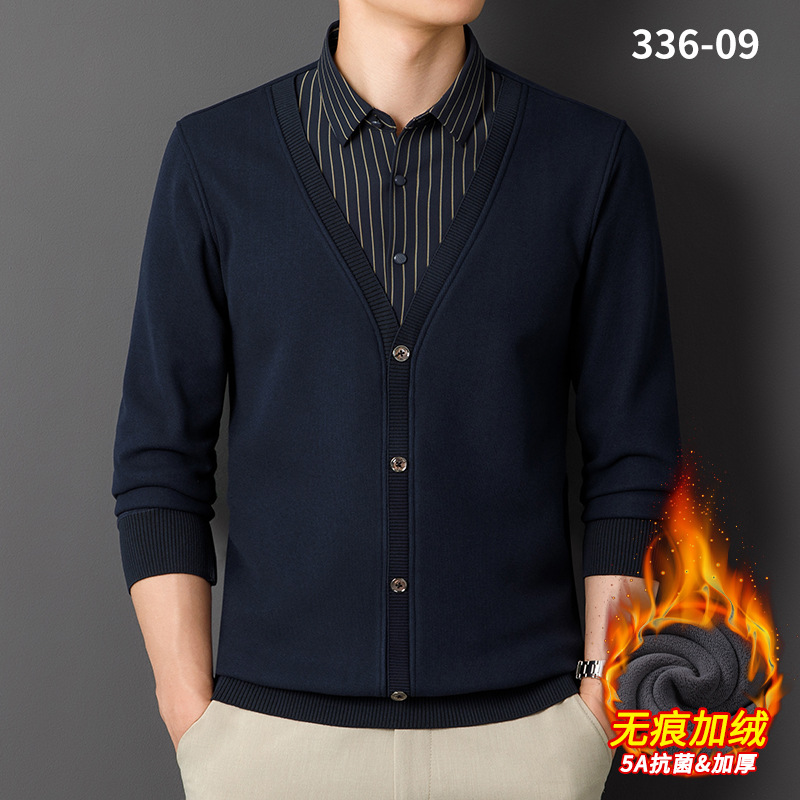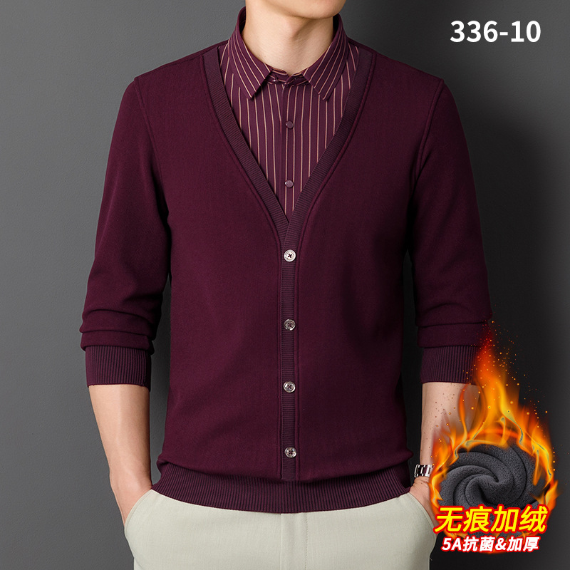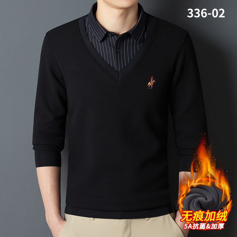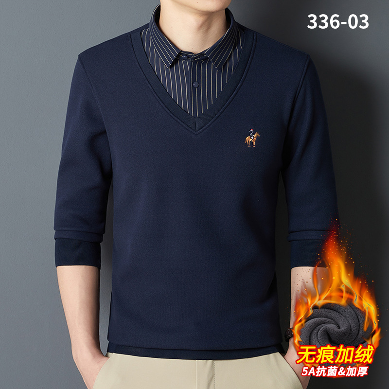 秋冬新款男士假两件衬衫加绒加厚轻奢级商务休闲免烫针织衫上衣男