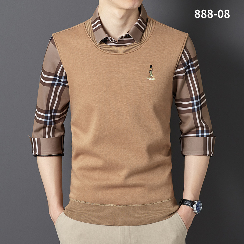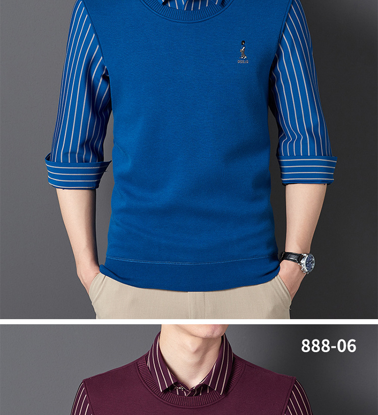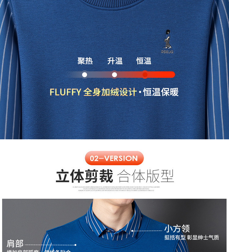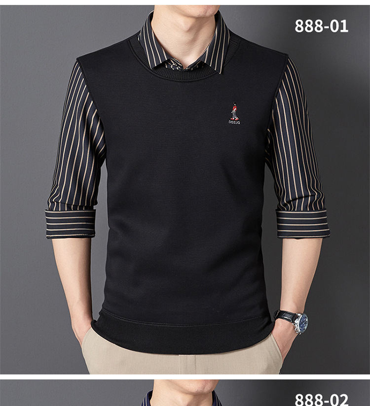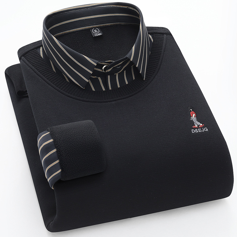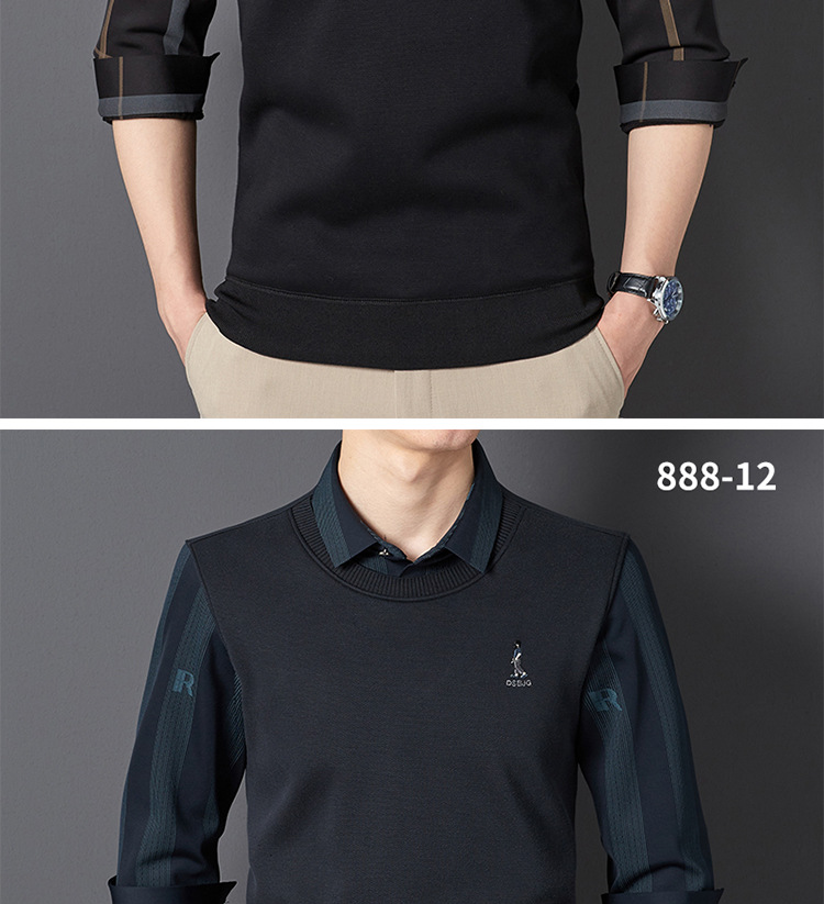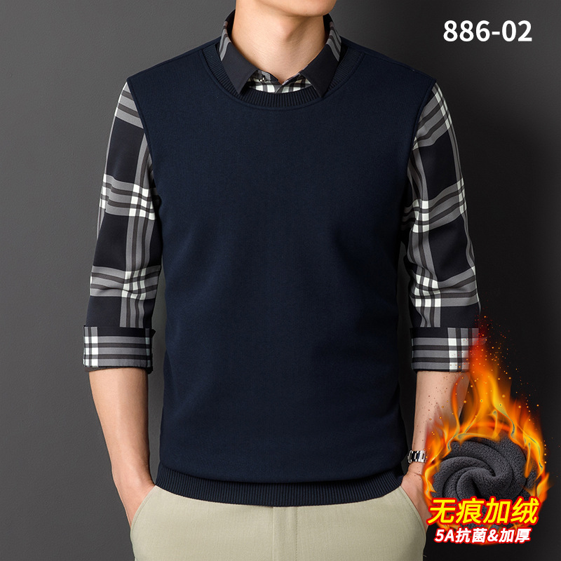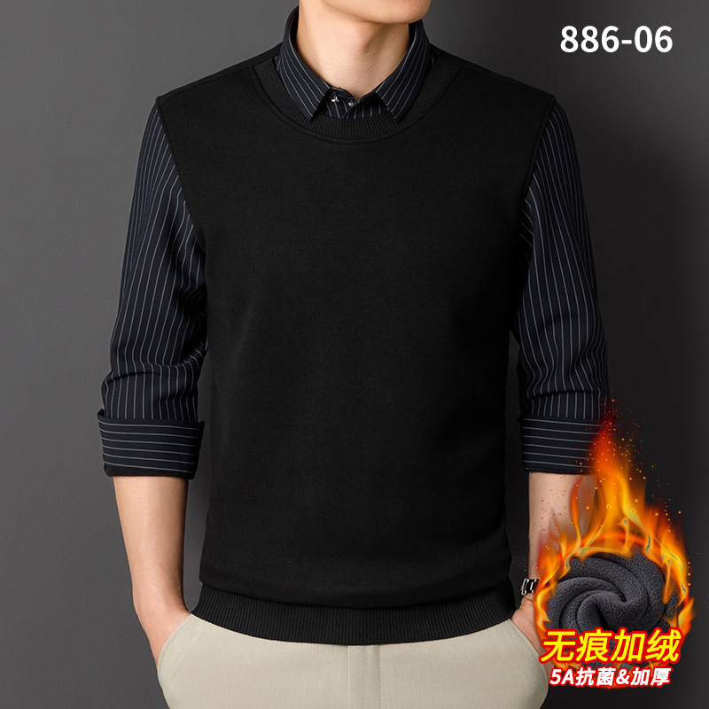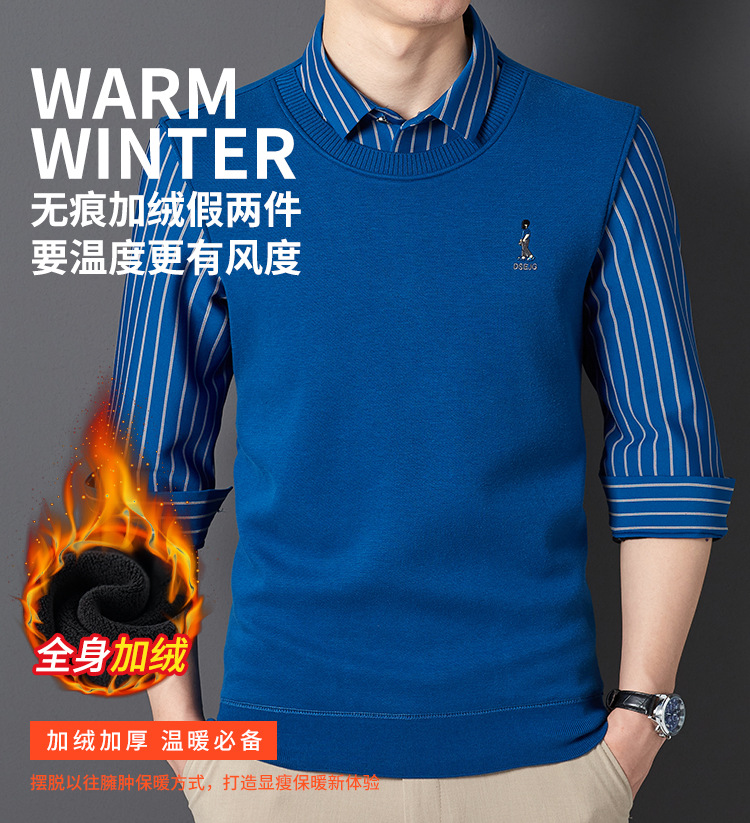 秋冬新款男士一体绒假两件商务休闲保暖衬衫潮流衬衫领针织打底衫