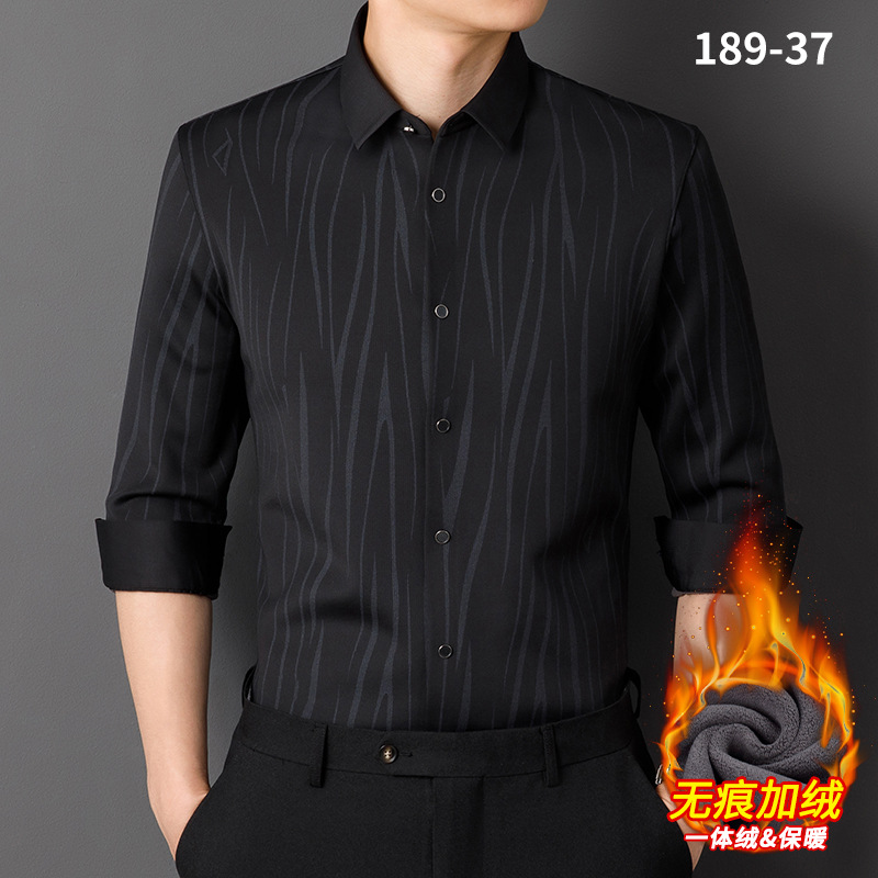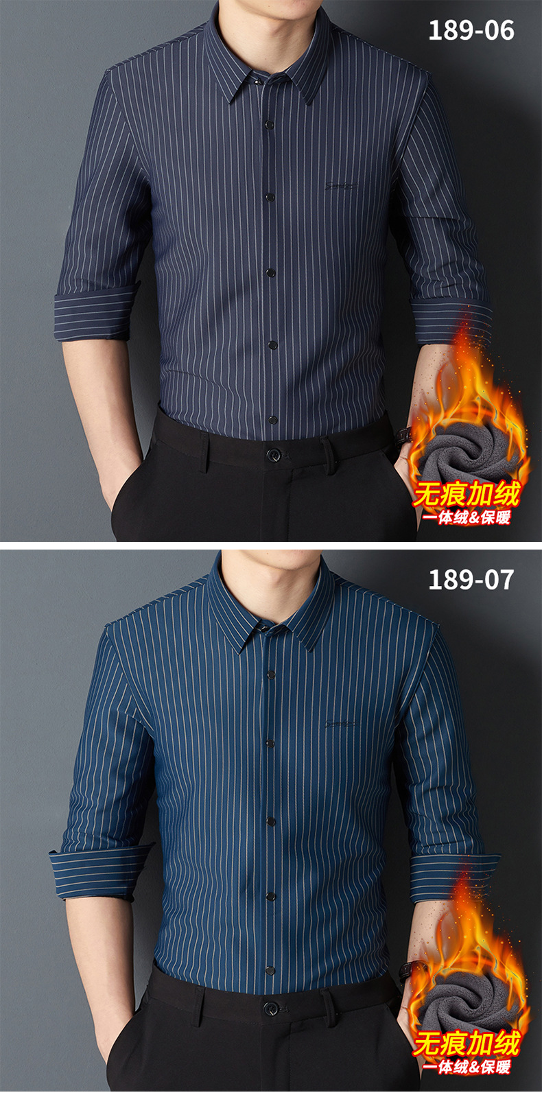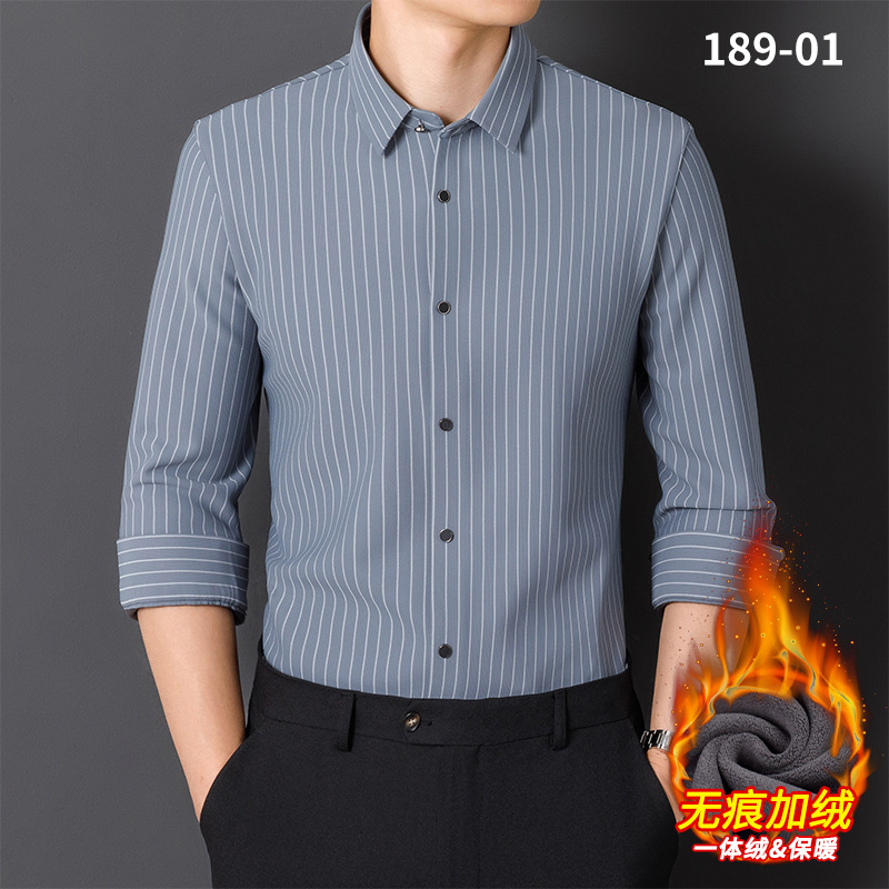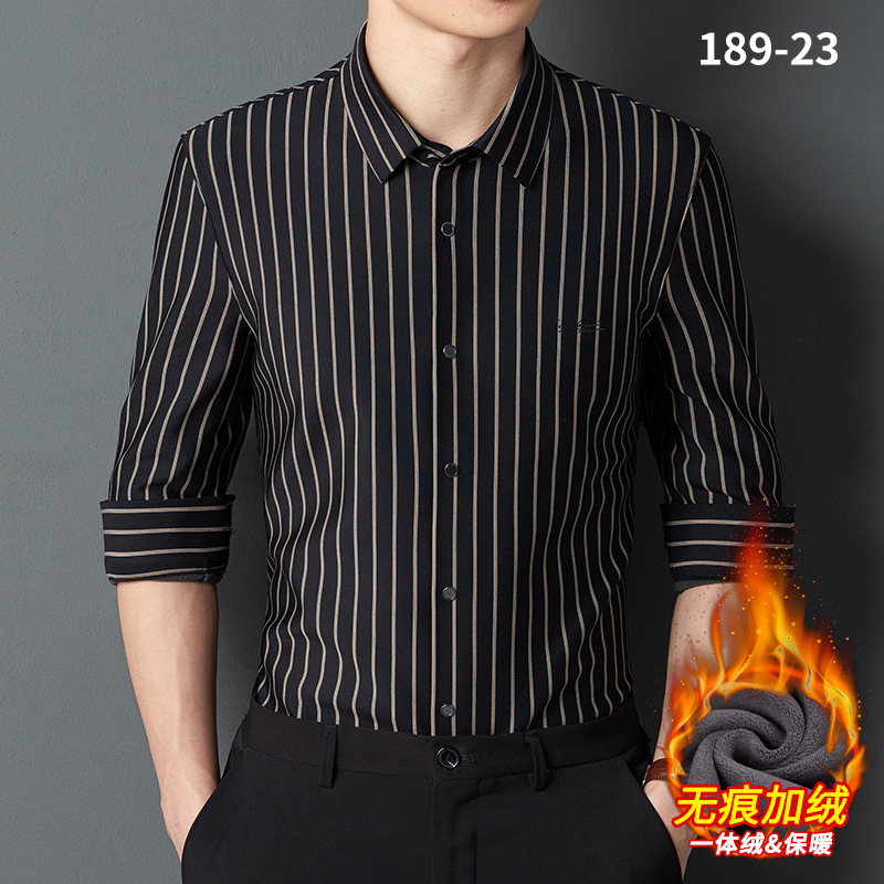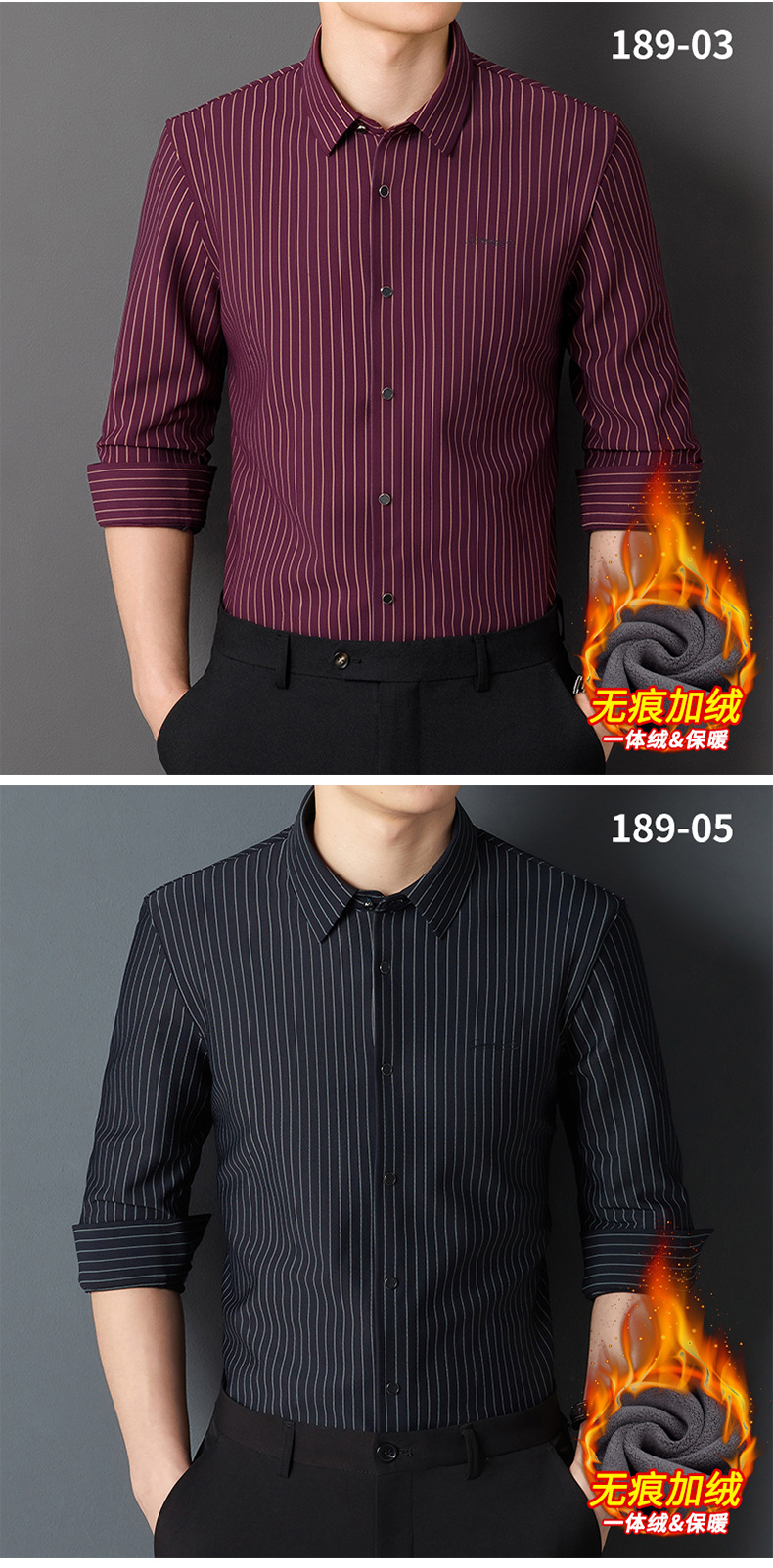 秋冬新款男士高端无痕商务免熨烫弹力保暖衬衫加厚一体绒条纹衬衣