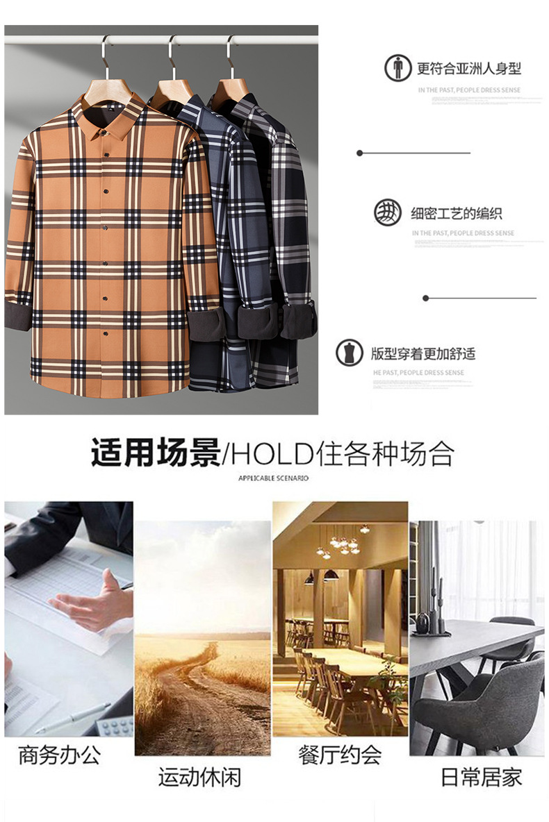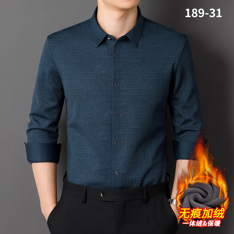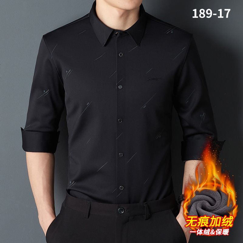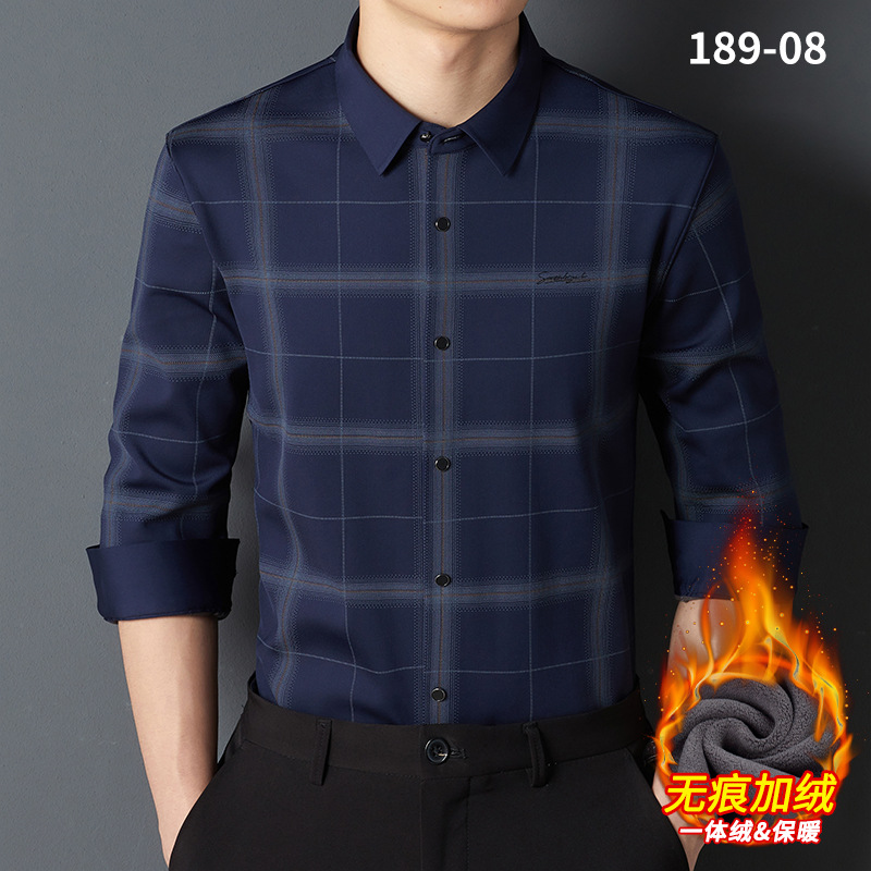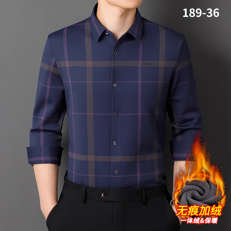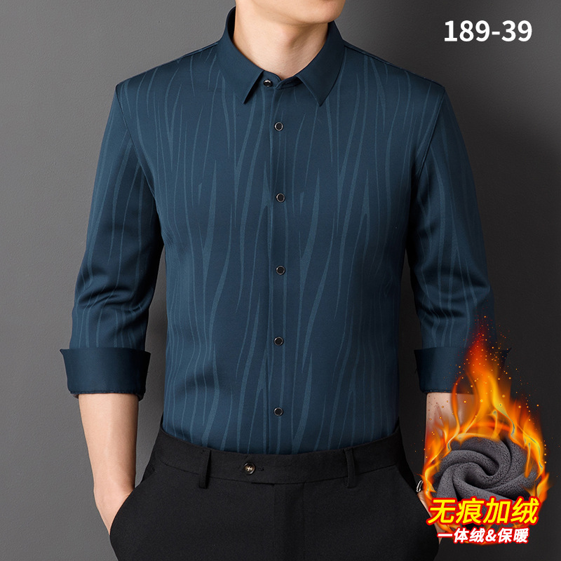 秋冬新款男士高端无痕商务免熨烫弹力保暖衬衫加厚一体绒条纹衬衣