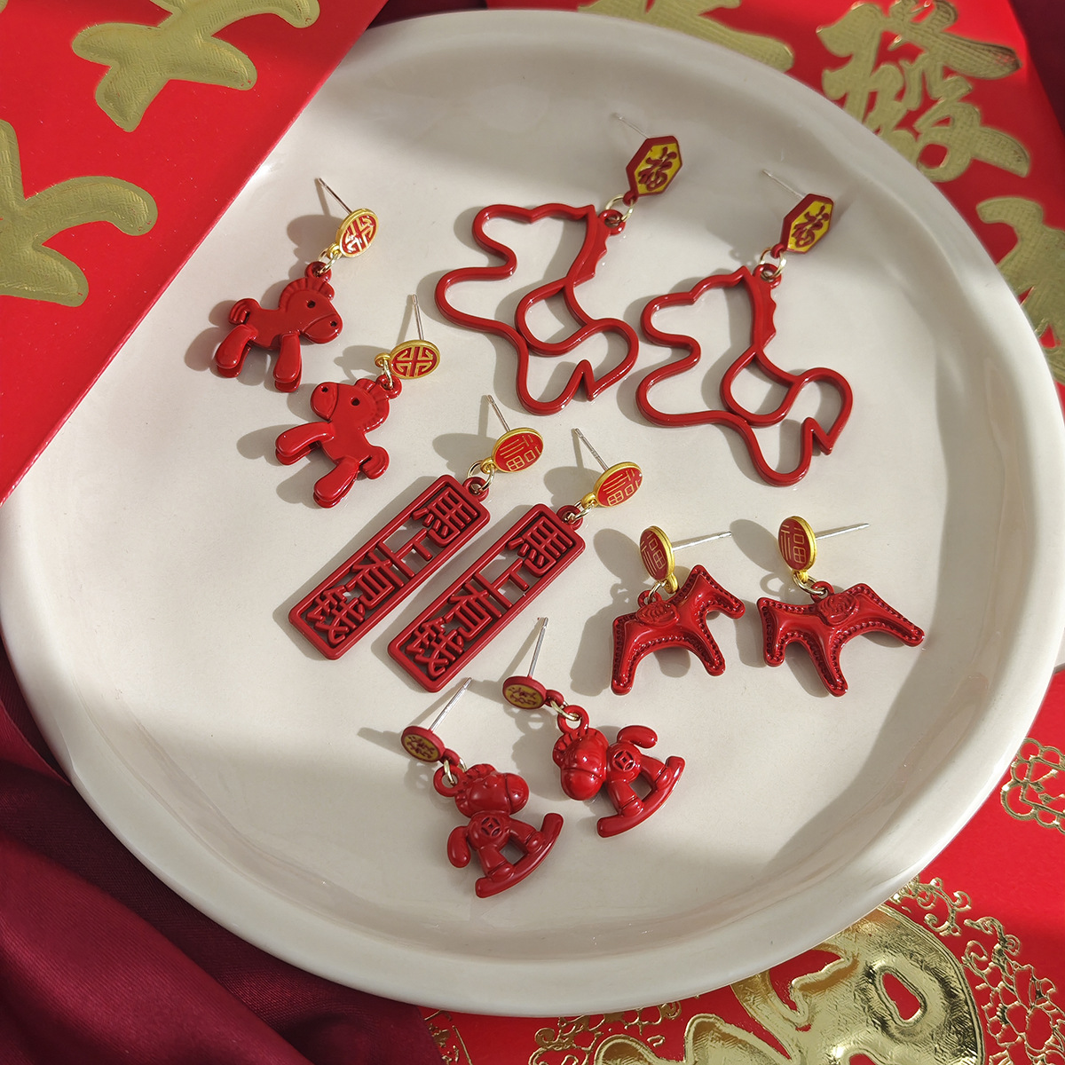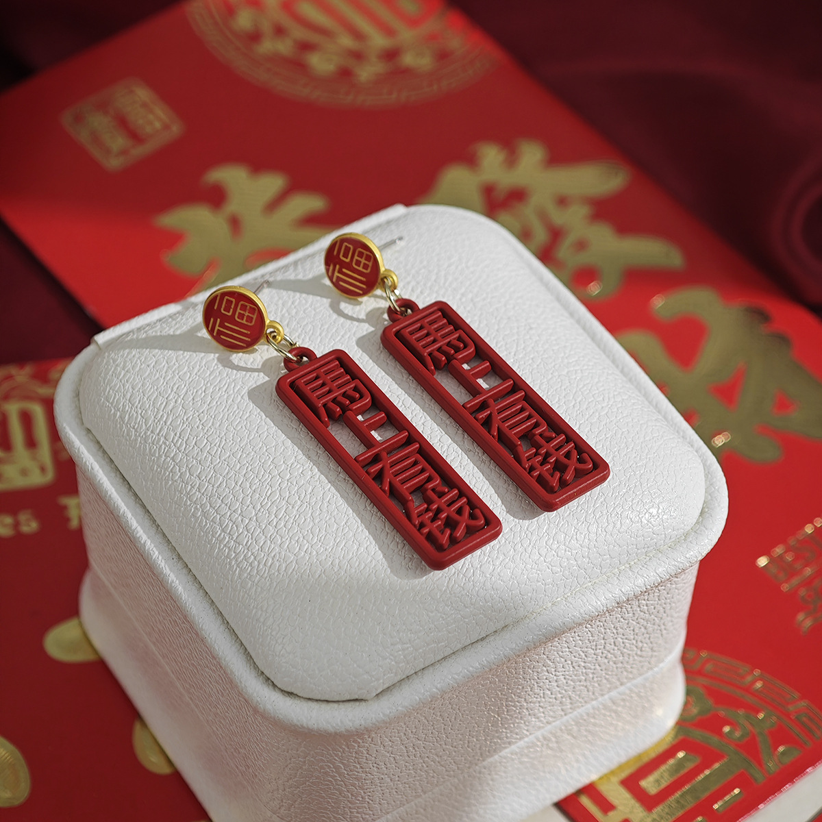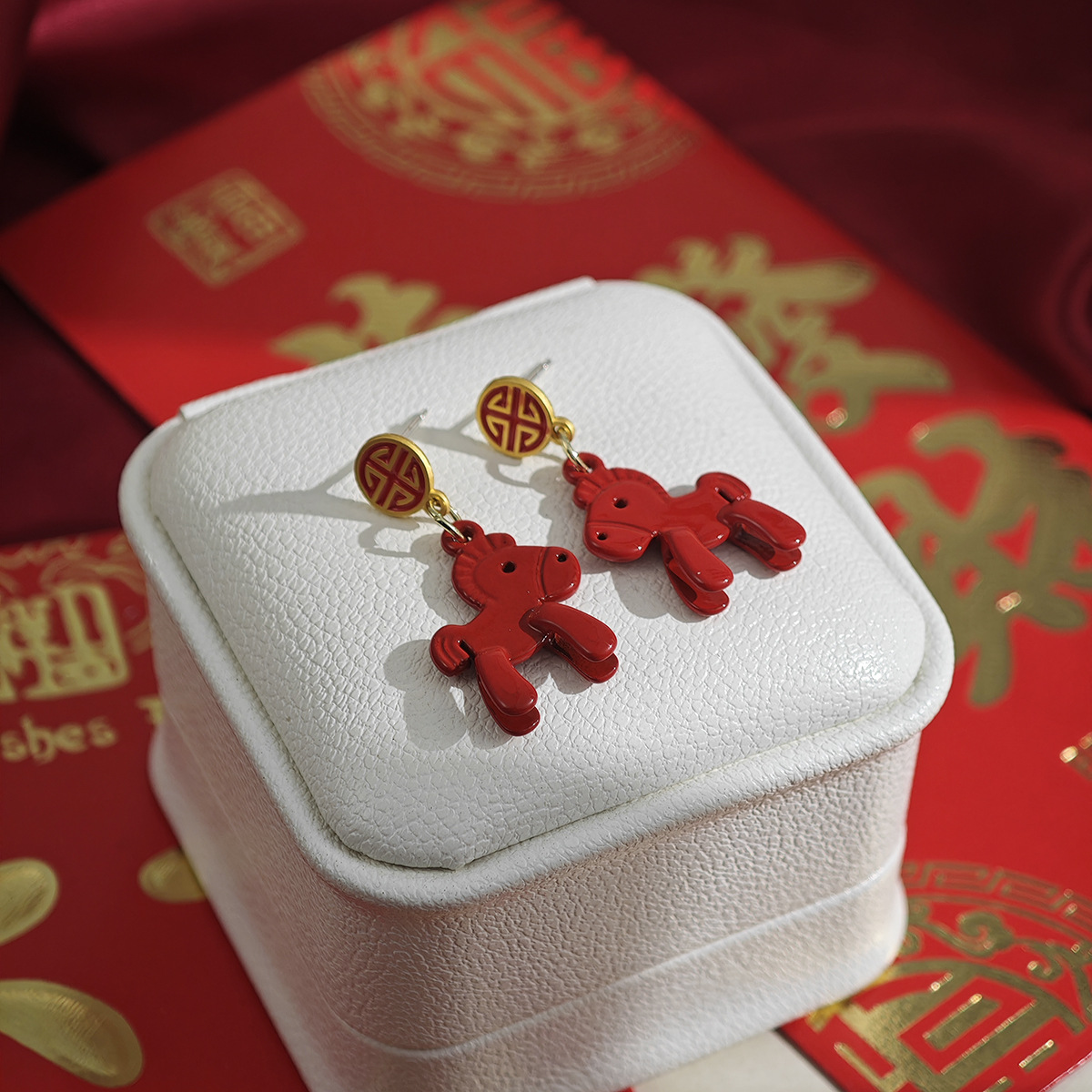 银针中国风新年红色福字立体木马吊坠马上有钱喜庆氛围感个性耳环