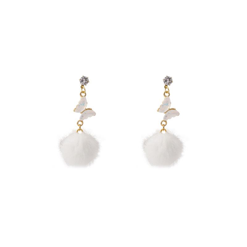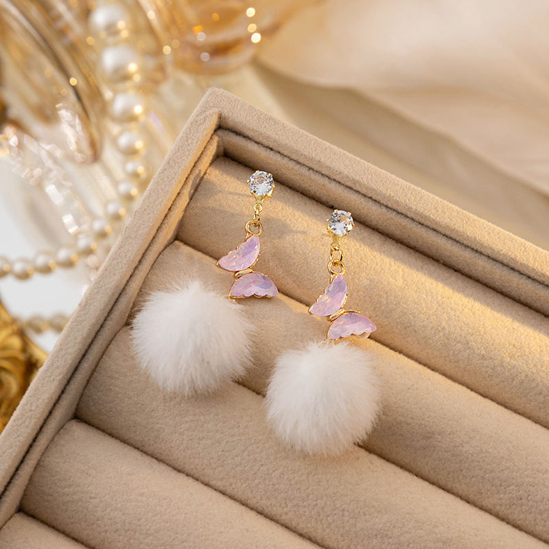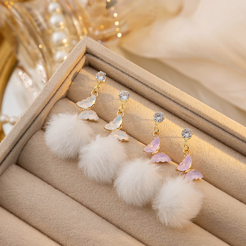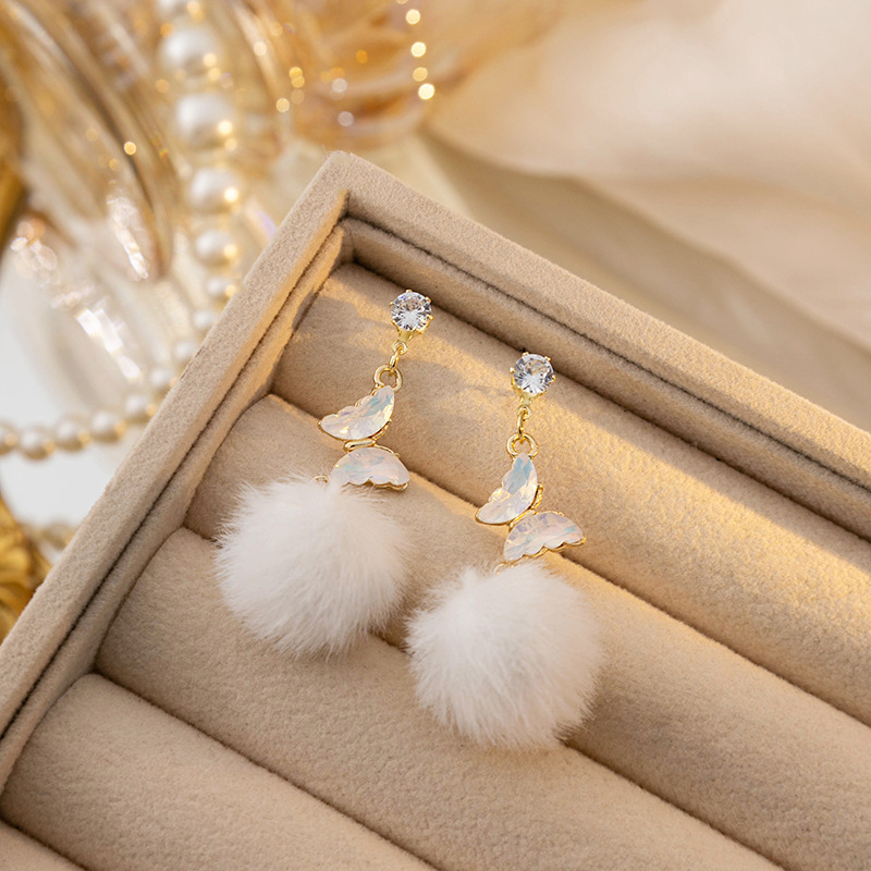 银针秋冬镶钻长款蝴蝶毛球流苏耳环 韩版简约高级设计感甜美耳钉