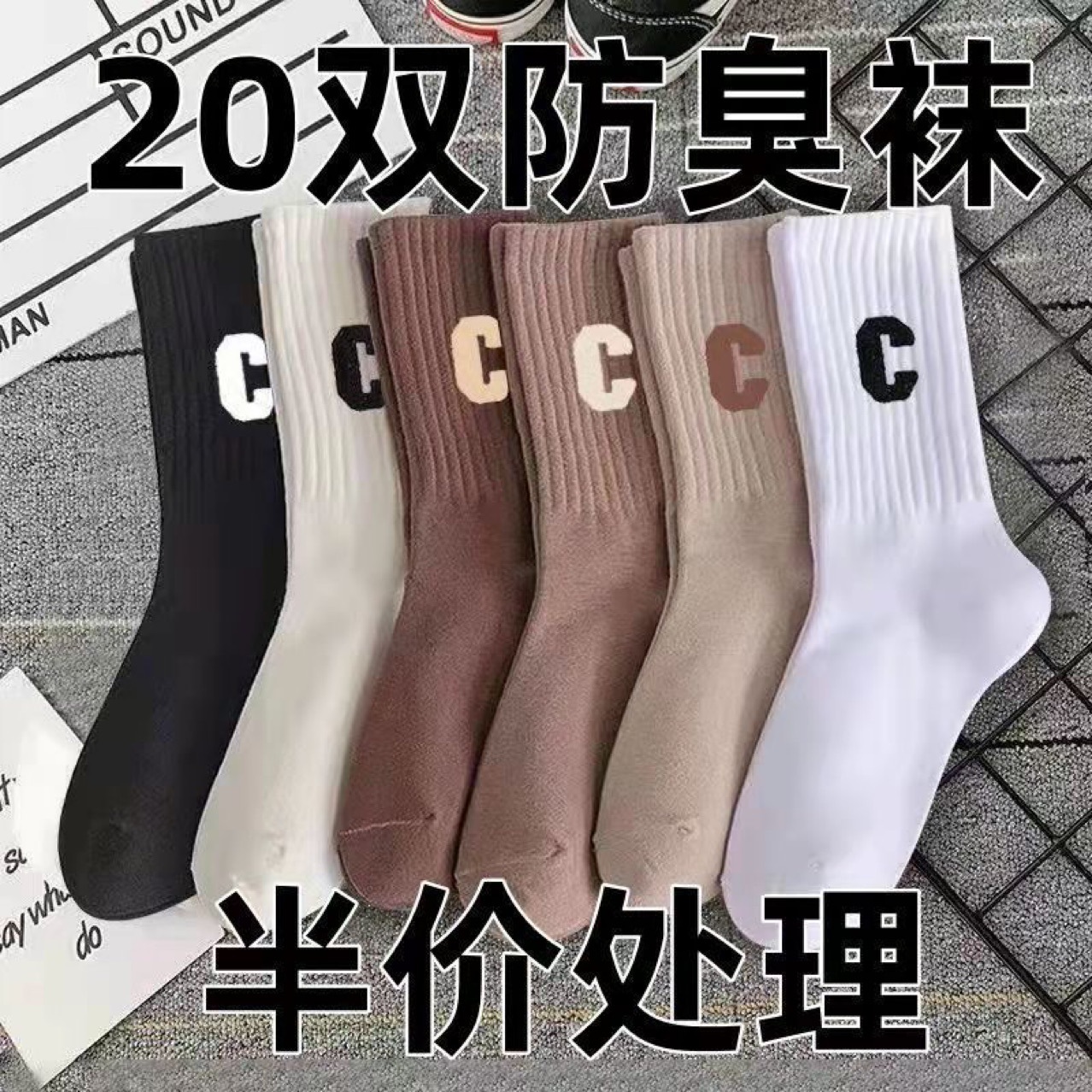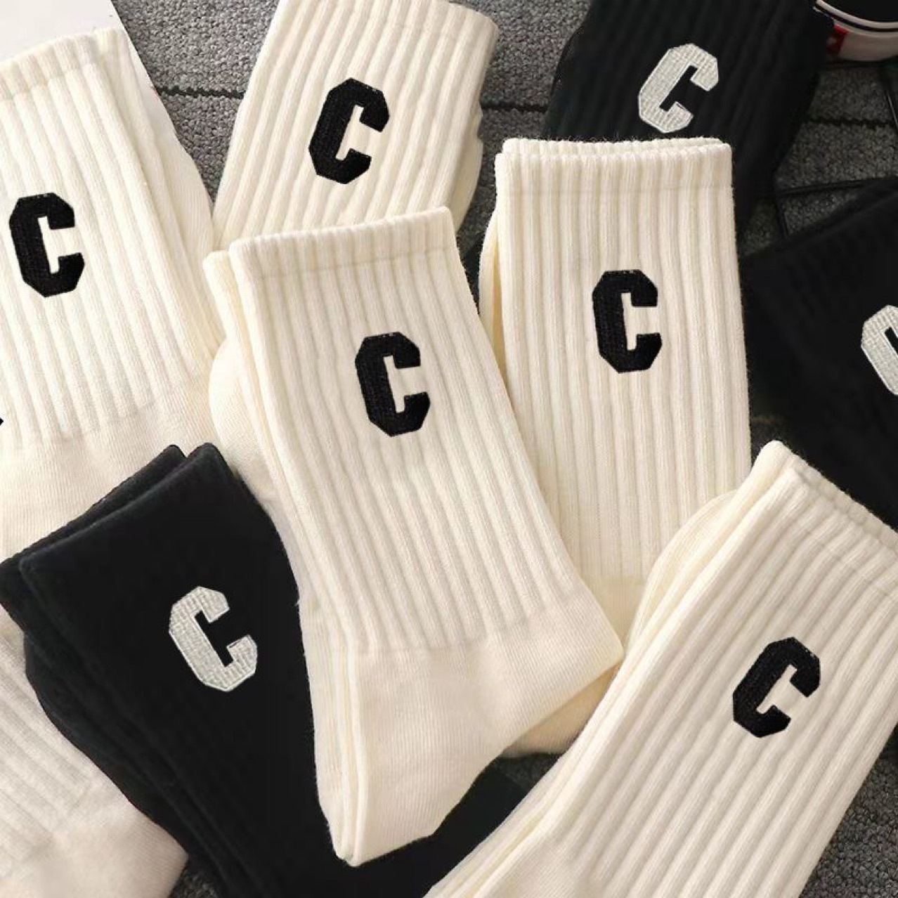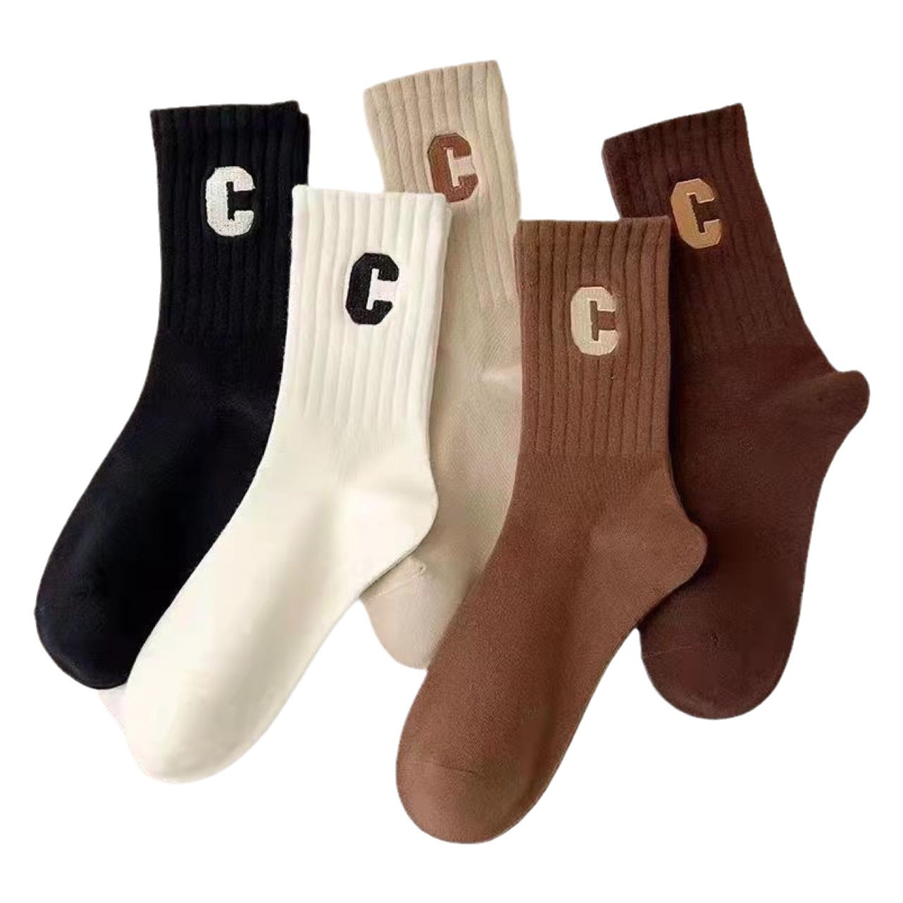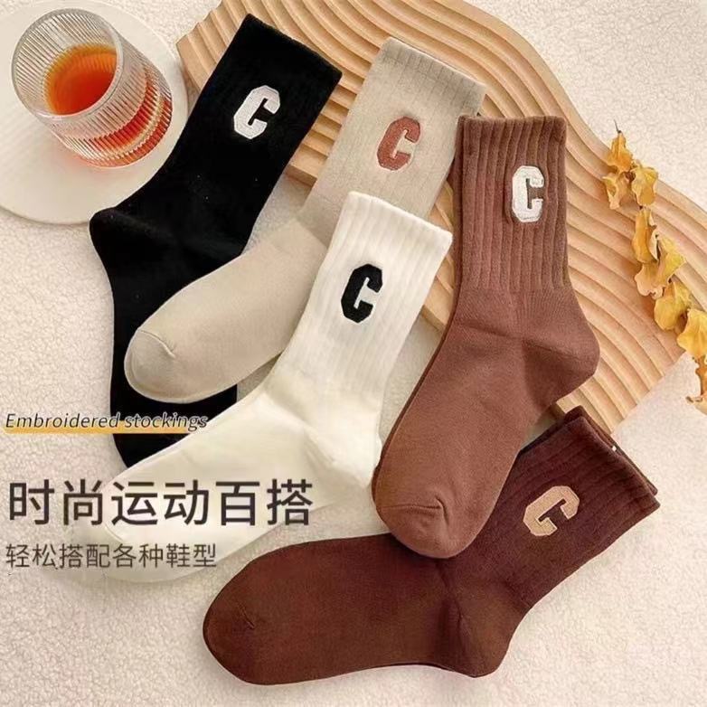 诸暨袜子工厂批发秋冬男女袜子字母款大C中筒袜热销时尚高筒长袜