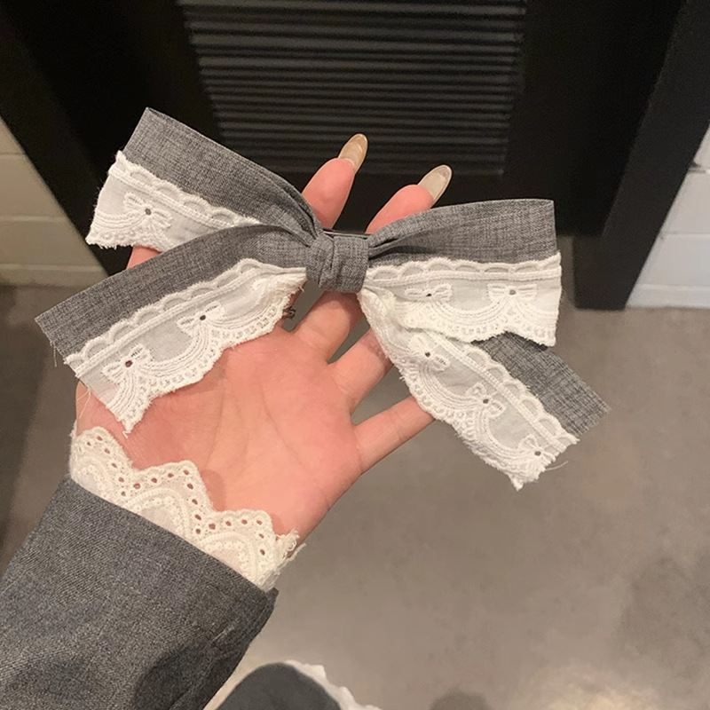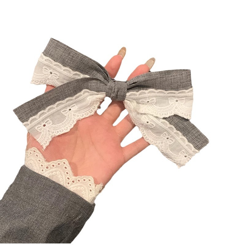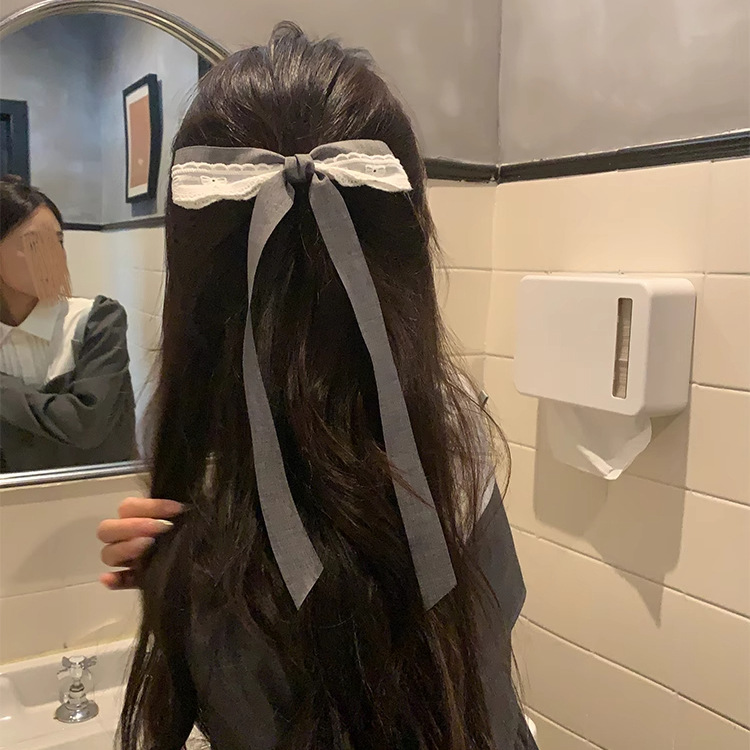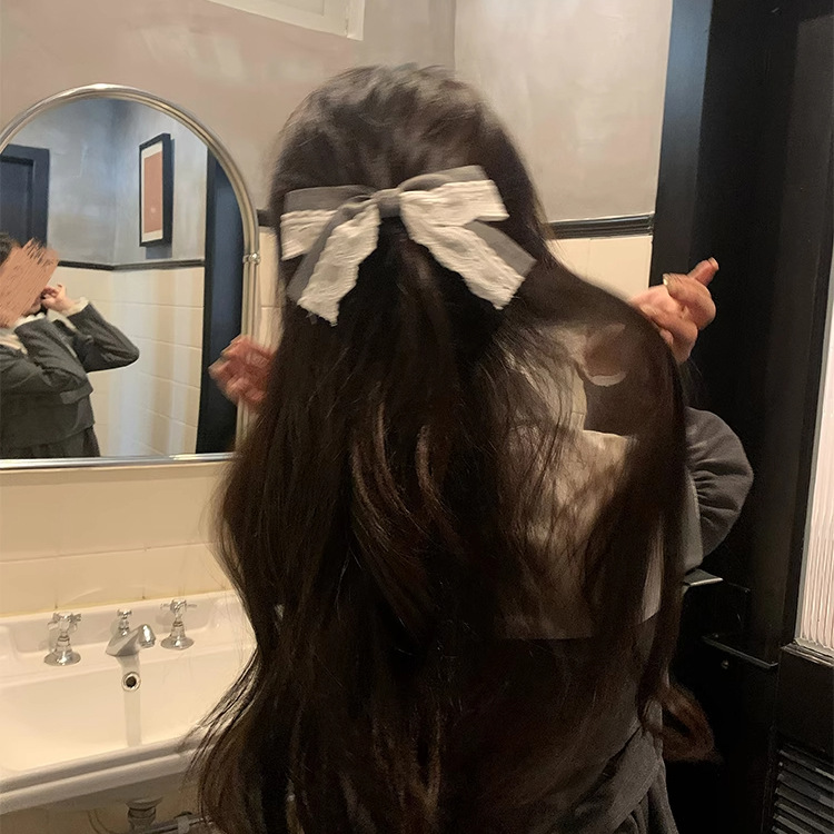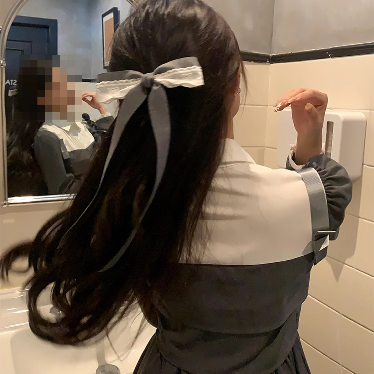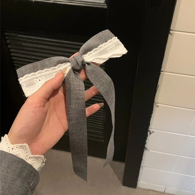 质感格雷系灰色蕾丝拼接蝴蝶结发夹女气质飘带半扎发鸭嘴夹发饰