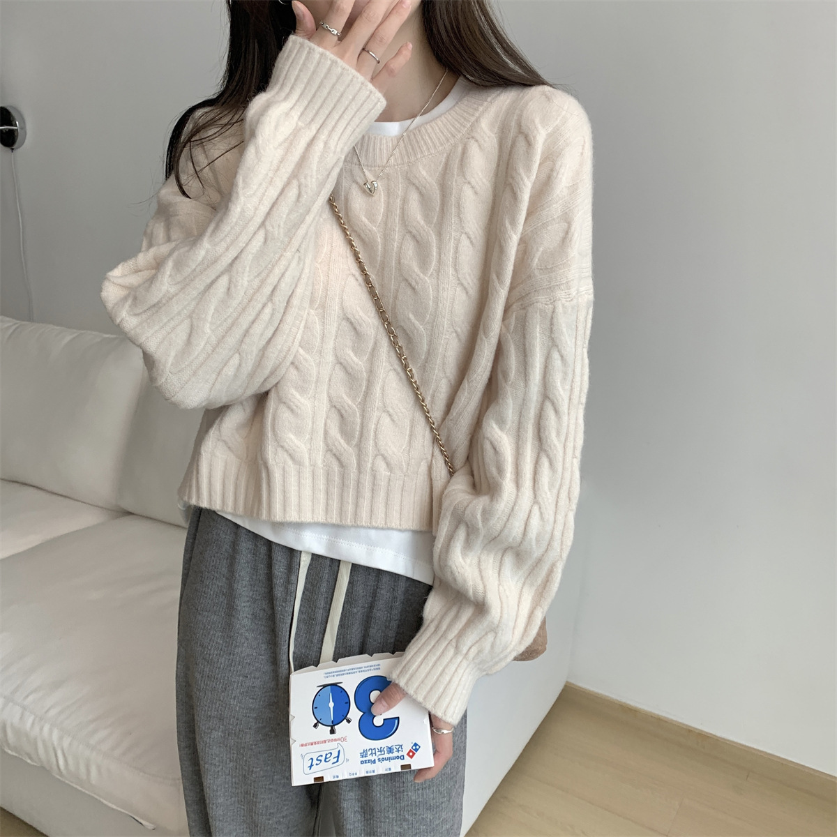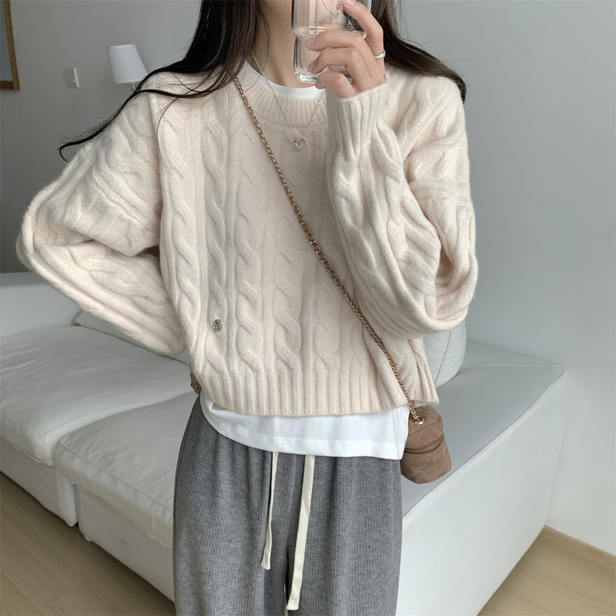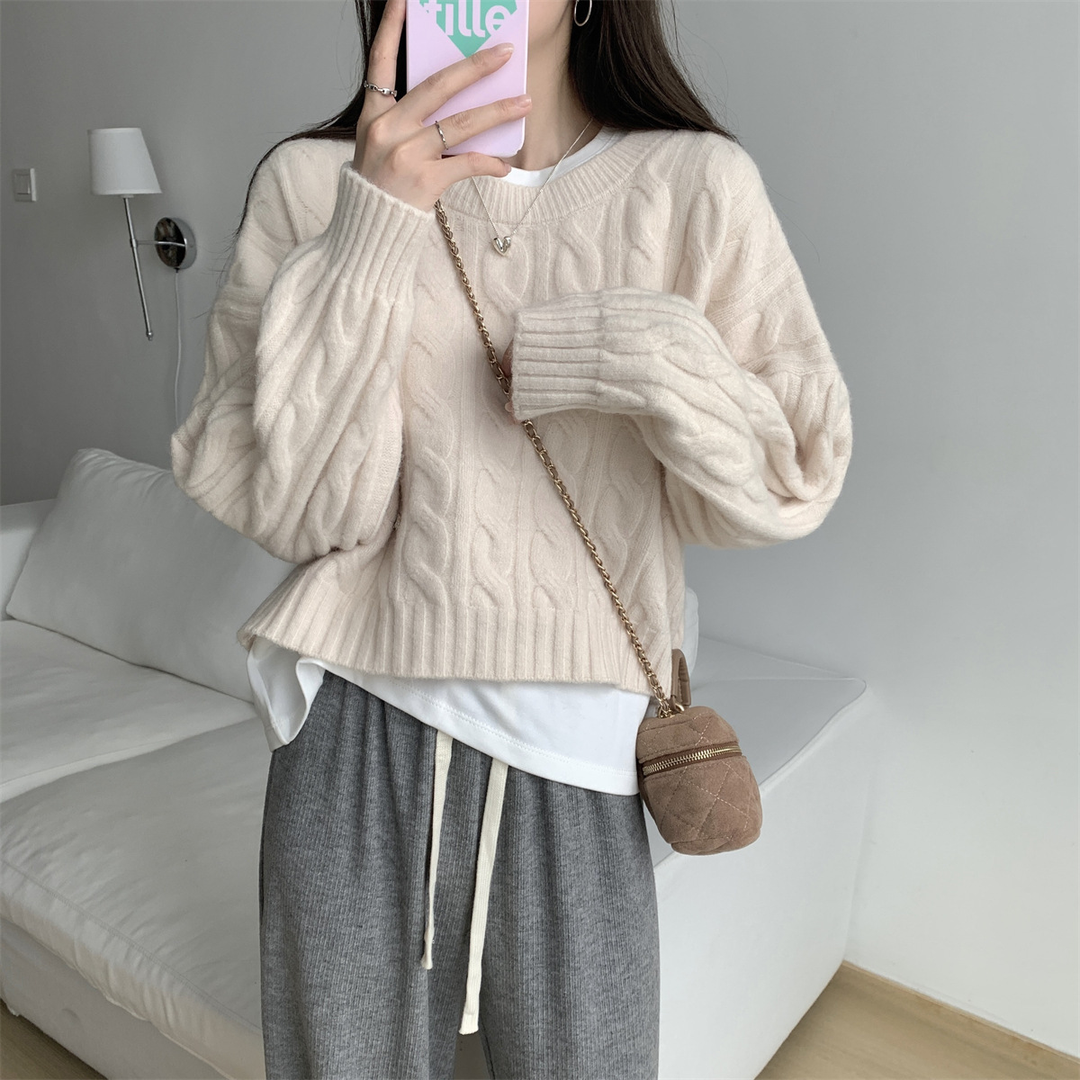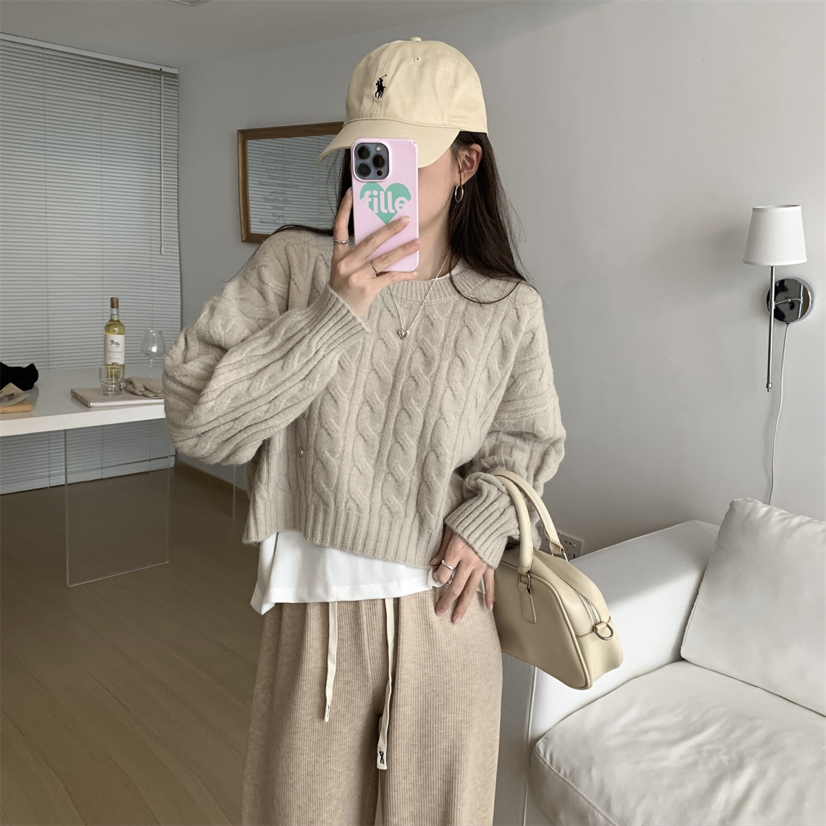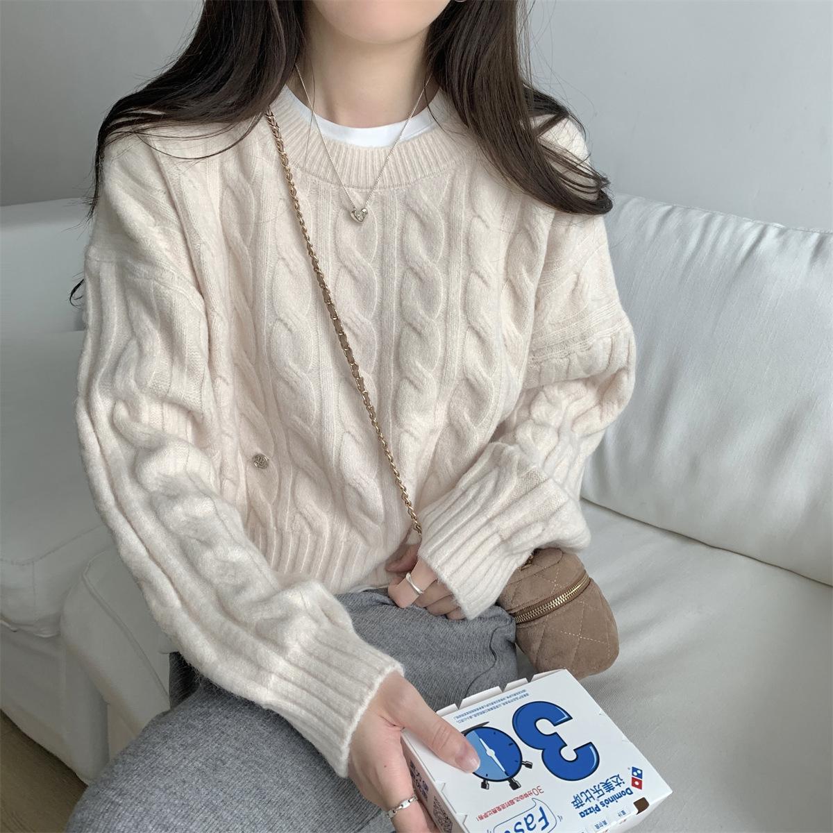 2024秋冬时尚新款圆领麻花针织衫上衣内搭慵懒软糯女毛衣外套女装