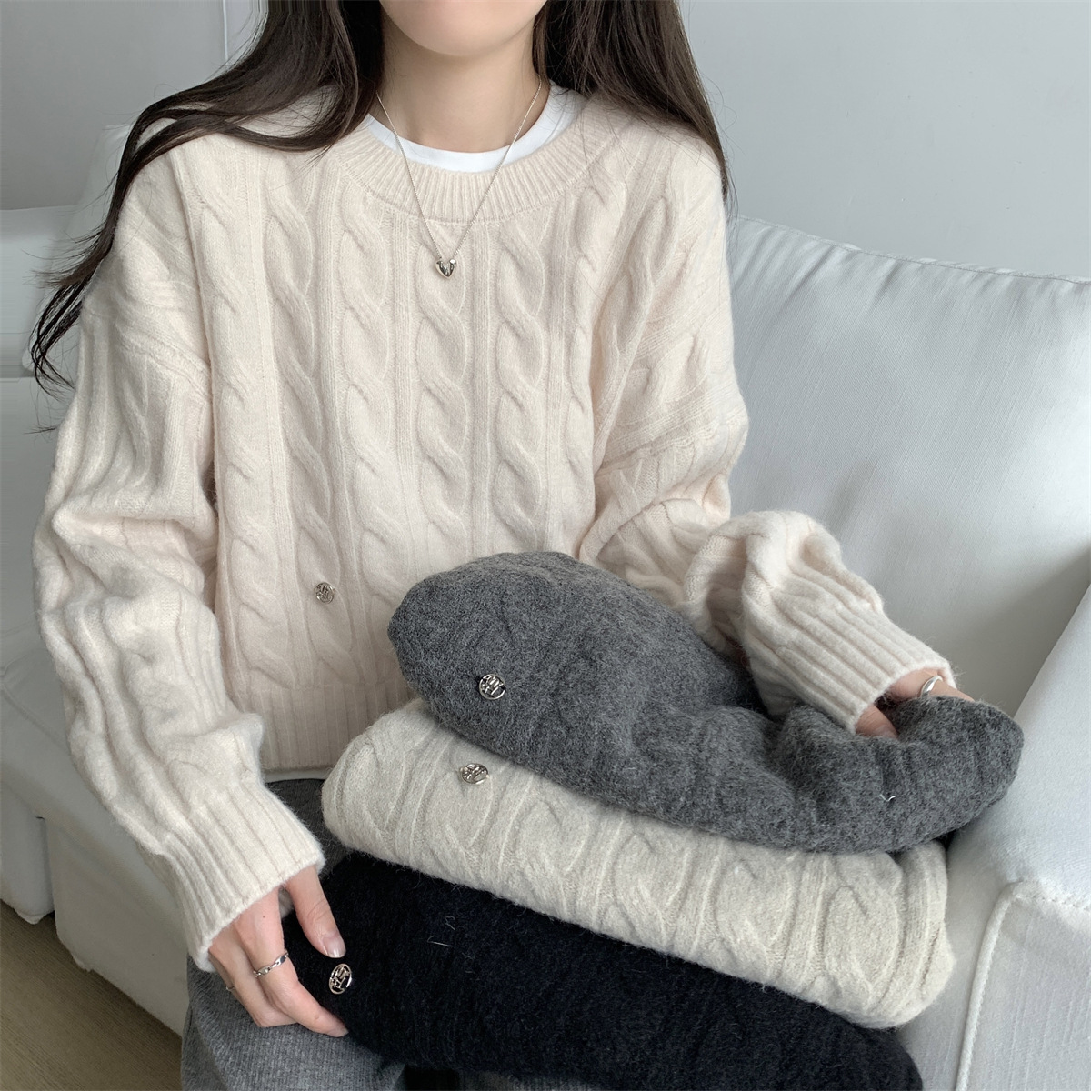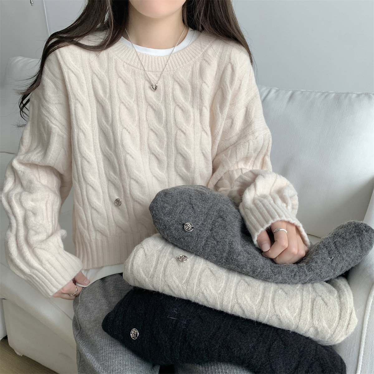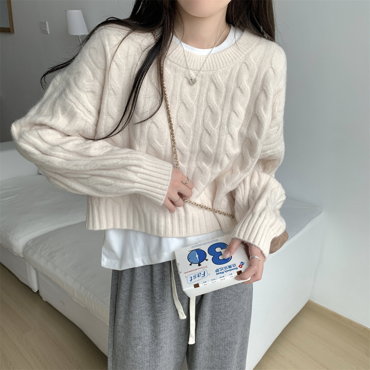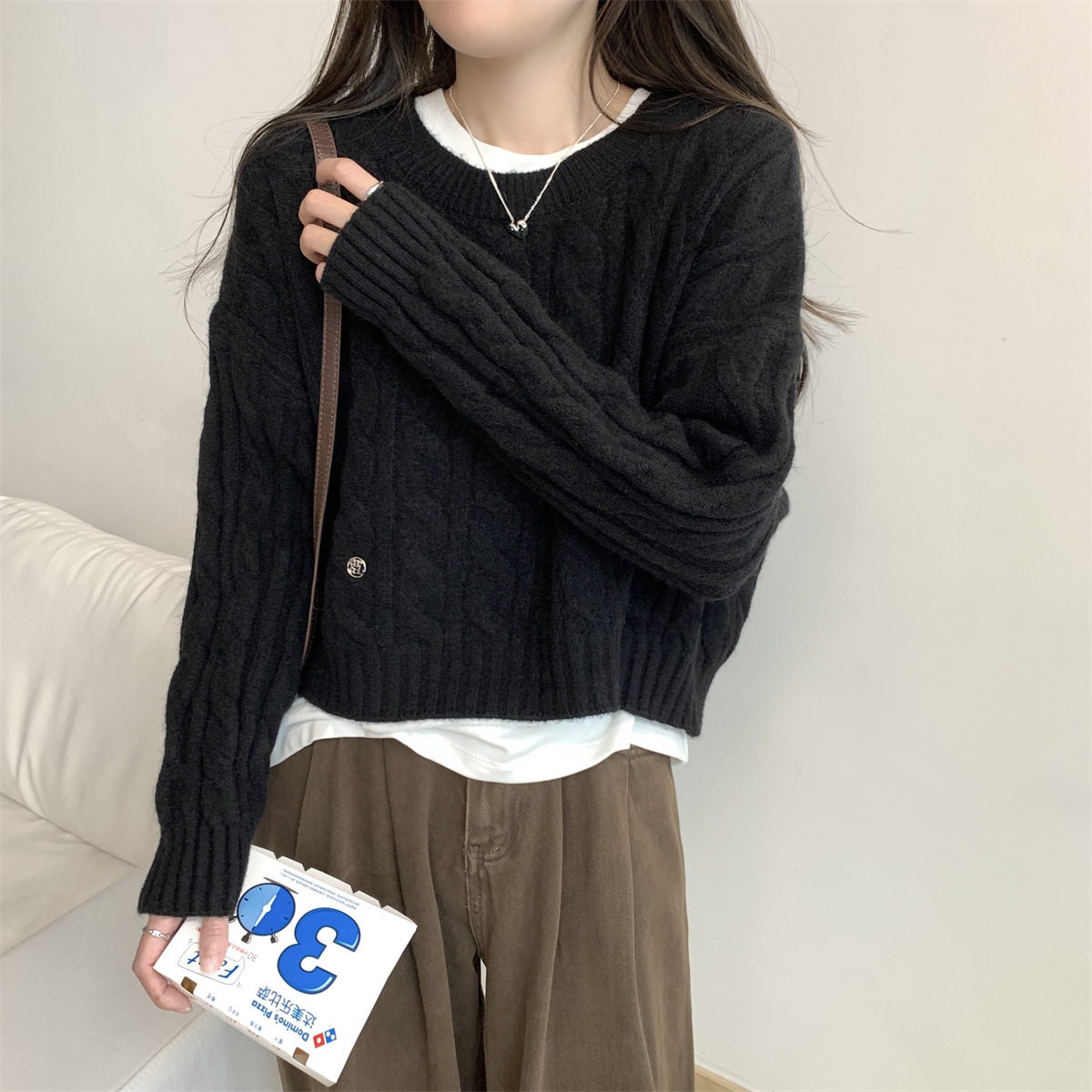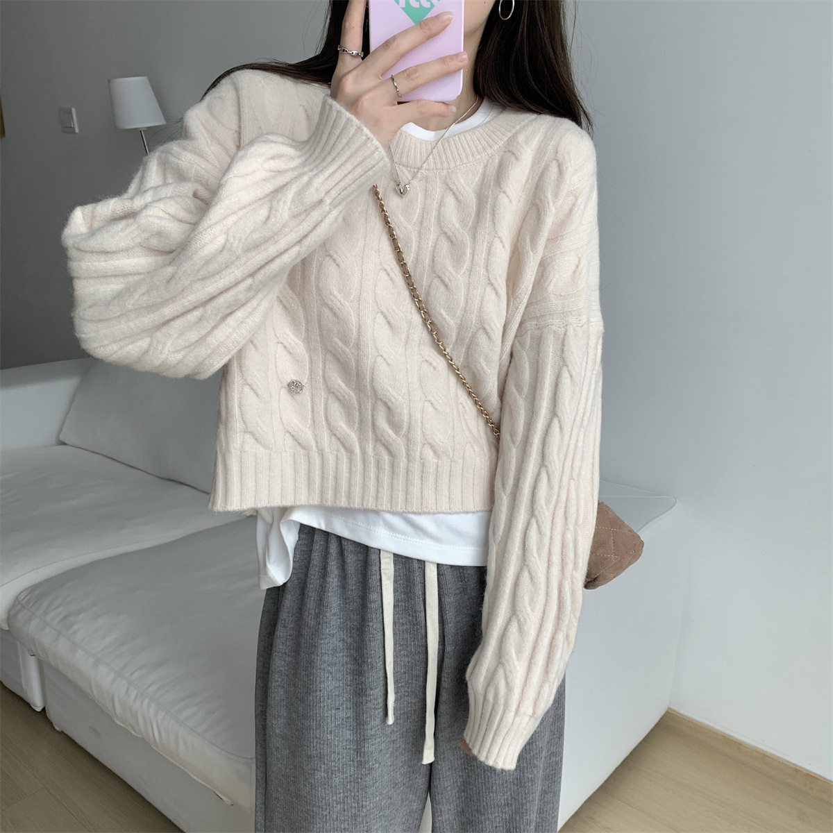 2024秋冬时尚新款圆领麻花针织衫上衣内搭慵懒软糯女毛衣外套女装