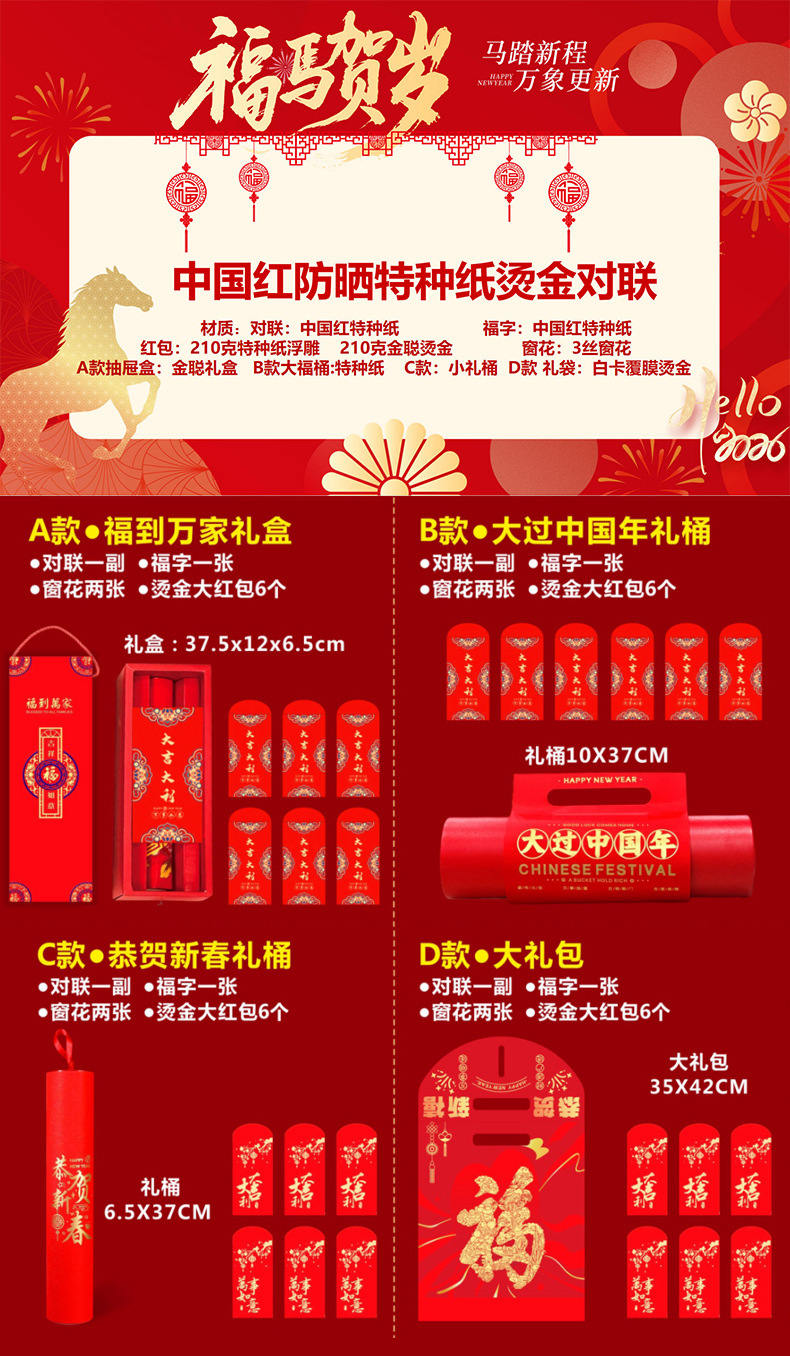 2026马年新春对联福字过年大礼包烫金广告定制lg春节春联红包现货
