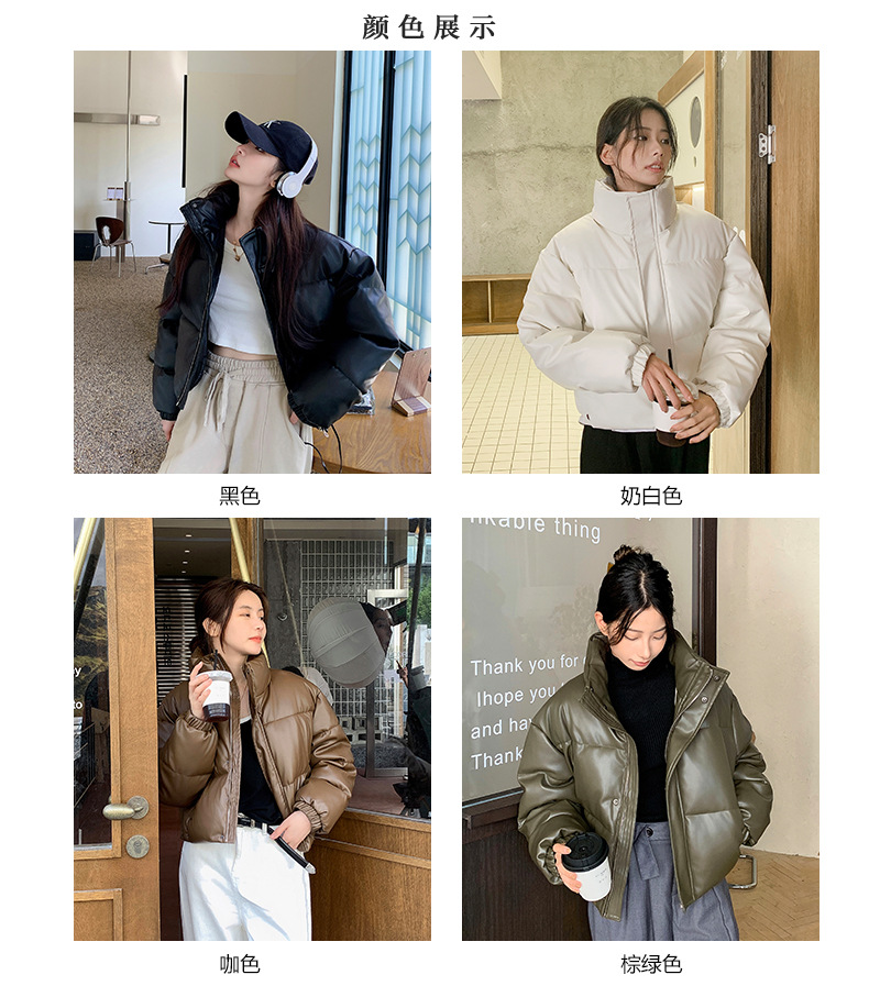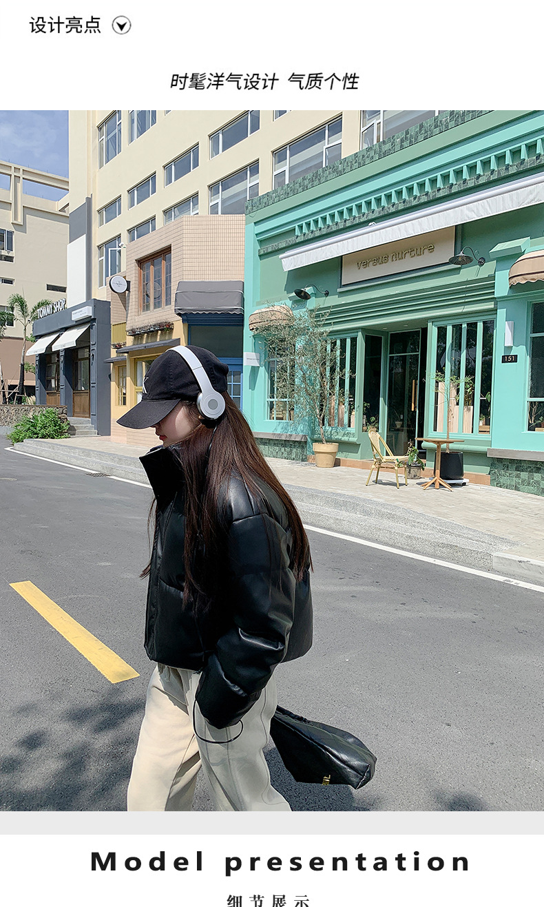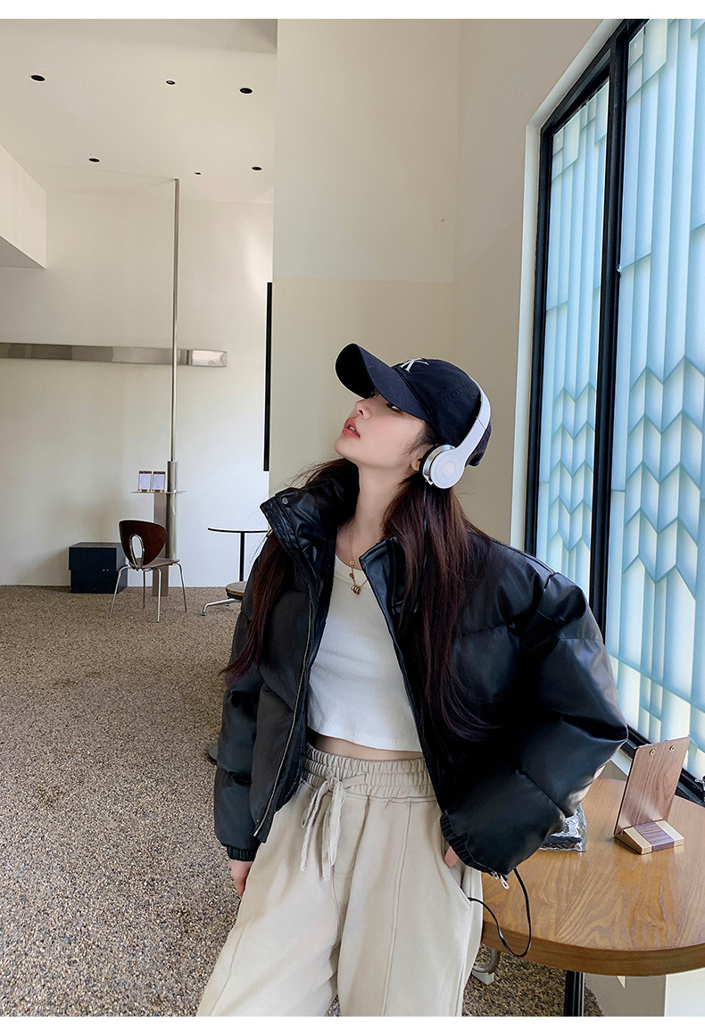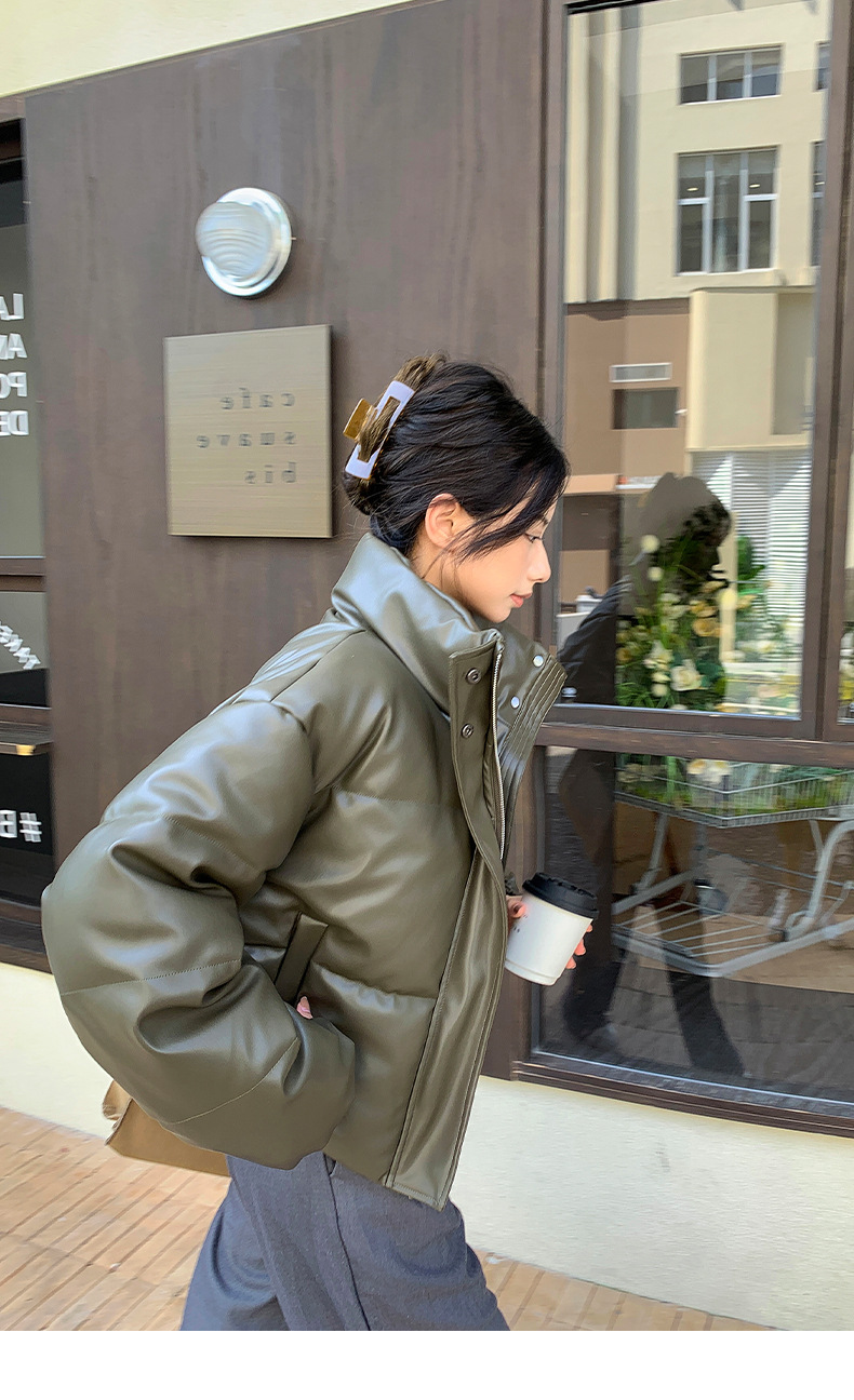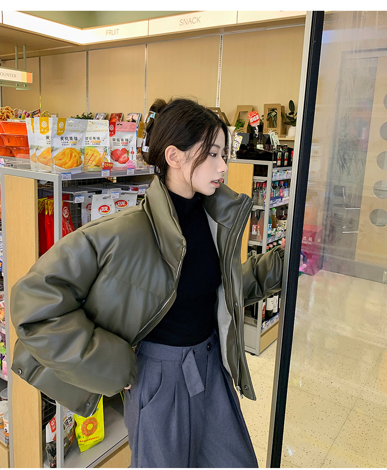 中欧美新短款2024小个子立领羽绒棉服女PU皮加厚棉袄棉衣外套潮流