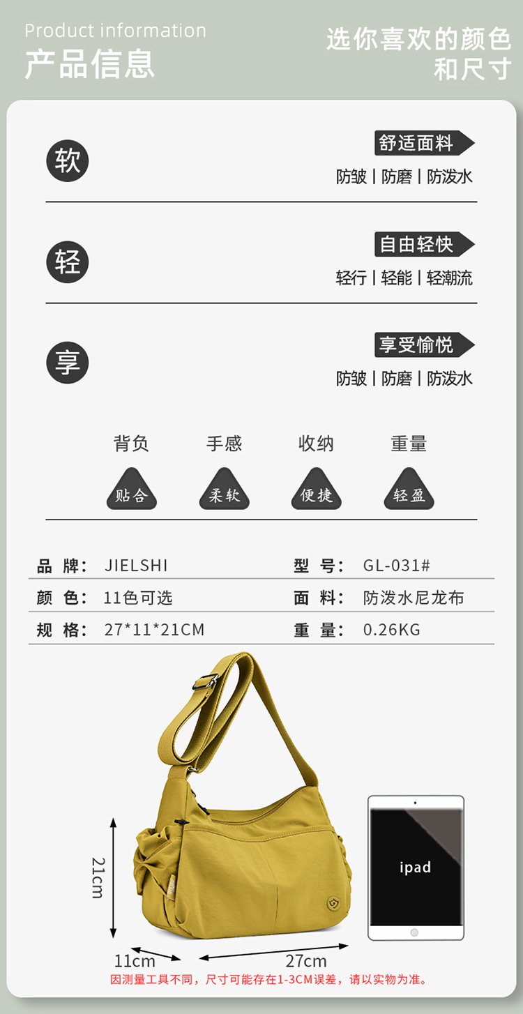 轻便防泼水尼龙布包潮流通勤背包大容量女士单肩包休闲逛街斜挎包