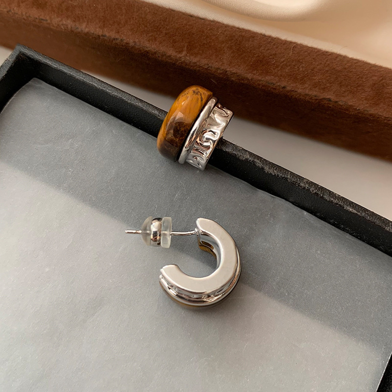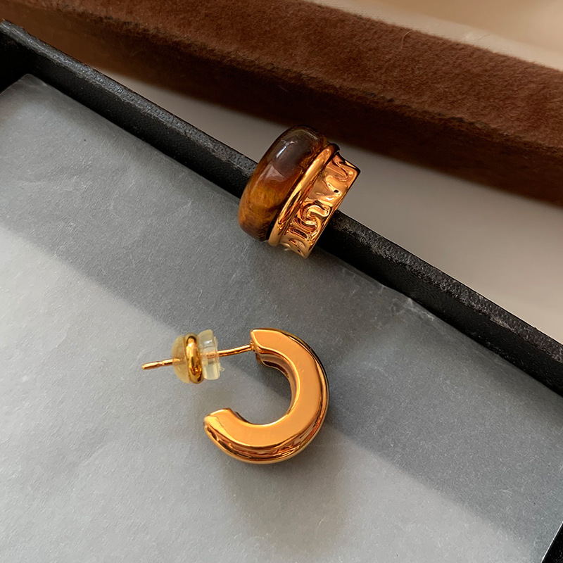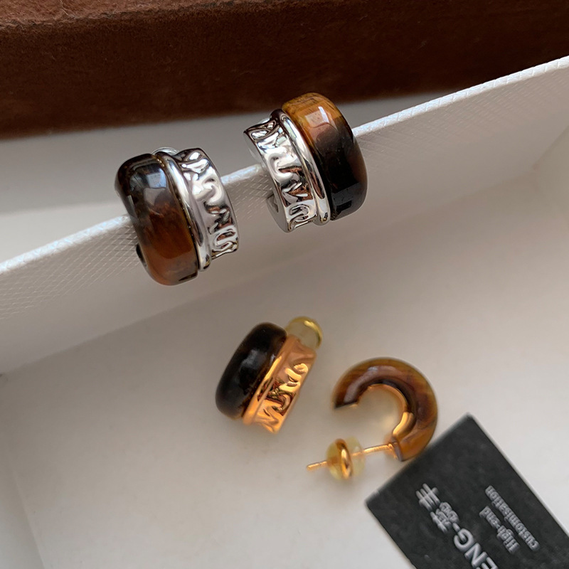 高端复古轻奢高级感耳环耳饰S925银针美拉德虎眼石金色双环耳圈女