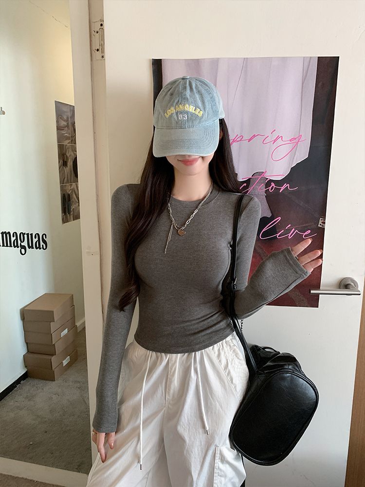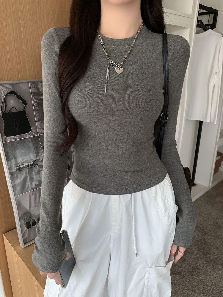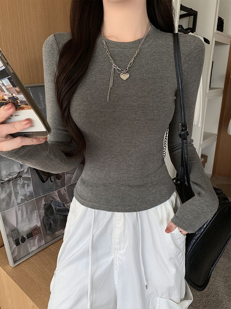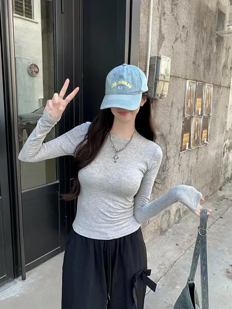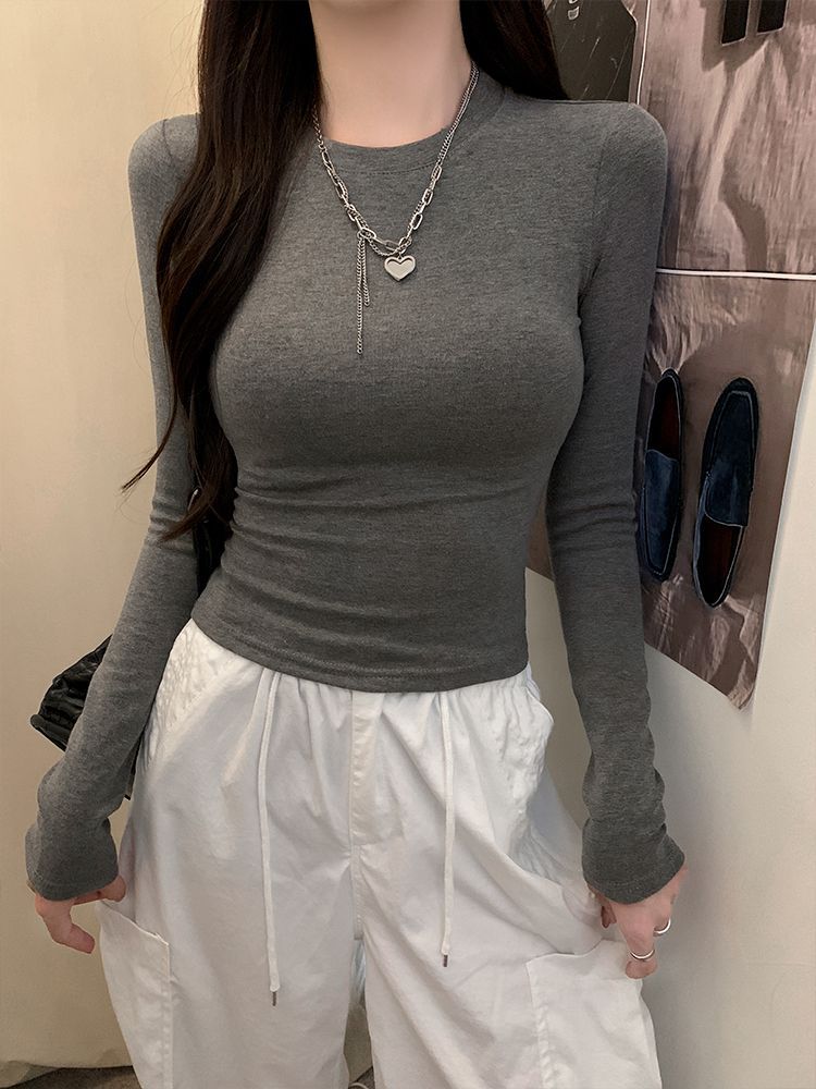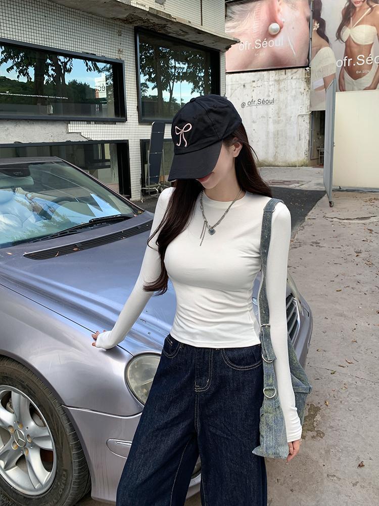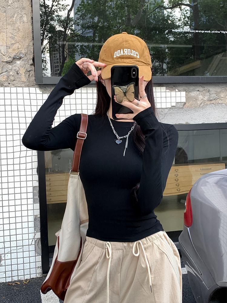 2025新款辣妹掐腰长袖T恤女春秋修身显瘦百搭打底衫女装白色上衣