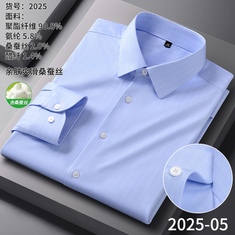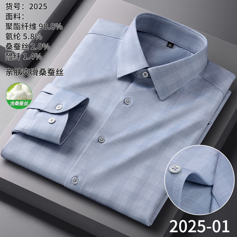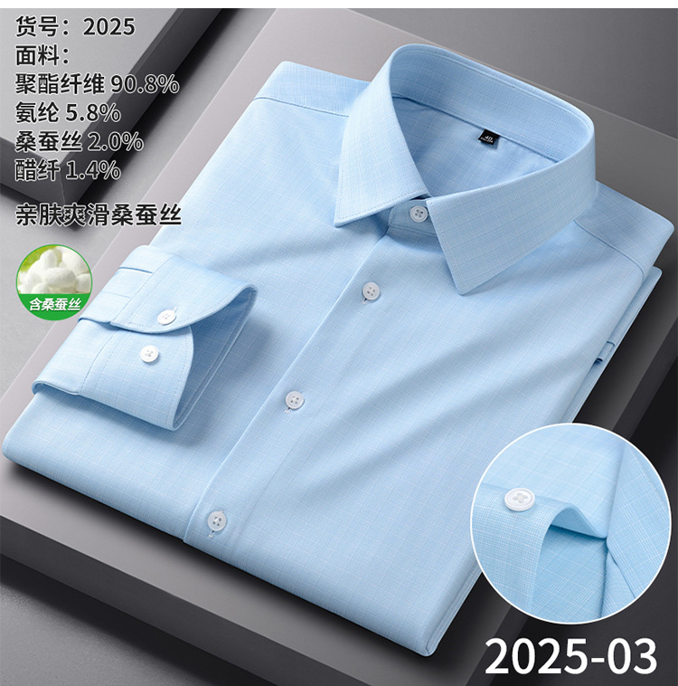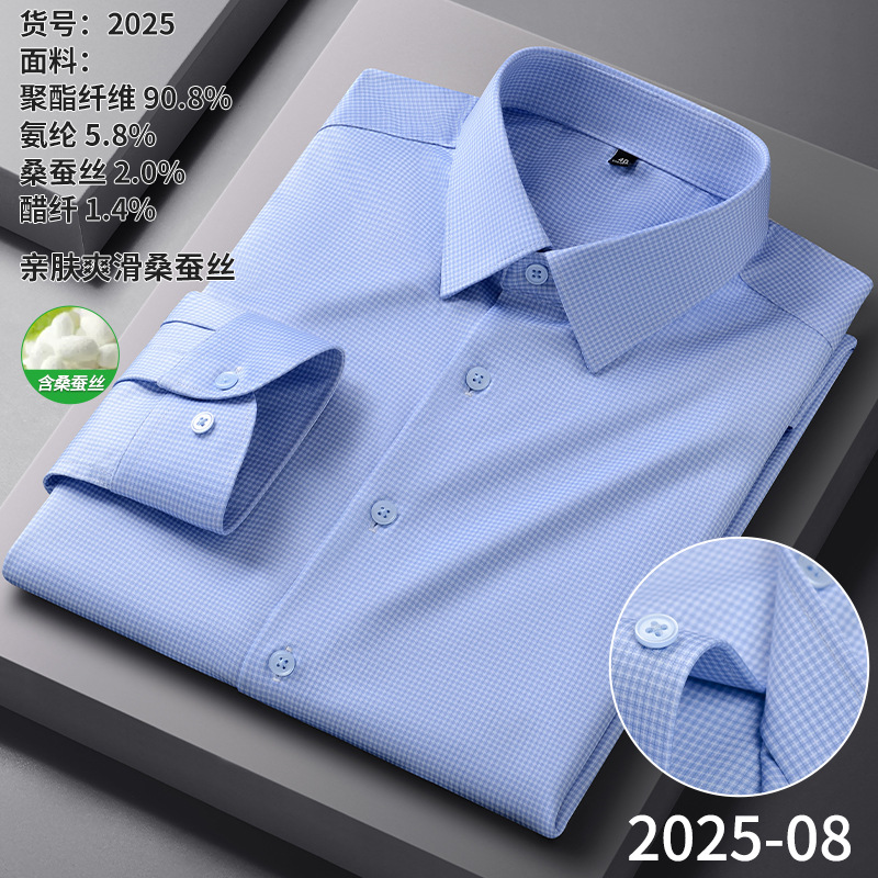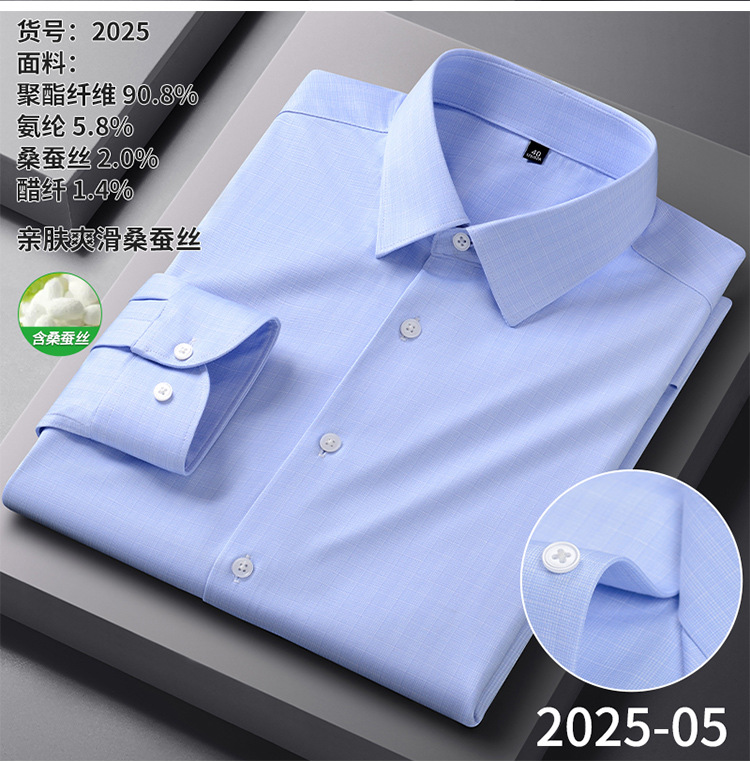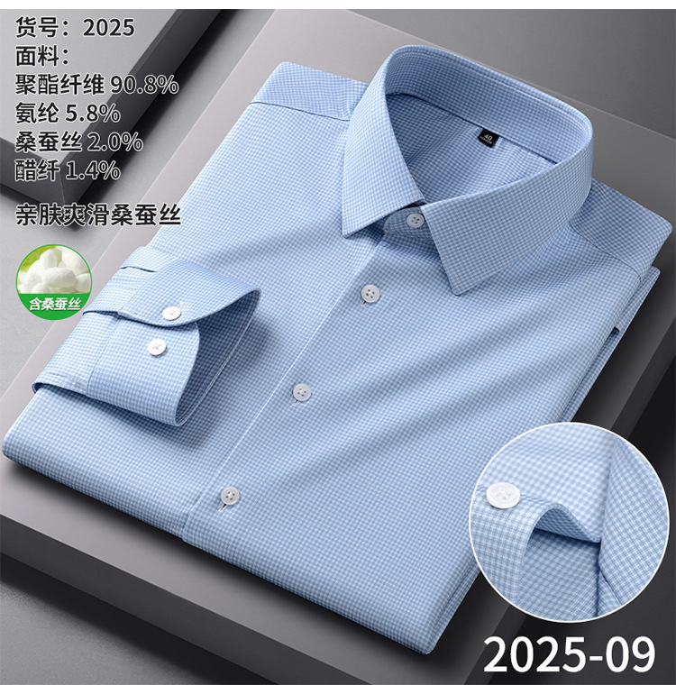 2025年高奢级格纹桑蚕丝男士长袖衬衫商务休闲免烫百搭开衫带弹力
