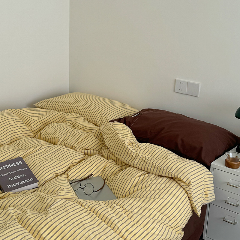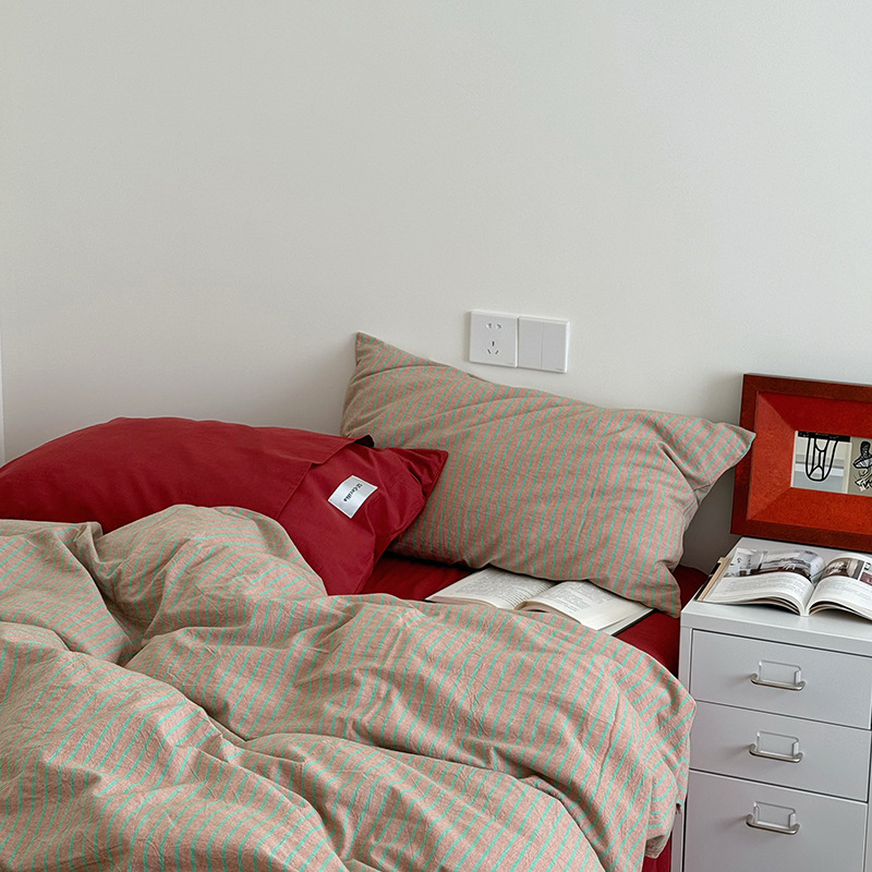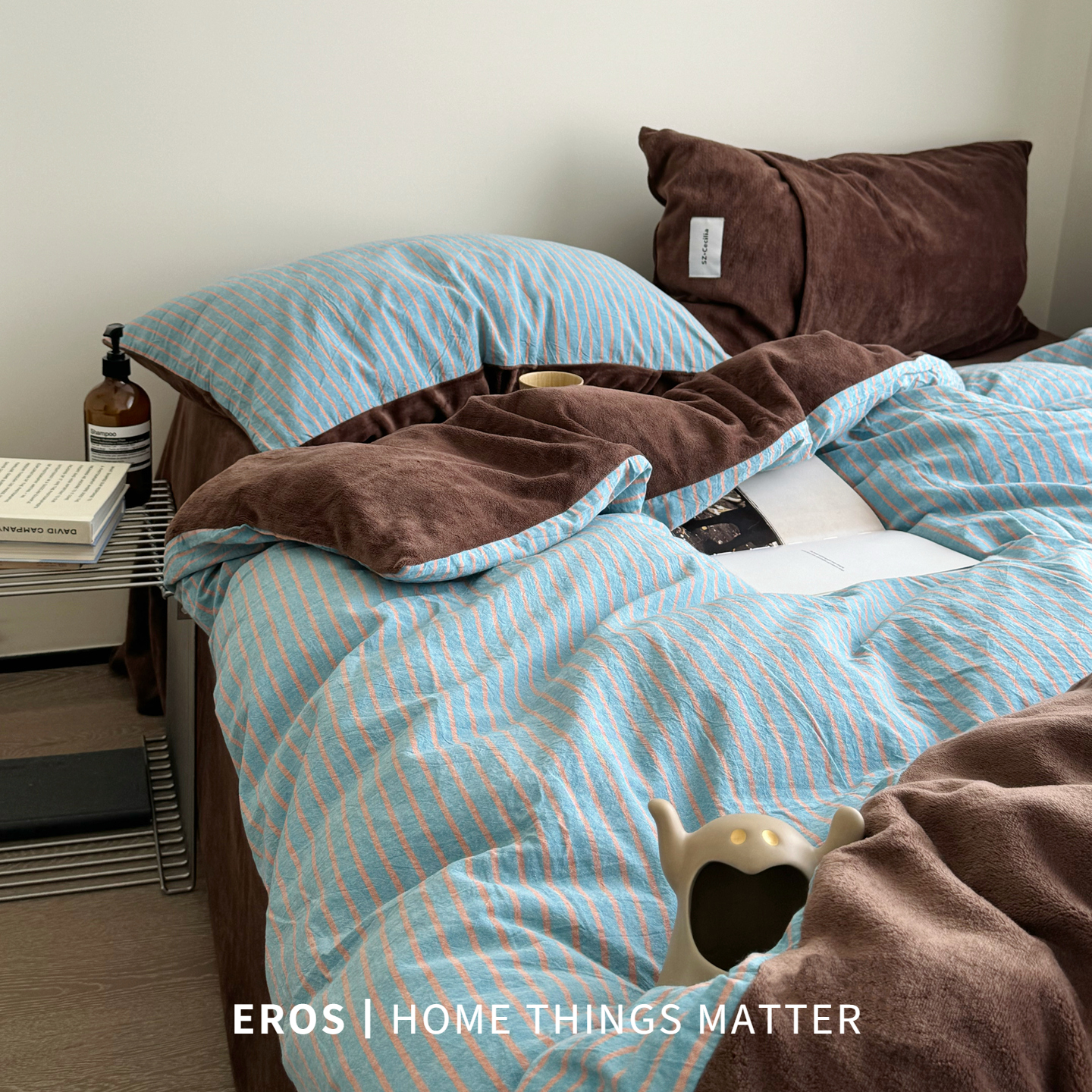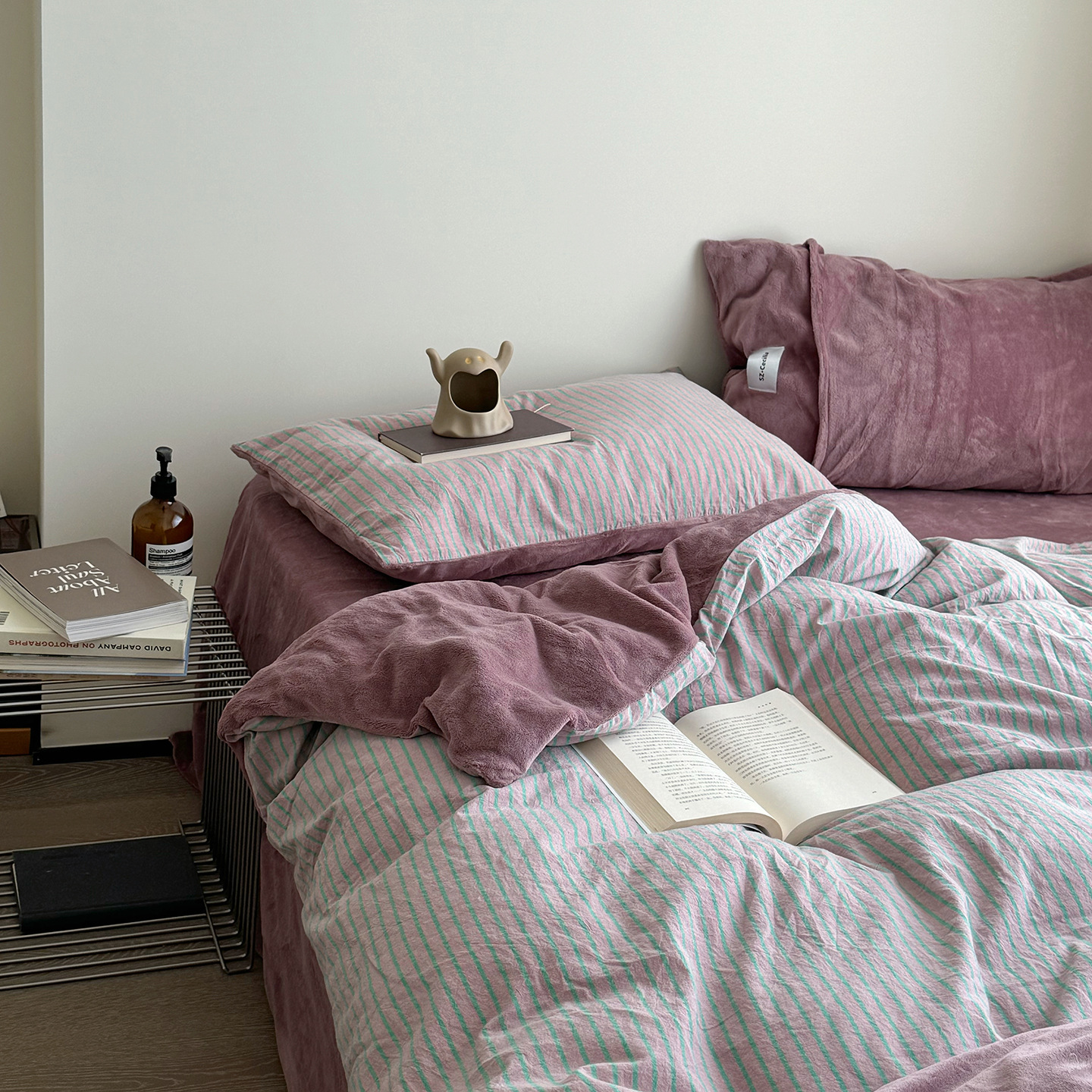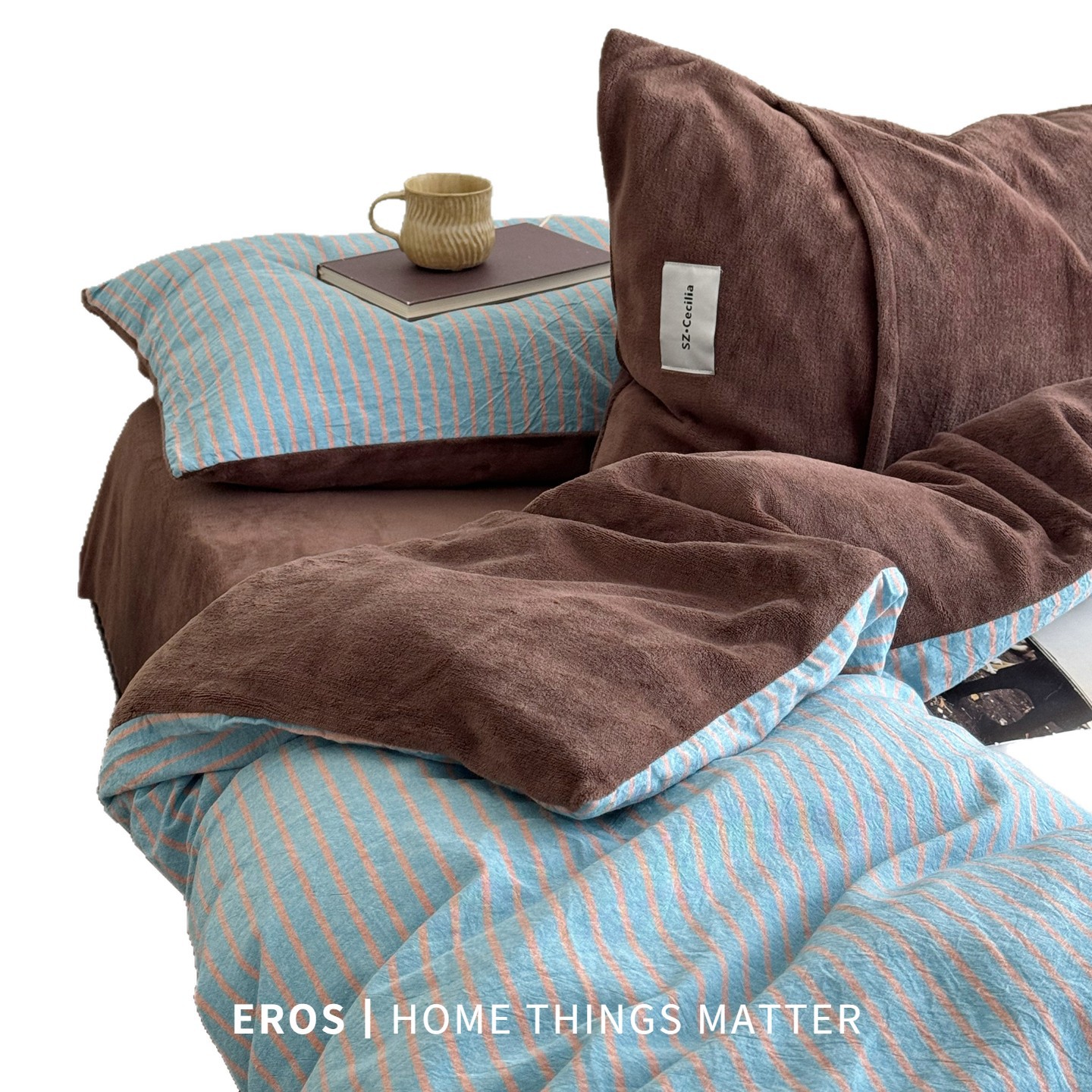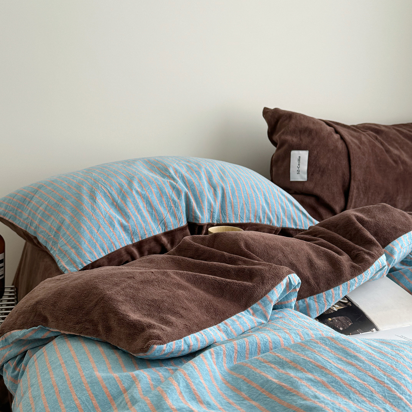 日系简约秋冬条纹复古牛奶绒四件套加厚博主风ins秋冬珊瑚绒被套