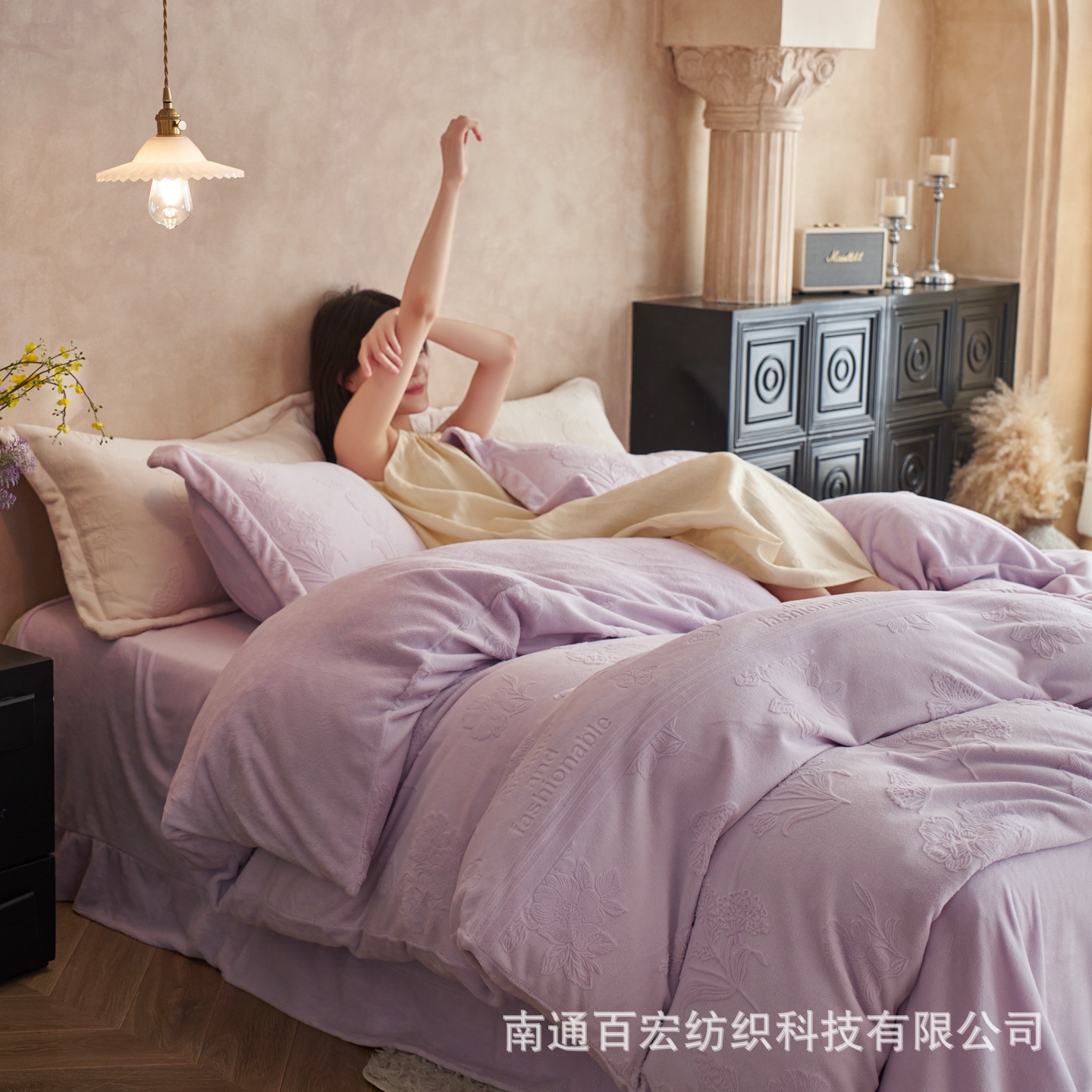 A类加厚牛奶绒雕花绒四件套冬季轻奢高级感保暖被套可裸睡绒套件
