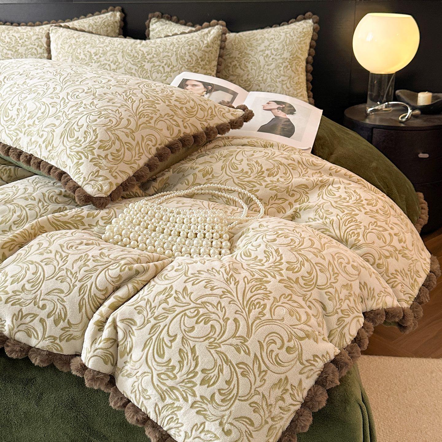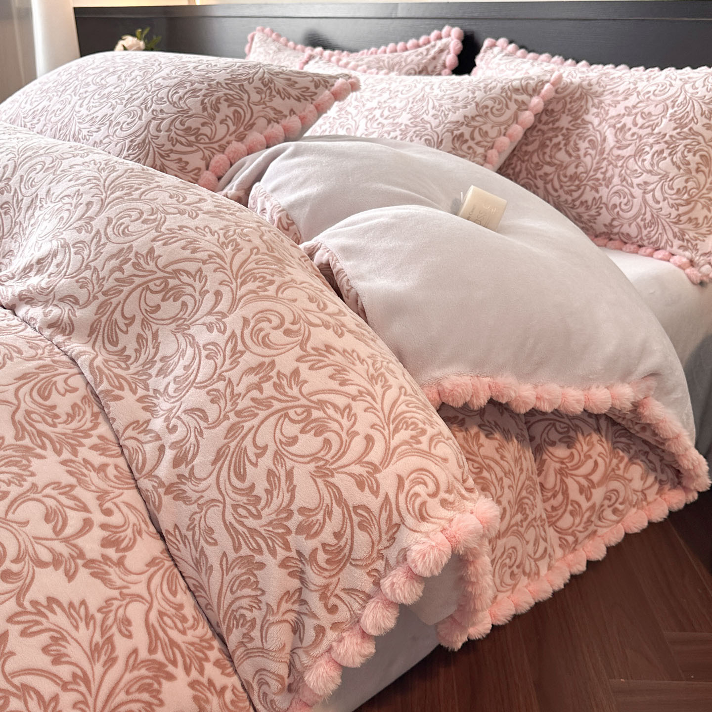 2025新款冬季加厚牛奶绒四件套轻奢珊瑚绒雕花被套床单笠床上用品
