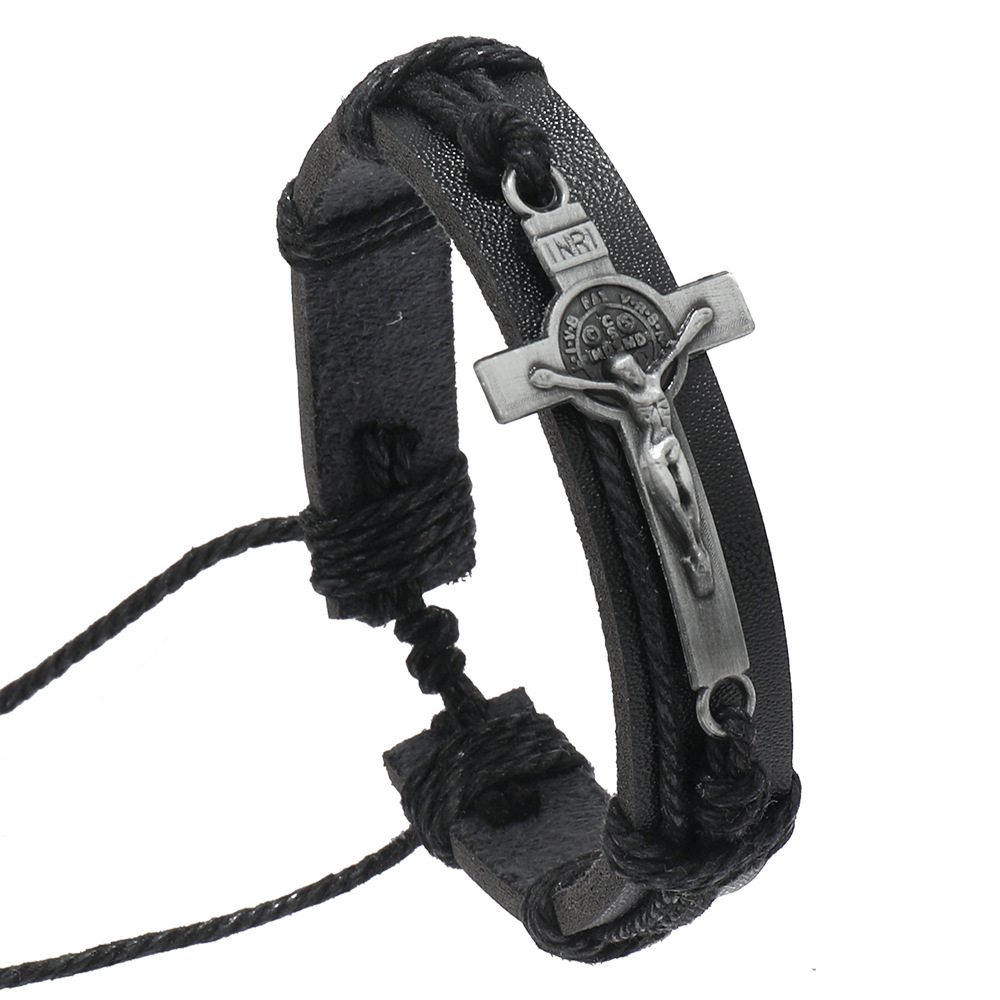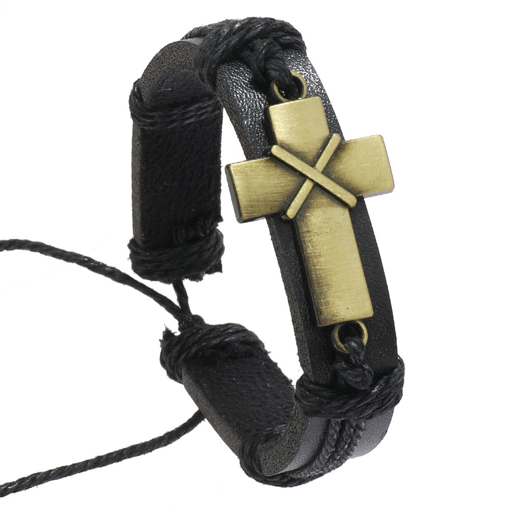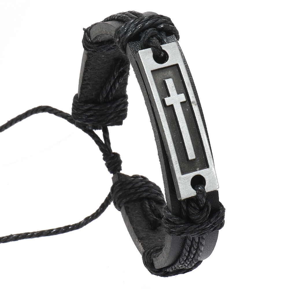 男士文艺复古十字架皮质编织手镯 跨境热卖合金可调节手链