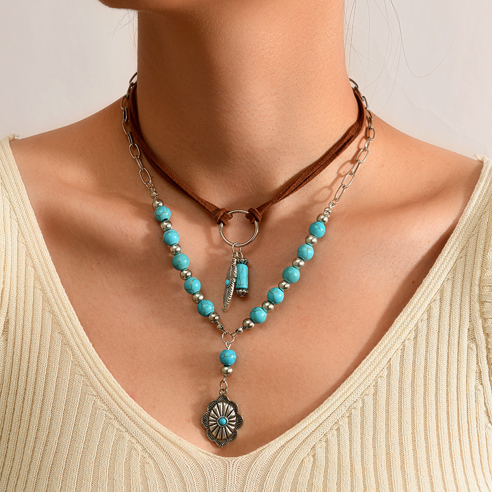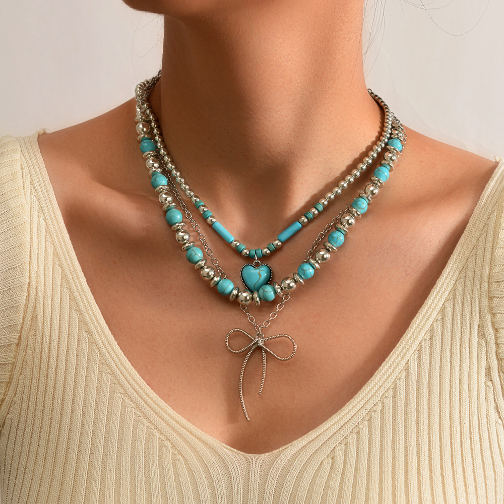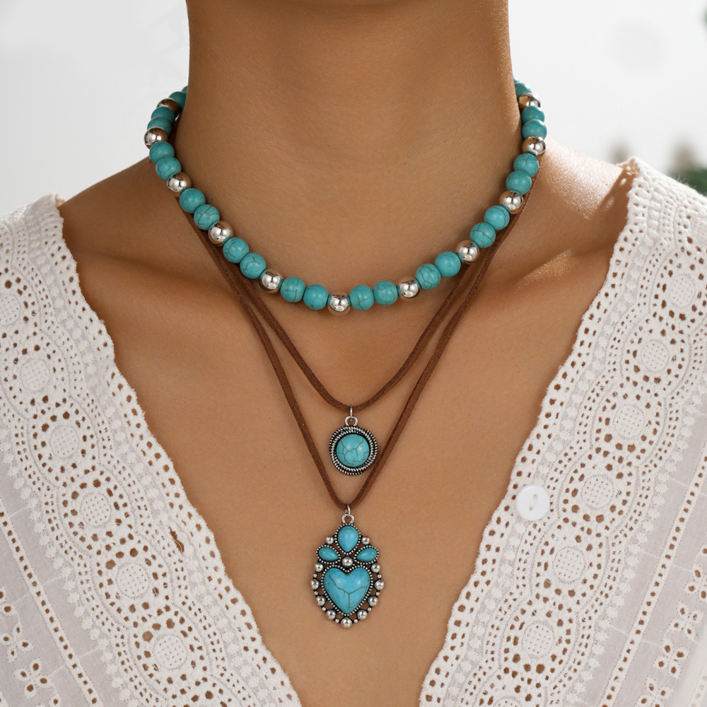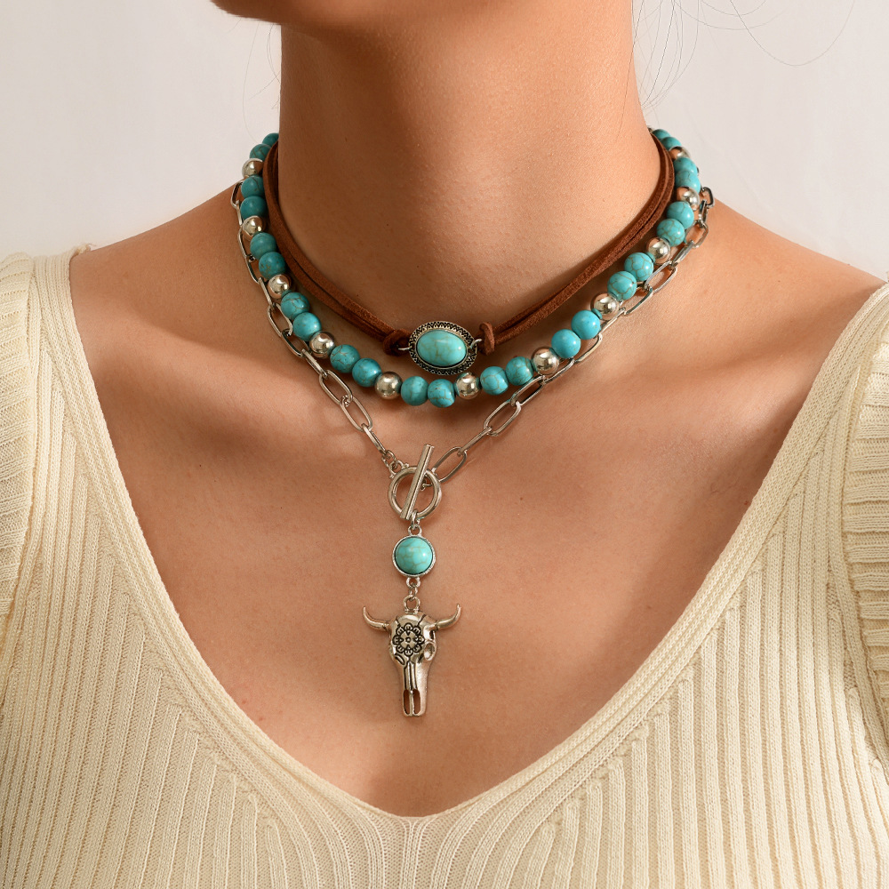 欧美跨境饰品复古仿松石锁骨链小众串珠项链套装民族风爱心牛头配