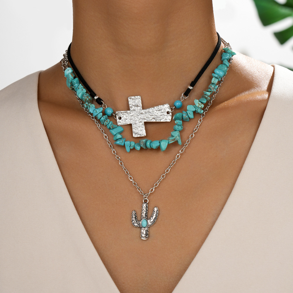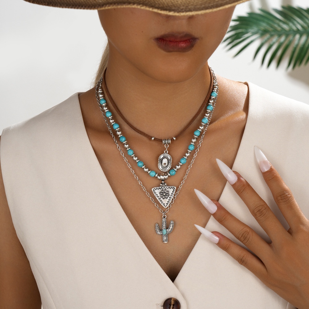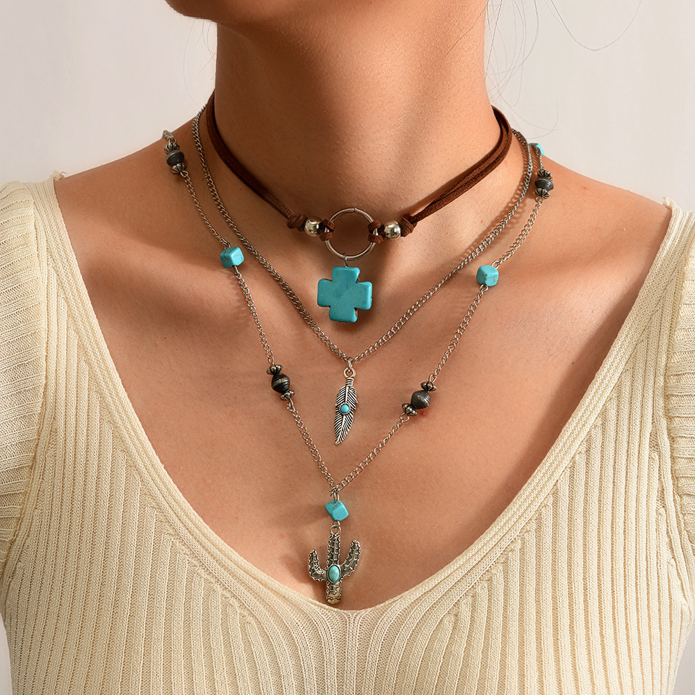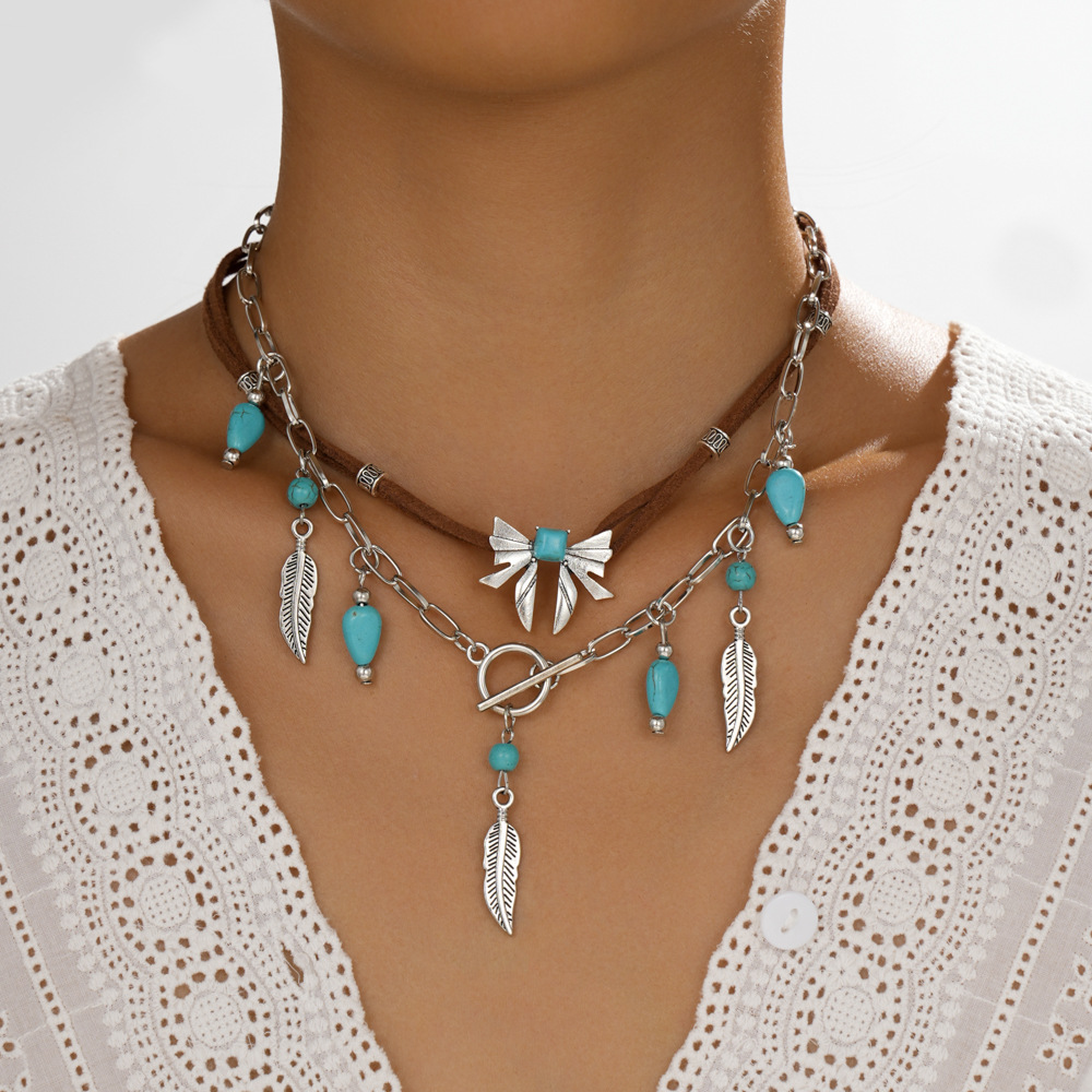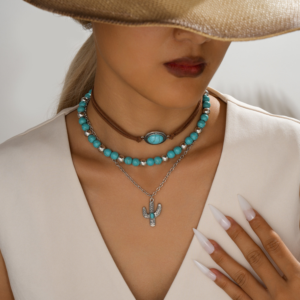 欧美跨境饰品复古仿松石锁骨链小众串珠项链套装民族风爱心牛头配