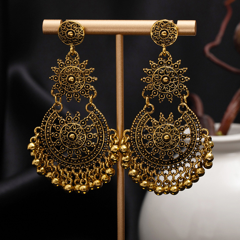 欧美跨境复古民族风波西米亚流苏耳环高级感雕花花朵半圆铃铛耳坠