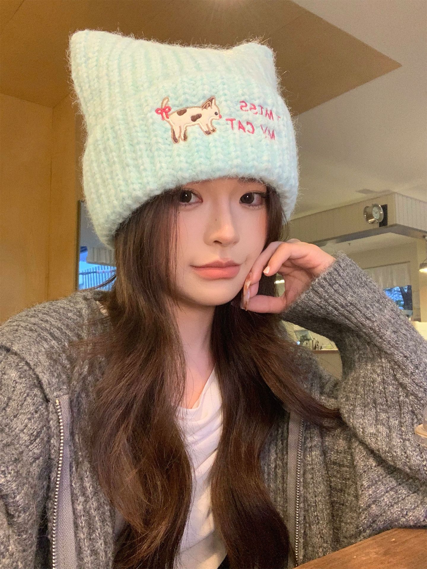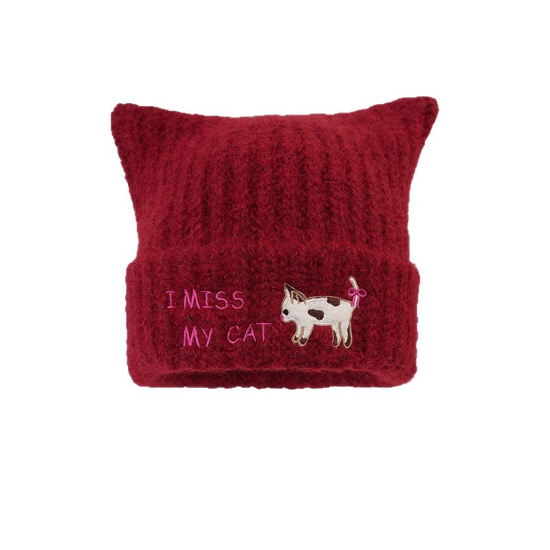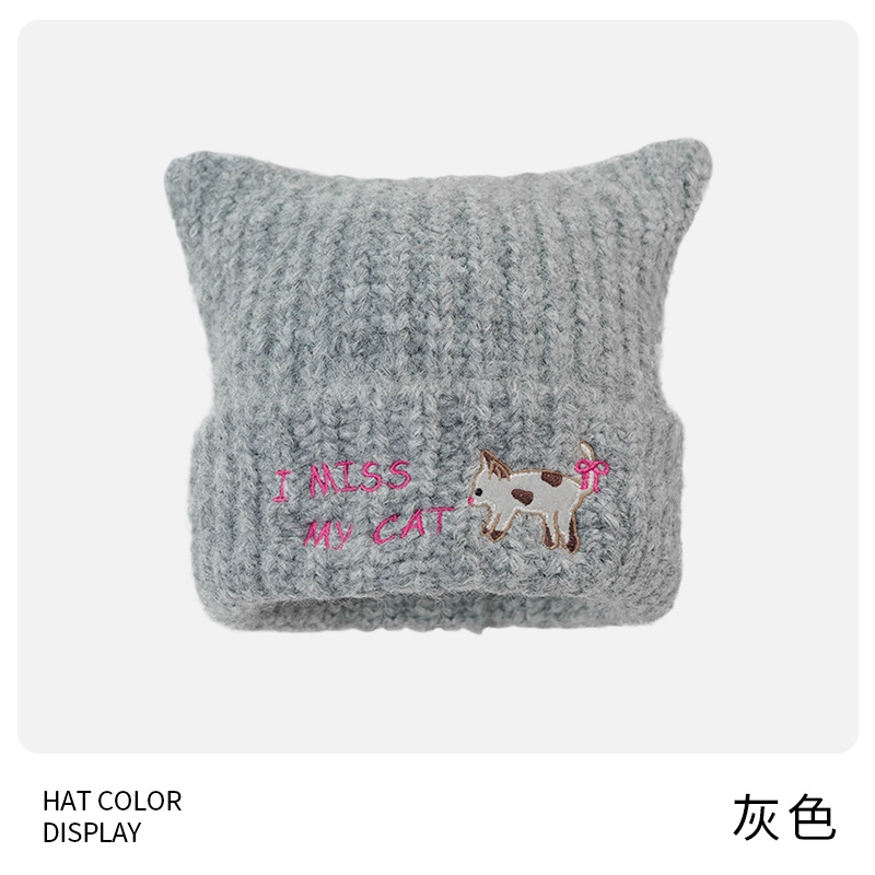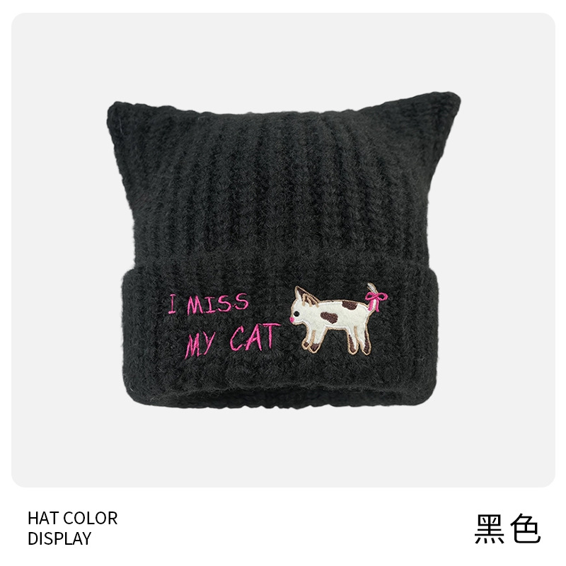 韩系可爱小猫刺绣针织毛线帽子女秋冬学生保暖百搭猫耳朵套头帽潮
