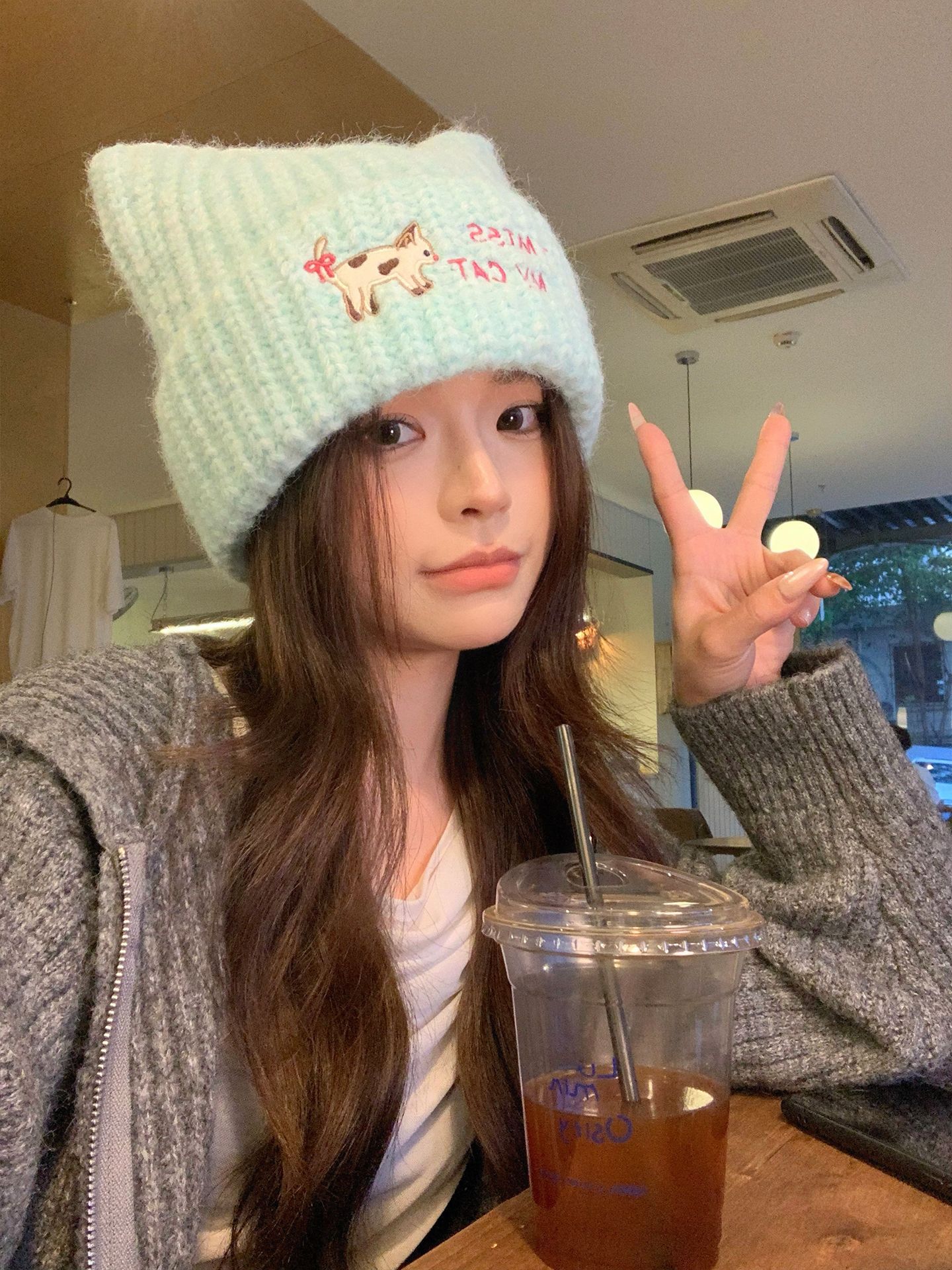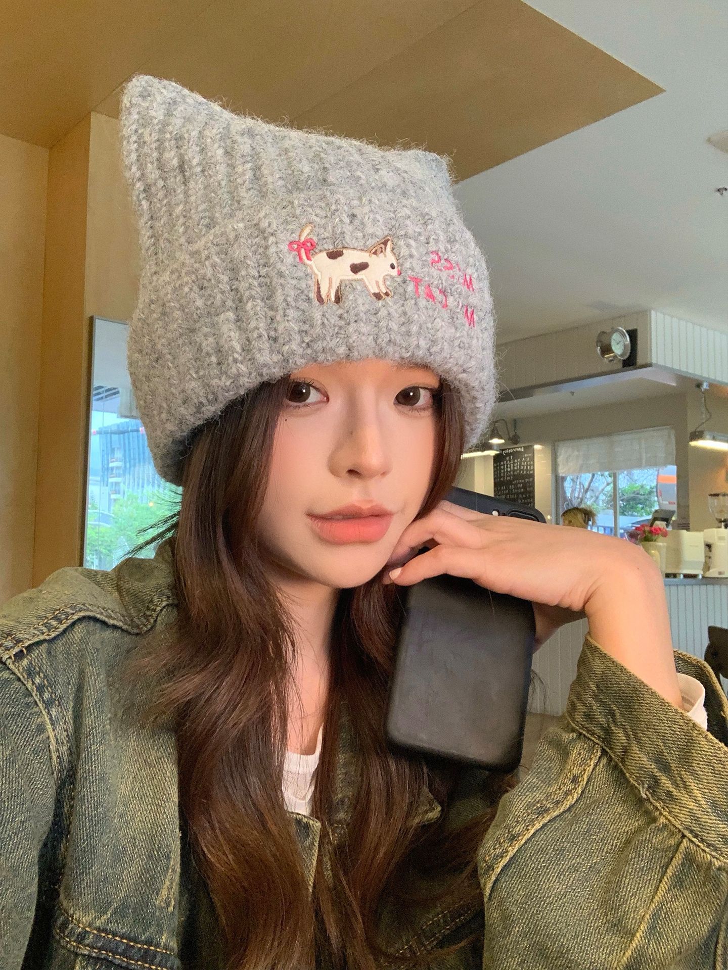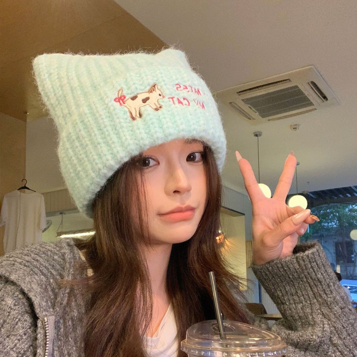 韩系可爱小猫刺绣针织毛线帽子女秋冬学生保暖百搭猫耳朵套头帽潮