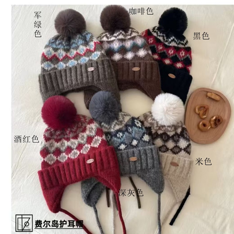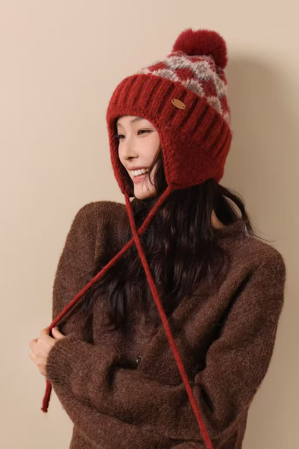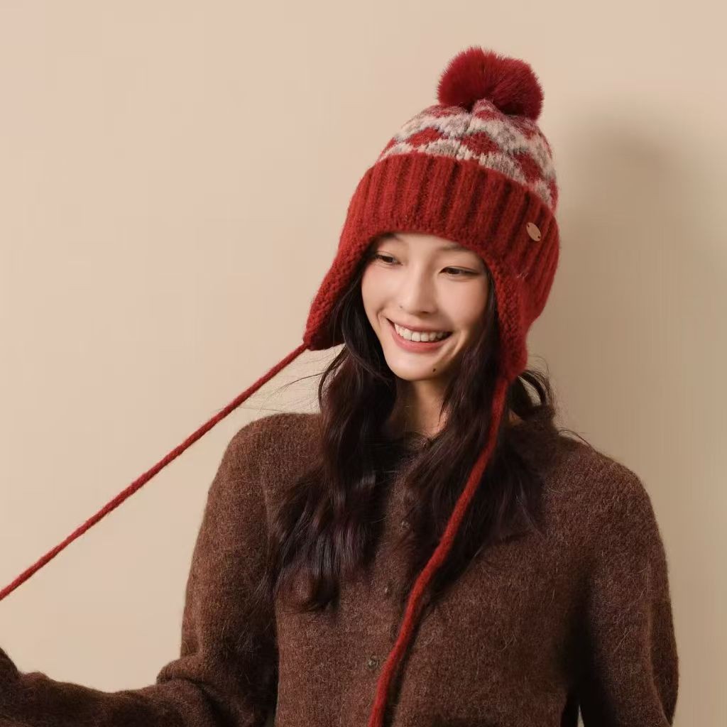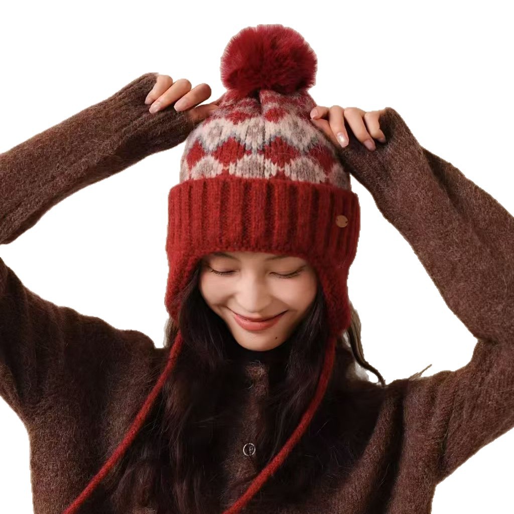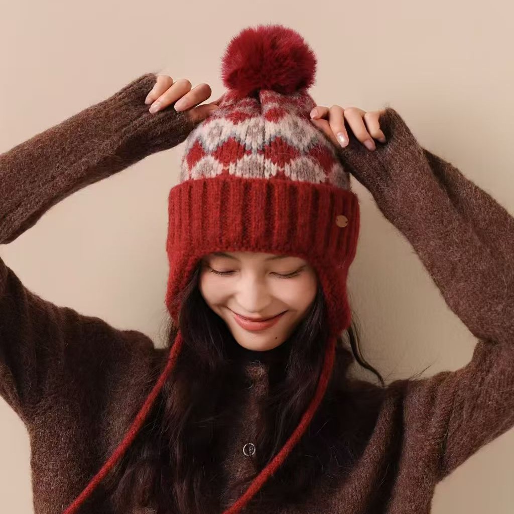 费尔岛风帽子秋冬防风保暖针织毛线帽男女红色加厚骑车护耳雷锋帽